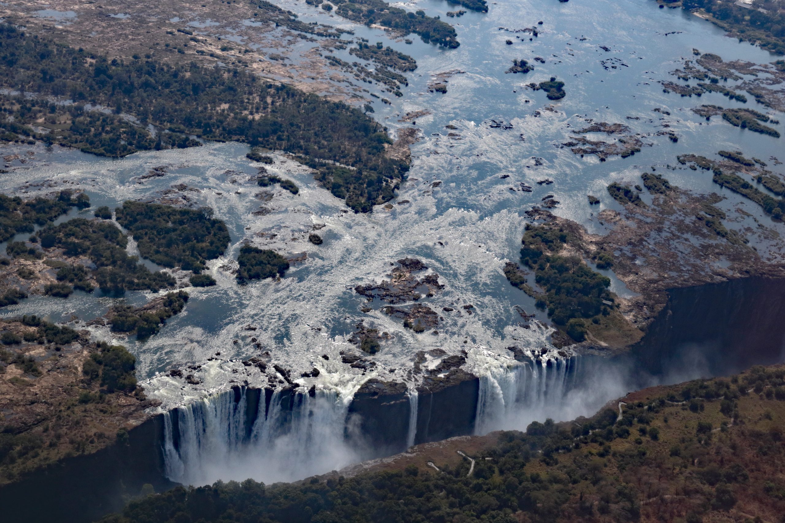 The Victoria Falls are a waterfall on the Zambezi River on the border between Zambia and Zimbabwe. It is one of the world’s largest waterfalls with a width of more than 1,708 m and a height of 108 metres.