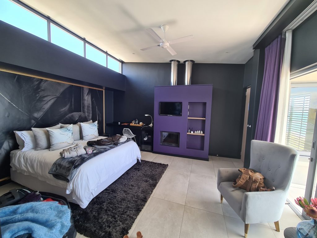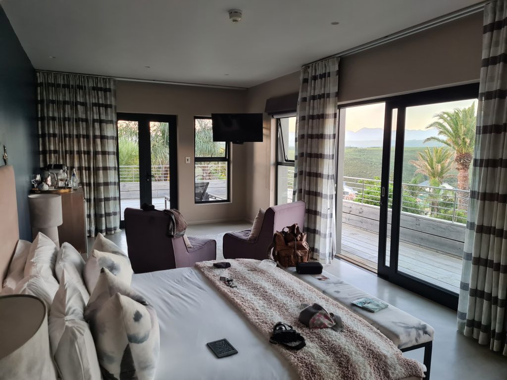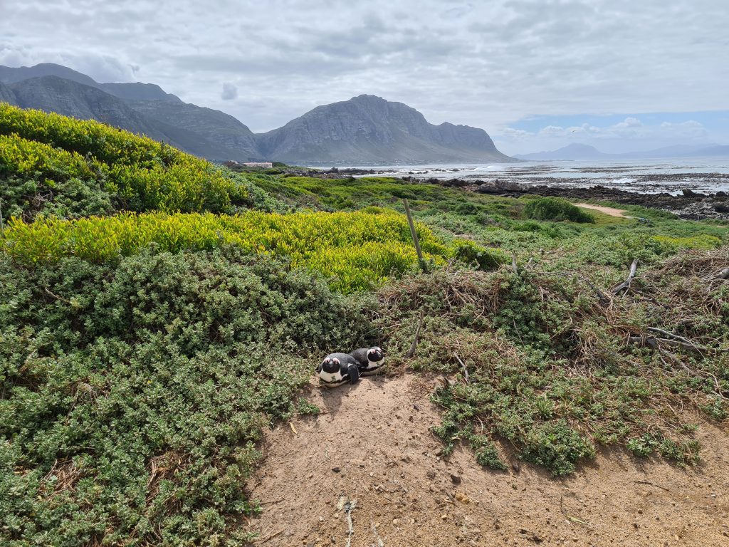 So erreichen wir Capetown nicht gerade fit und ausgeruht um 7:30 Uhr in der Früh. Nichtsdestotrotz läuft im Flughafen alles nach Plan, die Koffer sind da und die Immigration dauert auch nicht lange. Europcar ist auch nicht weit weg, ist ohne Shuttle zu erreichen, wobei der Weg dorthin nicht gerade einladend ist. Die Übergabe verläuft auch problemlos, wir bekommen leider aber keinen Hilux, sondern einen Isuzu und die Information, dass man die Straßen durch die Townships auf dem Weg zum Kap der guten Hoffnung doch besser meiden solle. Wir hatten vorsichtshalber gefragt, da Google Maps auf der sicheren Route Stau anzeigt hatte. Stony Point mit seinen Pinguinen ist damit unser erstes Ziel. Mit dem erhofften strahlenblauen Himmel kann aber sowohl Kapstadt als auch Stony Point nicht dienen. Die weltbekannten Pinguine Südafrikas beeindrucken uns natürlich auch, die große Begeisterung bzw. Urlaubseuphorie kommt aber wetter- und müdigkeitsbedingt nicht auf. Recht lang halten wir uns dort nicht auf, auch wenn wir nur 100 km zu unserem ersten Hotel – Romans Villa – zu fahren haben. Kurzfristig überlegen wir bis zum Kap Agulhas zu fahren, allerdings fallen uns beim Fahren immer öfter die Augen zu. Eigentlich wäre die Straße entlang am Meer wunderschön gewesen, wenn das Wetter sich von seiner schönsten Seite gezeigt hätte und wenn wir ausgeruhter gewesen wären. Romans Villa – in einer gated community gelegen – empfängt uns mit offenen Armen und jetzt mit kaum noch Wolken am Himmel. Eigentümer sind zwei Holländer, die sich hier vor ein paar Jahren niedergelassen haben und ihren Traum erfüllt haben. Unser Zimmer ist im 1. Stock, ist wunderschön und man hat einen tollen Blick auf’s Meer. So ganz wohl fühlen wir uns jedoch nicht, irgendwie fühlen wir uns einfach zu „nahe“ an der Gastgeberfamilie mit wenig Möglichkeit, unbeachtet die schöne Umgebung zu genießen. Gott sei Dank können wir die beiden Besitzer überzeugen, dass wir am nächsten Morgen früher frühstücken können als es dort üblich ist. Im Zimmer angekommen wechseln wir schnell von der Winterkleidung auf die Sommersachen – und schlafen am Balkon ein. Dann nutzen wir die moderne Kaffeemaschine samt Espressokapseln, um die letzte Müdigkeit zu vertreiben, und gehen hinunter zum Meer. Abends gehen wir noch zum Dinner – es gibt Fisch und Rotwein und ein warmes, wirklich gutes Applecrumble.
