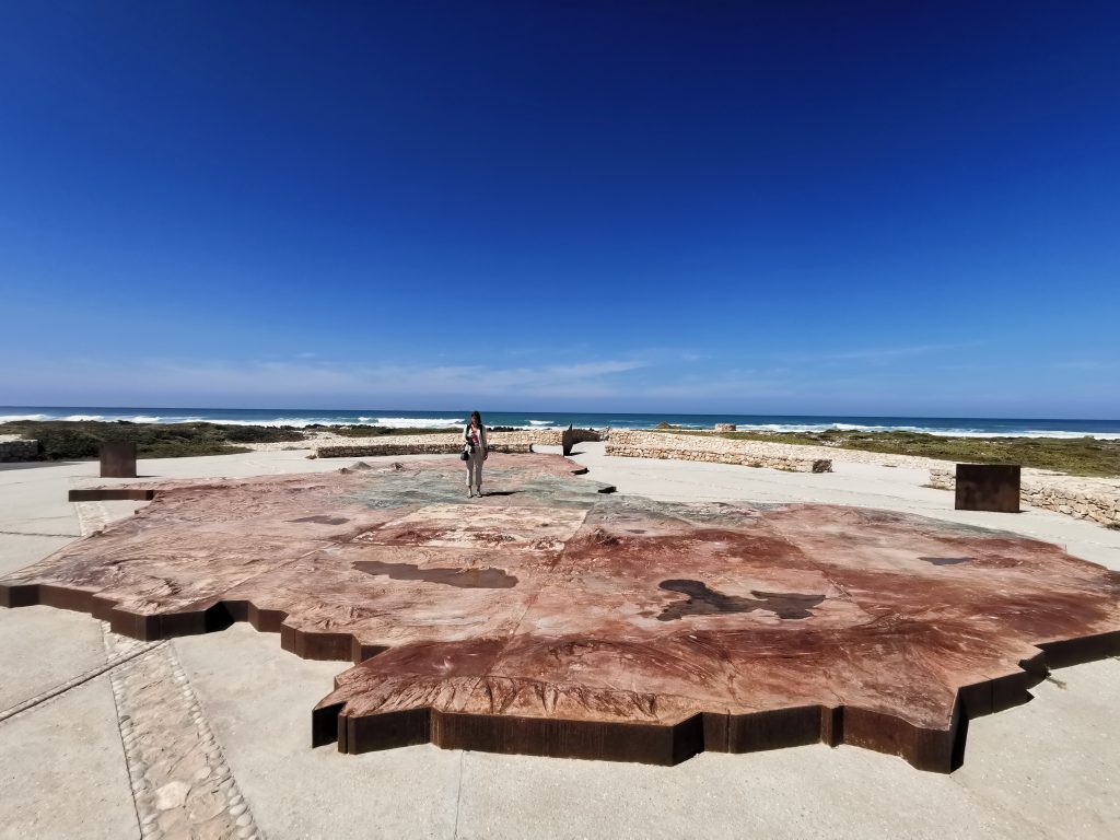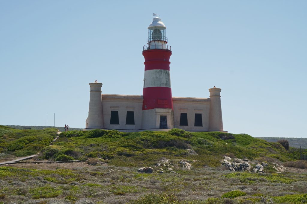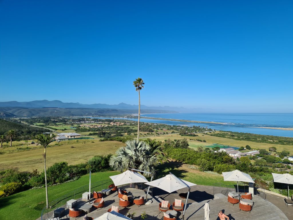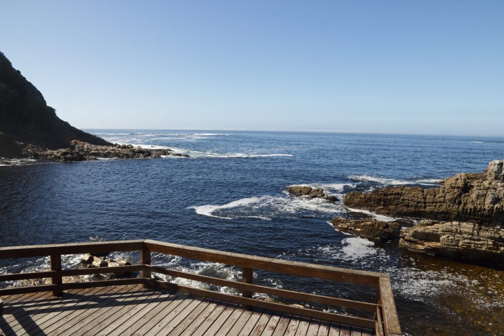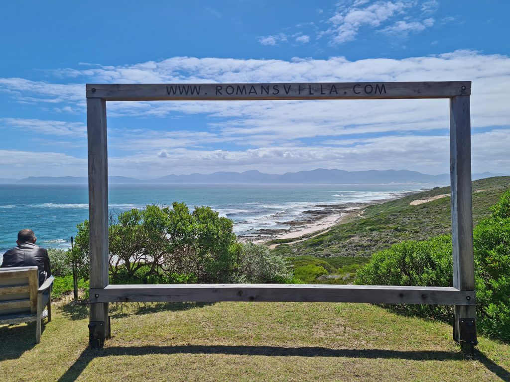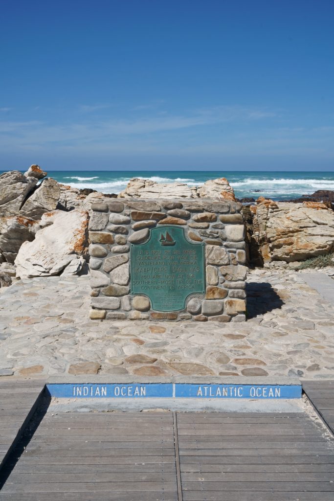 Der Tag beginnt mit schönem Wetter und einem sehr guten Frühstück incl. warmem Kaiserschmarren auf der Terrasse. Wir sind noch die ersten Gäste und sind nun auch in der Lage diesen Urlaub, der so streikbedingt für so viel Ärger gesorgt hatte, zu genießen. Unser Endziel heute ist die Plettenberg Bay, Zwischenziel ist das Kap Agulhas. In Erinnerung bleiben uns auf dem Weg dorthin die erste unpaved road und der malerische Ort Elim. Kap Agulhas ist der südlichste Punkt des afrikanischen Kontinents, mit einem recht steinigen Ufer und fest in deutscher Hand, denn nahezu jede Stimme, die wir vernehmen, klingt eindeutig nach good old Germany. Wir fotografieren das Hinweisschild mit der Information, dass hier der Atlantik und der Indische Ozean aufeinandertreffen bzw. die silhouettenhafte Darstellung des Kontinents wenige Meter hinter der Uferlinie. Auch hier fällt under Stopp recht kurz aus, denn mehr als 400 km liegen noch vor uns bzw. warnt uns Google Maps vor Geschwindigkeitskontrollen. Es mag zwar heißen, der Weg sei das Ziel, landschaftlich bietet unsere Route wenig, was wirklich im Gedächtnis bleibt. Unsere heutige Lodge, das SkyVilla Boutique Hotel, liegt oberhalb der Plettenberg Bay und wird auf seiner Homepage als „world-leading luxury destination“ beschrieben. So ganz wird es diesen Ansprüchen nicht gerecht, zumindest empfinden wir es so. Das Zimmer ist groß, der Balkon ist toll, der versprochene Begrüßungsdrink auf der Dachterrasse kommt aber nicht und auch das WLAN macht Zicken. So fragen wir an der Rezeption nochmals nach, bekommen den Drink nachgeliefert und bitten um wie schon in der Romans Villa um ein früheres Frühstück. Von unserem Balkon beobachten wir natürlich die anderen Gäste, die nichts anderes tun als ihre Getränke am Pool wie auf einer gemeinsamen Party zu trinken, und wundern uns, dass der Verkehrslärm von der unten an der Bay gelegenen Straße – obwohl weit entfernt – unüberhörbar ist. Wir empfinden unsere Unterbringung auf jeden Fall nicht so wie sie angepriesen wird – und verzichten deshalb auch auf das Abendessen.