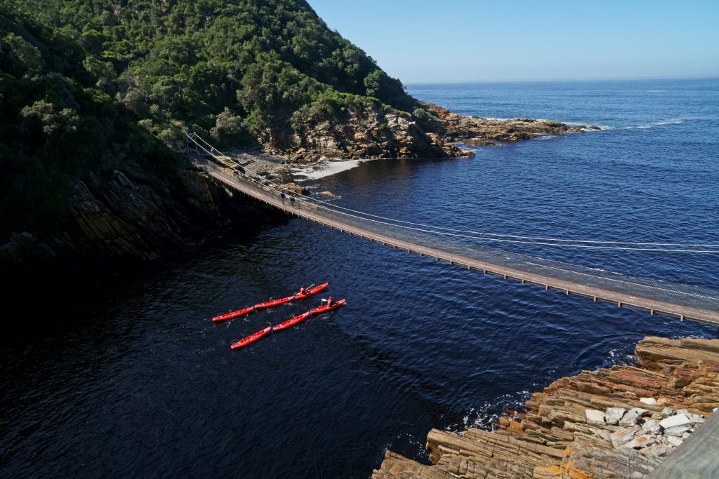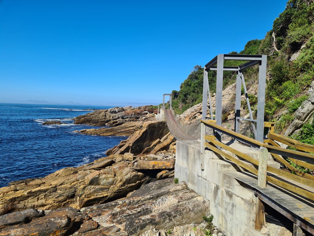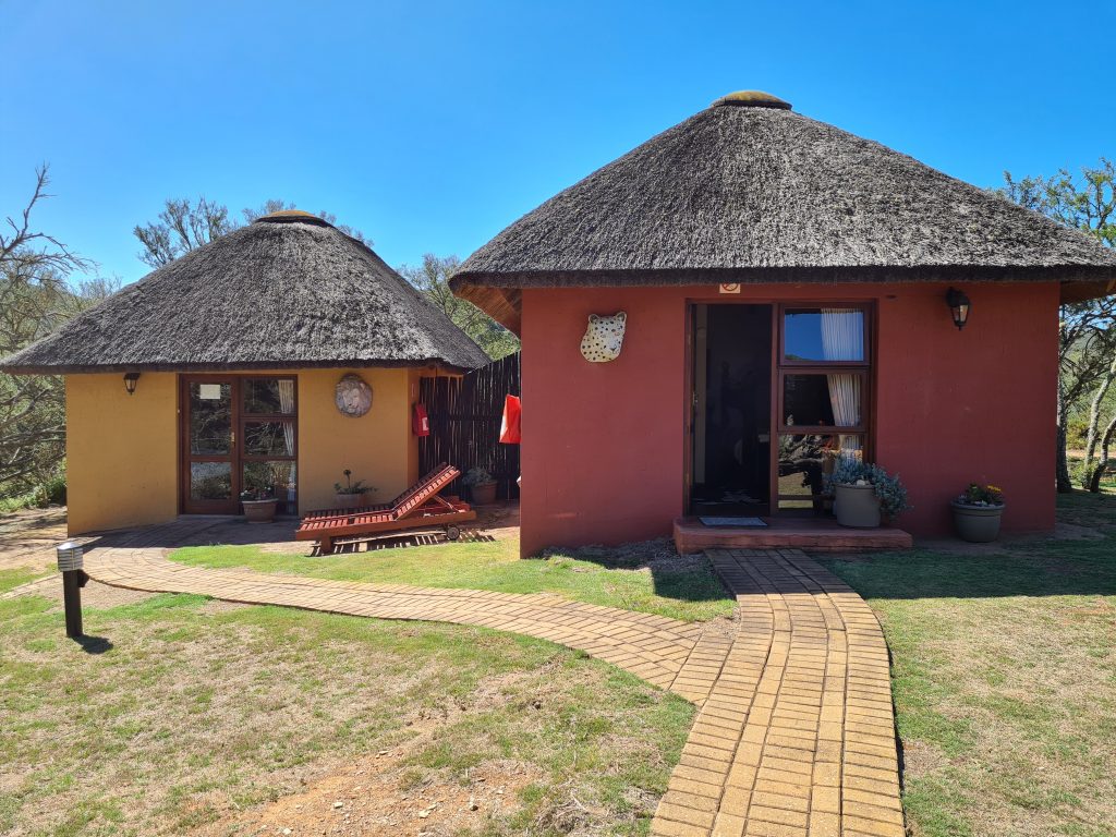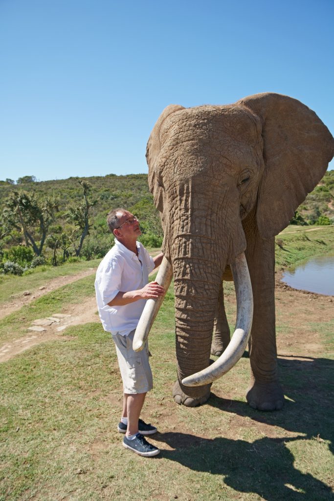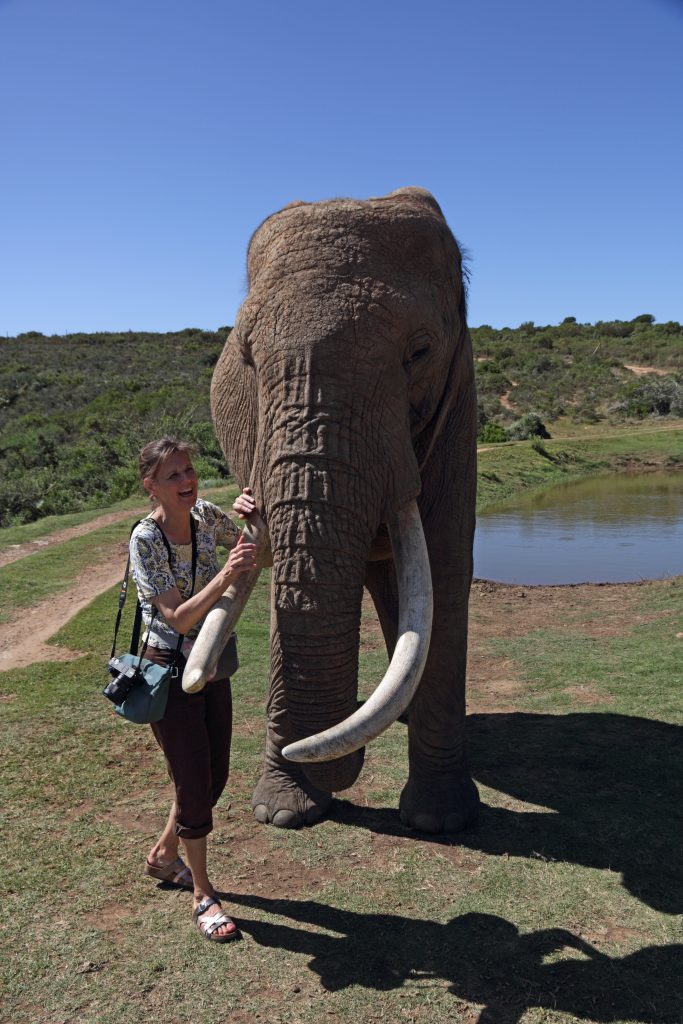 Der Tag samt Frühstück beginnt also auch hier früher als üblich. Unsere Ankündigung bzw. Bitte um ein früheres Frühstück scheint nicht an die Küche weitergegeben worden zu sein, denn alle wirken etwas überrascht von unserem Kommen um kurz nach 7 Uhr. Für Omelettes oder Scrambled Eggs ist man noch nicht vorbereitet, uns reichen aber der Jogurt mit Früchten bzw. die Toasts mit Marmelade. Entlang der Bay geht es zum Tsitsikama samt Suspension Bridge. Wieder sind früh dran, aber wir sind nicht die ersten Touristen vor Ort, denn einige haben sicherlich vor Ort in den Cabins oder auf dem Campingplatz übernachtet. Mit über 500 Rand ist dieser Nationalpark auch nicht gerade billig, aber – wie wir meinen – sein Geld wert. Wir parken – und machen uns – gemeinsam mit einer wenige Meter vor uns gehenden Girliegroup – auf den Weg zu den Hängebrücken. Über viele Stufen geht es aufwärts, dann wieder hinunter zum Wasser – wir kommen folglich auch erstmals ins Schwitzen – über-queren schwankend die erste Brücke und erreichen dann auch die längste der drei Hängebrücken, die über den Storms River führt. Ein bisschen Glück haben wir mit unseren schon genannten Mädchen, die – bevor sie die Brücke betreten – unbedingt noch ihre tollen Instagramfotos schießen wollen. So gelangen wir „allein“ auf das gegenüberliegende Flussufer und können unsere Fotos machen, ohne darauf achten zu müssen, dass kein Fremder im Bild ist. Der Rückweg, da es großteils abwärts geht, fällt uns leichter. Mittlerweile ist die Anzahl der Touristen vorne am Parkplatz auch schon deutlich angestiegen, der Parkplatz ist schon so voll, dass wir beim Herausfahren mit unserem 5,30 m langen Kleinwagen Vorsicht walten lassen müssen. Aus der Ferne beobachten wir noch einige Kanus im Fluss und Meer – es gibt hier extra Anbieter -, was aber für uns als Kuneneschlauchbootverunfallte nie in Frage kommen würde. Anders denken wir aber über die Holzhütten, die man mieten kann, und in denen man – ohne Tagestouristen – direkt am Meer übernachten kann. Dann könnte man auch die sicherlich anstrengende Wanderung zu den Tsitsikama-Falls in Betracht ziehen. Noch vor 11 Uhr verlassen den Park. Wieder an der Hauptstraße, der N2, „drehen“ wir erstmals um, denn nun geht es wieder gen Capetown bzw. gen Westen. Unser Endziel für heute ist das gut 200 km entfernte Indalu Game Reserve. Indalu ist eine sehr kleine Selbstversorgerlodge mit zwei Häuschen, die man mieten kann und das als Activity „Elefantenspazierengehen“ anbietet. Um nicht zu verhungern, stoppen wir natürlich noch bei einem Supermarkt: Wir kaufen Toastbrot, Käse, Zwiebeln, Tomaten und Getränke – Kaffee, Zucker, Teebeutel usw. soll es vor Ort geben. Die Abzweigung ist rechterhand, dann geht es über ein Bahngleis und kommt scheinbar erst jetzt in Afrika an: Schotterstraße, ein abgesperrtes Reservat, in der Ferne die ersten wilden Tiere und ein paar Kilometer weiter ein Gate. Es ist unbesetzt, eine Telefonnummer ist angegeben, wir rufen an – und mit 369# öffnet sich das Tor. Genauso spannend geht es weiter, wir fahren entsprechend den Schildern und „landen“ nach gut 10 Minuten Fahrt bei der Lodge, in der die Eigentümer wohnen. Durch unseren Anruf vorgewarnt kommt uns auch schon eine Frau entgegen, die uns herzlich begrüßt und bittet, ihr in ihrem Geländewagen zu folgen. So geleitet sie uns zu dem mit einem „Zäunchen“ abgesperrten Areal mit den beiden Wohn- und einem Küchenhäuschen. Wir sind begeistert: die Frau ist nett, das Areal ist einsam und wunderschön, die Häuschen sind toll – und als Highlight: das 2. Häuschen ist heute leer. Letztere Information kommt uns natürlich als Sahnehäubchen vor – sofort denkt man daran, wie es gewesen wäre, wenn man sich die Küche mit anderen – im schlimmsten Fall nervigen deutschen Touristen – hätte teilen müssen. Sie zeigt uns alles, stellt uns noch zwei Sträußen, die um’s Haus herumschwirren, vor, und nimmt uns dann in ihrem Wagen auch schon wieder mit, um damit den Startschuss für unseren Elefantenwalk zu geben. Bei der Eigentümerlodge angekommen wird der Fahrer gewechselt, nun führt uns ein junger Mann – der Sohn des Besitzers – durch das Programm. Er fährt nur ein paar Kilometer, bleibt stehen, wünscht uns viel Spaß und lässt uns mit unseren Elefanten – begleitet von zwei Führern – allein. Nun stehen wir vor den Prachttieren, erstmals ohne im Auto zu sitzen, das ja zumindest gefühlt Schutz bietet, – riesengroß, ihre Rüssel leicht hin- und herbewegend, – man weiß nicht, ob und wie man die letzten Schritte auf sie zugehen darf, langsam oder schnell, soll man vor ihnen stehen oder daneben oder dahinter, wir sind unsicher, die Beine der Tiere sind so schon beindruckend kräftig, die Tiere scheinen einen die ganze Zeit mit den Augen zu beobachten – Momente, in denen man alles andere vergisst und sich nur auf diese für uns vollkommen neue Situation konzentriert. Gedanken, die man sich vorher gemacht hat, sind wie weggewischt, es zählt nur das, was so imposant vor einem steht. Die erste Berührung – rauh, kräftig, wie ein Ikeawebteppich – man will nichts falsch machen, ist unsicher, wir beobachten uns auch gegenseitig, denken ans Fotografieren, denn man will ja diese Sekunden festhalten. Die ersten Schritte als Dreiergruppe – Elefant plus wir plus Führer – auf einem Sträßchen, das zwischen die hügelhafte, malerische Landschaft führt – Fragen an die Führer, die wir stellen, ohne wirklich auf deren Antwort zu achten – eigentlich sind wir froh, dass wir nicht mit unseren Elefanten allein sind – die beiden helfen uns durch unsere Unsicherheit, vor allem dann, wenn unsere Tiere plötzlich dann doch überraschende Bewegungen in unsere Richtung machen. So marschieren wir zu sechst – die Zeit, die vergeht, nimmt man gar nicht wahr – wir gehen und gehen – und entdecken dann doch irgendwann wieder in 100