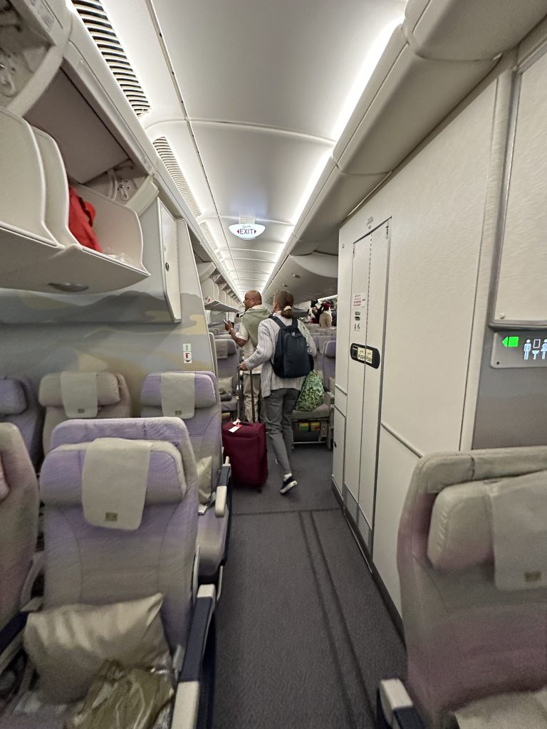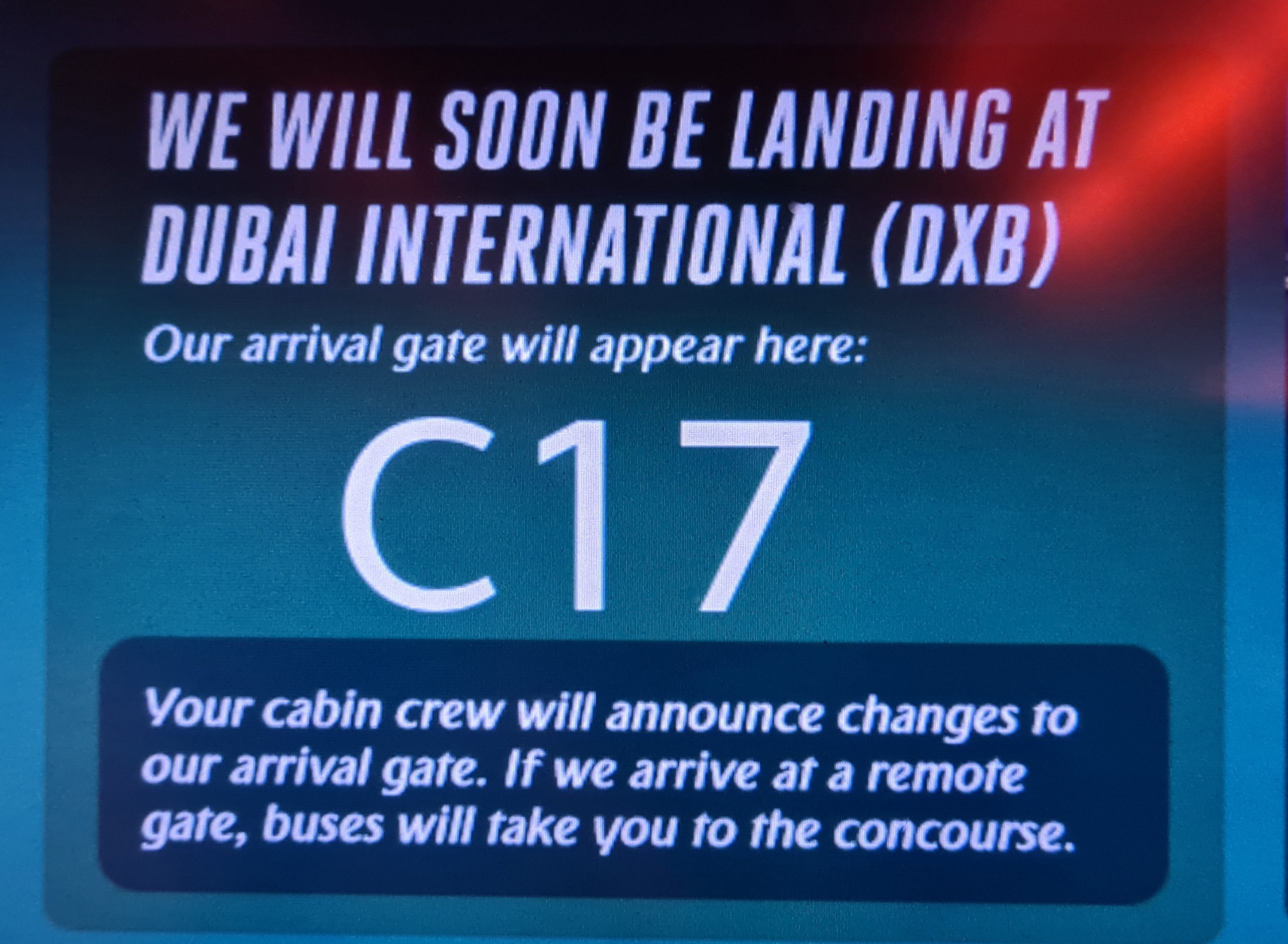Alles läuft nach Plan: München verlassen wir fast pünktlich und Dubai erreichen wir in-time. Da wir die Exitseats nur für den zweiten Flug geordert haben, sitzen wir in der normalen Economy auf den Plätzen 53-B und 53-C. Der Flug dauert eigentlich nur fünfeinhalb Stunden, kommt uns aber irgendwie länger vor, was vermutlich der Tatsache geschuldet ist, dass wir nicht schlafen können. In Dubai ist es kurz vor Mitternacht – wir kommen an am Gate C17, weiter geht es von B21.
