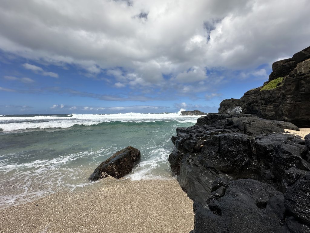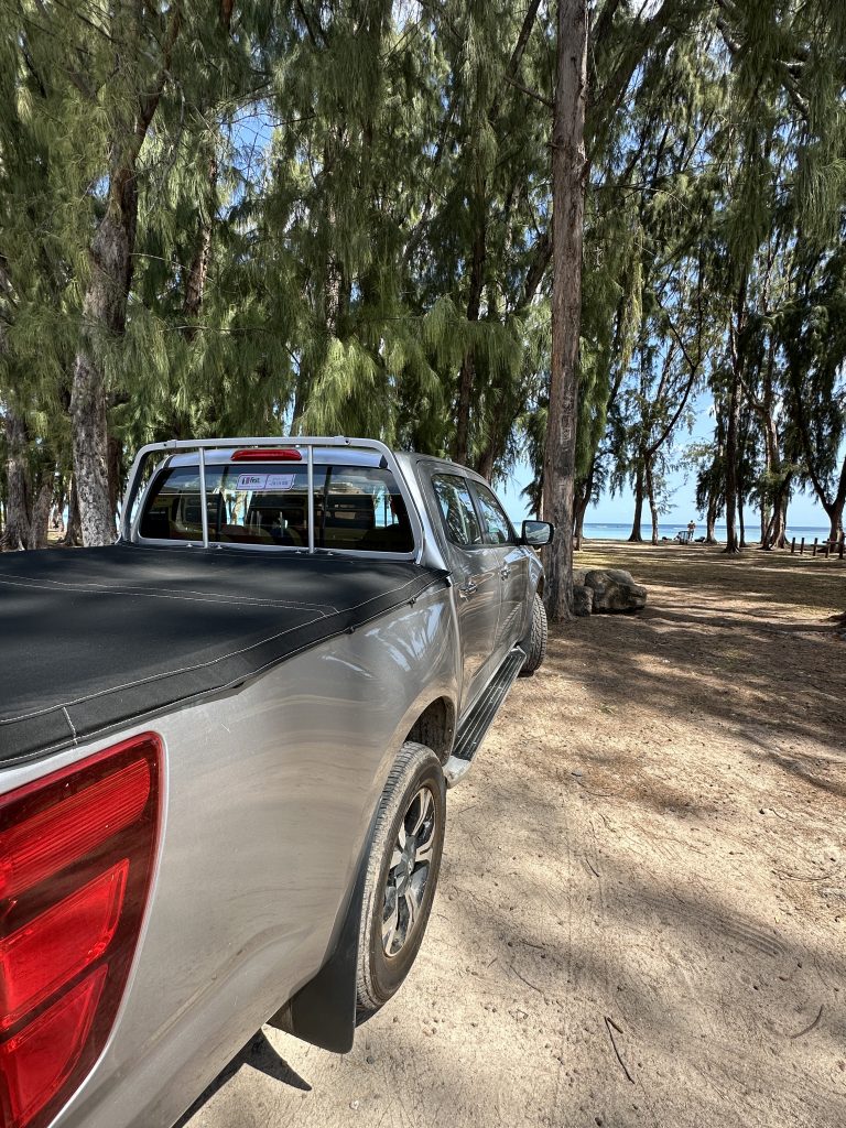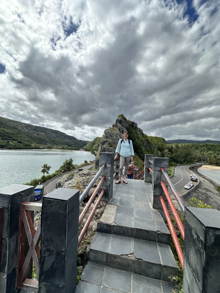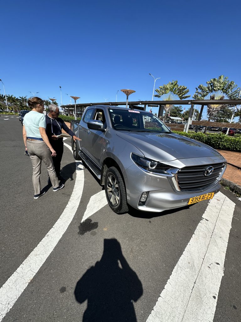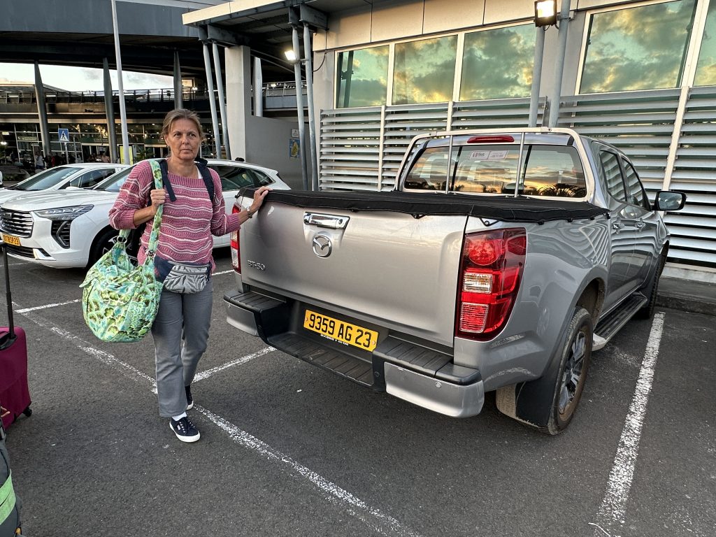 Seit ein paar Minuten sitzen wir nun vielleicht 50 Meter nach B21, direkt am Schalter, alle Sitzplätze sind belegt. Das Gate war zu Fuß erreichbar – ohne Zug oder Bus, aber mit erneuter Handgepäckkontrolle bei der Security. Mittlerweile ist es fast halb Zwei, wir sind logischerweise recht müde und warten auf den Abflug um 2:50 Uhr. Gott sei Dank haben wir nun die Exitseats und Gott sei Dank können wir etwas beim Flug 2 etwas schlafen. So landen wir pünktlich, die Immigration dauert seine Zeit, die Koffer auch, vermutlich deshalb, weil sie vom First-Class-Gepäckband kommen und nicht von dem Economy-Band, an dem wir logischerweise warten. Wir holen uns schnell Geld am ATM, 5000 Mauritiusrupien, lt. Google knapp 95 €. Dann verlassen wir das Flughafengebäude beim Exit 6, gehen links ein paar Meter zum recht kleinen, schmalen Car-Rentalgebäude mit wohl 8 Schaltern aller bekannten Verleihfirmen. Unserer ist Schalter Nr. 4 von First-Car-Rental. Zwar müssen wir kurz anstehen, insgesamt dauert die Paperwork nur wenige Minuten. Allerdings werden die Autos erst gebracht … So stehen wir am Parkplatz vor dem Gebäude – bei Sonnenschein und angenehmen Temperaturen – und nach 15 Minuten fährt ein silberner Mazda-Pickup mit vielen Kratzern vor, die wir alle ordentlich dokumentieren. Gott sei Dank sprechen alle Englisch. Dann geht es auch schon los – die 50 Rupien-Gebühr für’s Parken erlässt man uns angesichts des 1000-Rupien-Scheins – in Richtung Gris-Gris, dem ersten Must-See-Stop unseres Urlaubs. Das erste Malheur passiert auch: Beim Fotografieren werden die noch fast neuen blauen Converse-Sneaker von den Wellen erfasst. Das nächste Ziel sind die Rochester Falls mit der ersten Schlammschlacht für unseren Pickup mit durchgehenden Reifen samt danach braunem Profil. Wenigstens müssen wir nicht weit gehen und trotz rutschigem Pfad gelangen wir ohne auszurutschen ans Ufer. Allein sind wir dort wahrlich nicht, so dass wir auf den ersten Drohneneinsatz verzichten und uns dort nur ein paar Minuten aufhalten. Der nächste Stop ist die berühmte Haarnadelkurve auf Mauritius. Sie heißt Macondé oder auch Baie du Cap. Sie befindet sich an der Küstenstraße im Süden der Insel bei Baie du Cap. Die Kurve ist bekannt für ihre steile, enge Schlängelung um einen Felsen und den atemberaubenden Ausblick auf das Meer, der von dort aus genossen werden kann. No chance for the drone, because it is too windy and too many tourists. Nichtsdestotrotz schießen wir normale Fotos, ehe es weitergeht zum ersten Supermarktbesuch in la Gaulette. Dort decken wir uns mit Getränken ein. Die schweren Augen treiben uns dann dann ins erste Hotel: Lakaz Chamarel – Luxus am Berg mit tollem Blick und verstreuten kleinen, tollen uneinsehbaren Villas auf einem malerischen Hotelareal. Hier sitzen wir hundemüde und genießen die Ruhe. Um 7 Uhr gibt es Dinner … Buffet, ein guter französischer Rotwein, Salat, Baguette, Hühnerfleisch, Fisch – süß-sauer, gedämpften Weißkohl, fried noodles, streamed rice und exzellente kleine Desserts: Was will man mehr? Wir können das Abendessen genießen – die vermissten Haustürschlüssel tauchen wieder auf und in der Wärme der Gasheizstrahler ist es keineswegs so kalt wie befürchtet.
