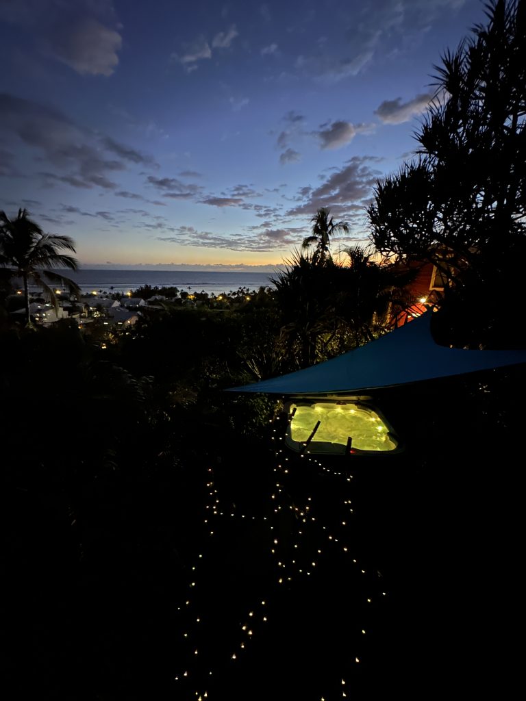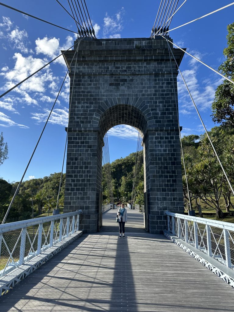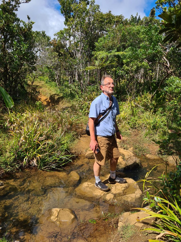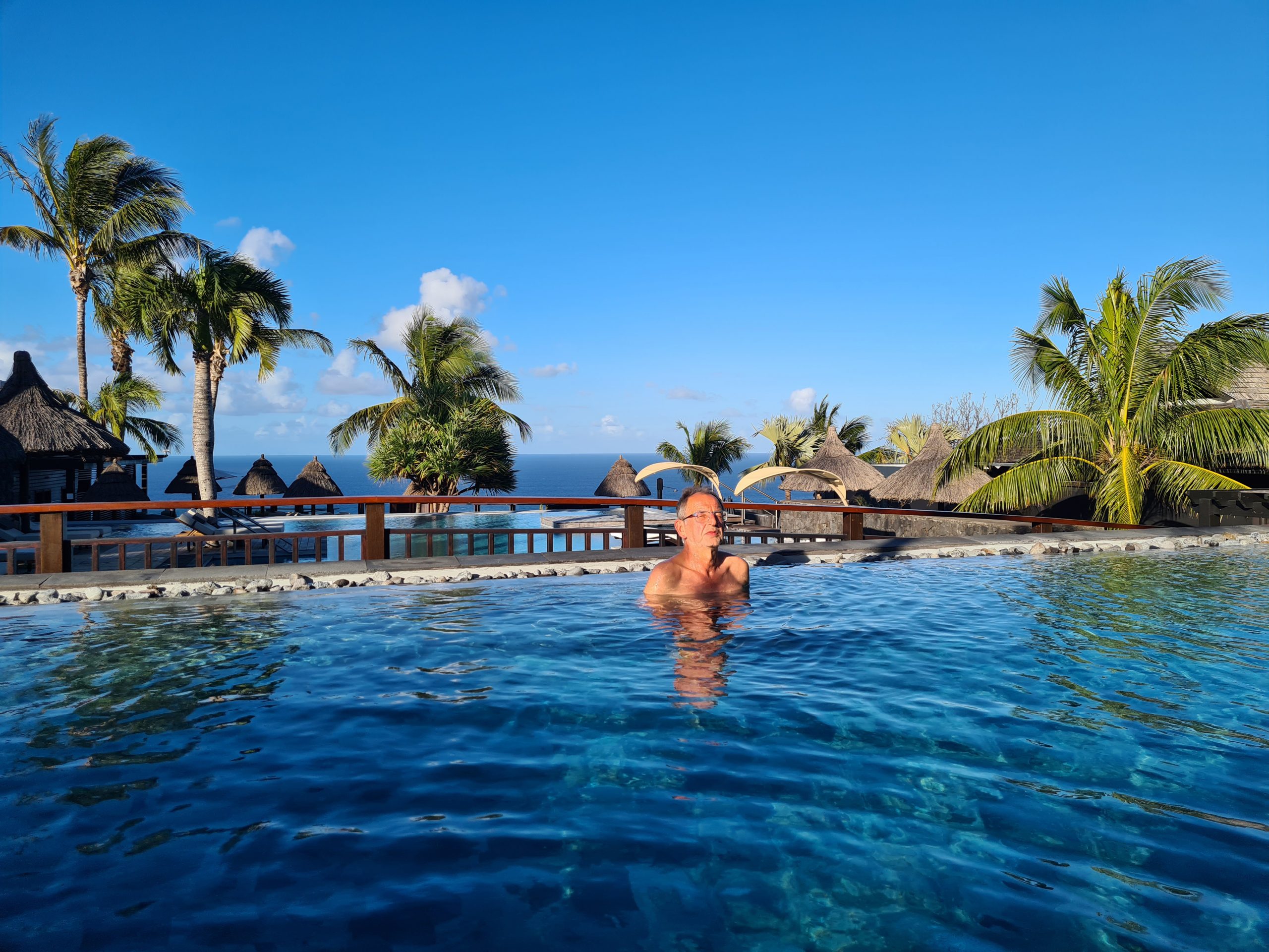 Ein super Frühstück im warmen Wind, ein kurzer Badebesuch im geheizten Pool, der gelungene Ausdruck unserer Einreisepapiere für Mauritius, Valet-Parking ohne Koffertragen – so beginnt der Tag. Wir verlassen das Hotel und fahren zunächst einmal „hinunter“ zur Grande Baie samt gemauertem Meerespool. Unser dortiger dritter Drohneneinsatz erweist sich im Nachhinein wieder nur bedingt erfolgreich. Wahrscheinlich sind wir einfach zu übervorsichtig – die Costa Rica-Katastrophe wirkt einfach noch nach. First important destination of today sind die Cascades Grand-Galet, die wir noch „nachholen“ müssen. Der erste Eindruck ist eigentlich positiv. Eine malerische kleine Straße mit einspurig zu befahrenen Metallbrücken führt vom Meer nach oben. Eigentlich ist auch wenig los und wir sind guter Hoffnung bis einen Kilometer vor den Fällen die ersten parkenden Autos am Straßenrand auftauchen. Wir „schnappen“ uns nicht die erste Parklücke, sondern erst die zweite. Im Nachhinein hätten wir ruhig noch weiterfahren können. Den letzten Teil gehen wir zu Fuß – und es ist viel los, eine Canyoninggruppe sorgt für weitere touristische Unruhe – und die Fälle sind im Schatten. Außerdem legen die Sonnenstrahlen im Talkessel einen milchigen Gegenlichtschleier über das Bild. Irgendwie kommen wir dann drauf, dass mit „händischem“ Sonnenschutz über den Objektiven die Bilder dann doch in ihrer Qualität deutlich besser werden. Nun stehen Tanken und Supermarkt auf dem Plan. Das Tanken stellt uns vor das Problem: Diesel oder Normalbenzin. Auf dem Leihwagenbegleitschein ist Diesel angekreuzt, der nicht Englisch sprechende Tankwart hätte Normal getankt. So kommen wir nicht umhin, bei der Assistance von Europcar anzurufen – und es ist doch tatsächlich Normal. Sozusagen haben wir im letzten Moment Glück gehabt. Wenn die Tankstelle wie in Deutschland üblich eine mit mit Self-Service gewesen wäre, dann wären wir wohl vor einem Riesenproblem mit riesigen Kosten und ungeklärter Verantwortung gestanden. Der Supermarkteinkauf geht Gott sei Dank problemlos vonstatten. Eine Stunde später stehen wir vor dem Poz Lagon, unserer nächsten Herberge. Sie wirkt zunächst einmal etwas strange, besser gesagt ungewöhnlich. Pascal ist total bemüht, er erklärt uns ausführlichst das Frühstücksprozedere incl. Handling des benutzten Geschirrs und die Nutzung des Jacuzzis samt erlaubten Nutzungszeiten, Düsen-, Temperatur- und Discolichteinstellung. Kurz vor dem Abendessen wagen wir es, ihn schon am ersten Abend ihn in Betrieb zu nehmen. Mindestens genauso begeistert sind wir auch von unserem in der Dämmerung blinkenden „Weihnachtsbaum“. Leider kommt aber das Supermarktbaguette nicht an die von uns so geschätzte Boulangeriequalität heran.