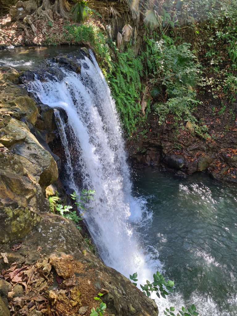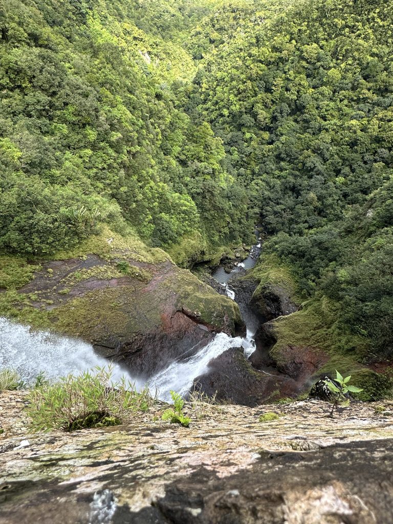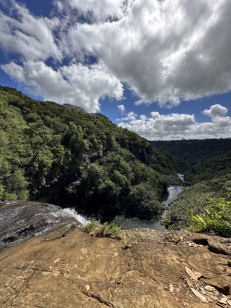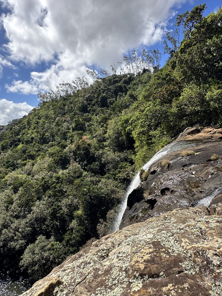 Der zweite „kirchliche“ Hochzeitstag beginnt wie der Vortag. Kaffee, Strandspaziergang und no-flight und anschließendem Buffet erneut mit der weißen Sahnekalorienbombe. Heute wollen wir uns – angesichts des fortgeschrittenen Alters und geringer Kondition – mit aller Vorsicht der Seven Cascades widmen. So geht es wieder hoch auf die Berge, an unserem „alten“ La-Caz-Chamarel vorbei, durch den Black River George-Nationalpark zum Trailhead. Die uns zuwinkenden „Werber“ für den Viewpoint negieren wir und fahren weiter, selbiges gilt für die „Ansprache“ für einen Führer beim Parkplatz. Zunächst geht es ebenerdig durch Felder, dann über Stock-und-Stein nach unten und nach einer Viertelstunde stehen wir beim obersten Wasserfall. Erfreulicherweise ist weniger los als befürchtet, nur eine Canyoninggruppe „hängt“ gesichert an der Klippe. So warten wir etwas, schauen vorsichtig nach unten und wagen uns dann an Filmaufnahmen mit unserer Drohne. Unseren Vorsatz nicht weiter nach unten zu klettern, behalten wir zwei „Obervernünftige“ auf jeden Fall bei. Ein gelungener Ausflug für uns und keineswegs anstrengend!
