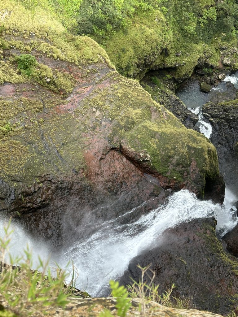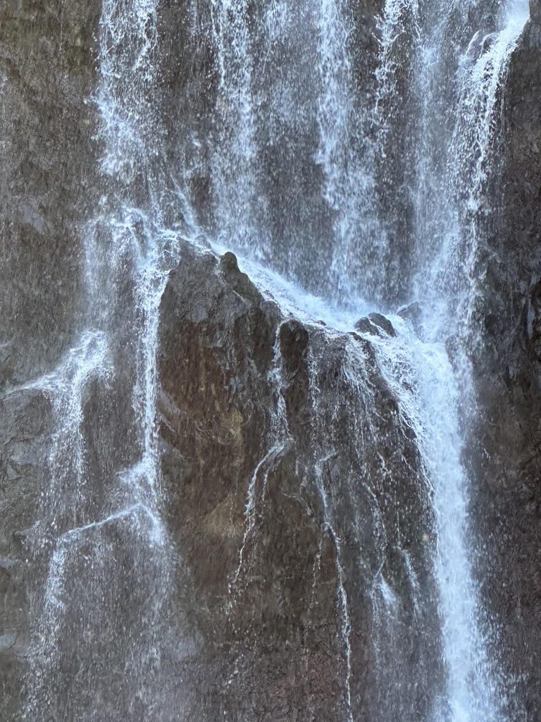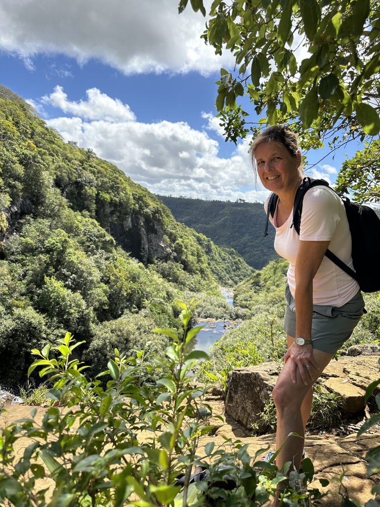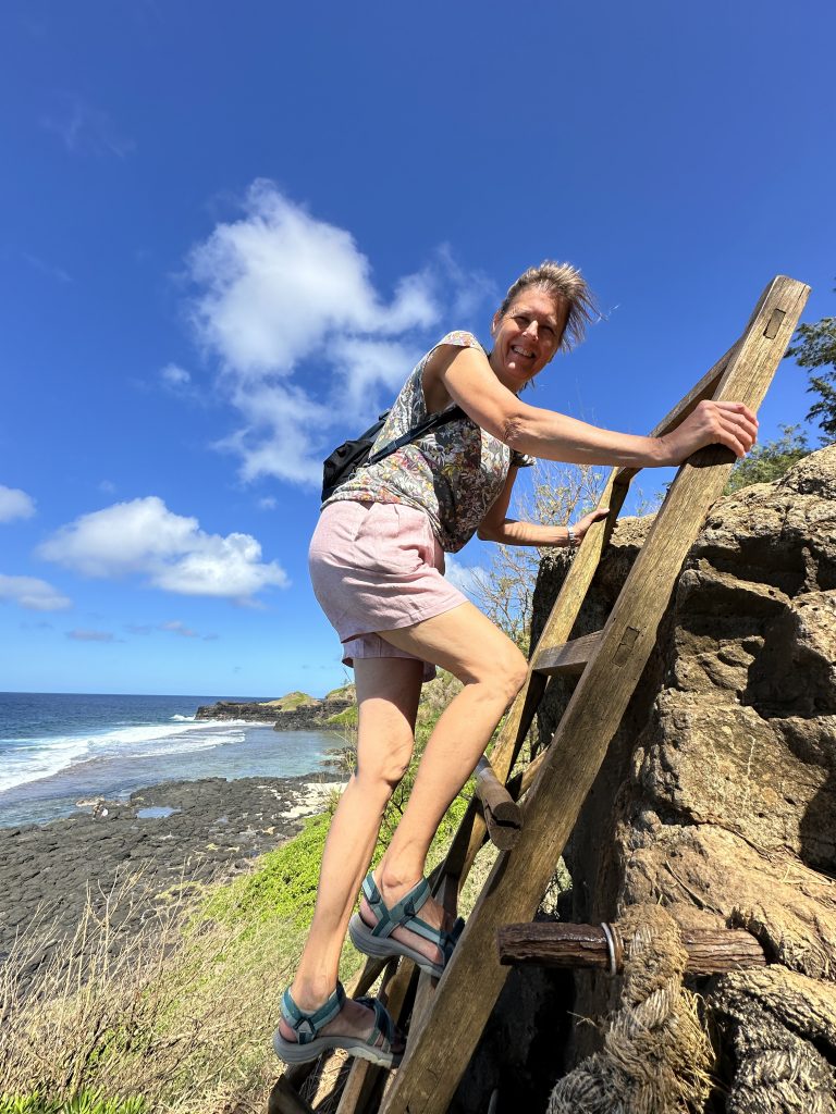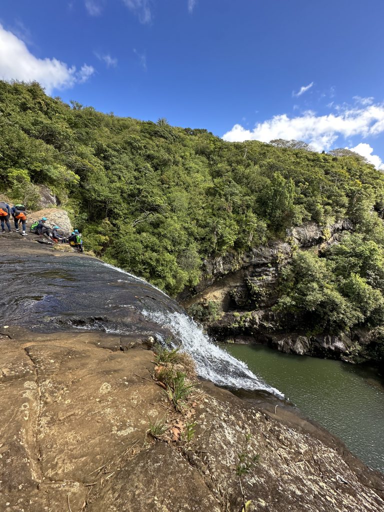 Der zweite „kirchliche“ Hochzeitstag beginnt wie der Vortag. Kaffee, Strandspaziergang und no-flight und anschließendem Buffet erneut mit der weißen Sahnekalorienbombe. Heute wollen wir uns – angesichts des fortgeschrittenen Alters und geringer Kondition – mit aller Vorsicht der Seven Cascades widmen. So geht es wieder hoch auf die Berge, an unserem „alten“ La-Caz-Chamarel vorbei, durch den Black River George-Nationalpark zum Trailhead. Die uns zuwinkenden „Werber“ für den Viewpoint negieren wir und fahren weiter, selbiges gilt für die „Ansprache“ für einen Führer beim Parkplatz. Zunächst geht es ebenerdig durch Felder, dann über Stock-und-Stein nach unten und nach einer Viertelstunde stehen wir beim obersten Wasserfall. Erfreulicherweise ist weniger los als befürchtet, nur eine Canyoninggruppe „hängt“ gesichert an der Klippe. So warten wir etwas, schauen vorsichtig nach unten und wagen uns dann an Filmaufnahmen mit unserer Drohne. Unseren Vorsatz nicht weiter nach unten zu klettern, behalten wir zwei „Obervernünftige“ auf jeden Fall bei. Ein gelungener Ausflug für uns und keineswegs anstrengend!