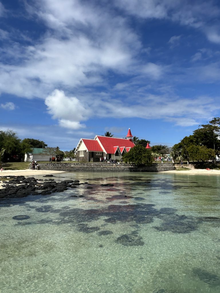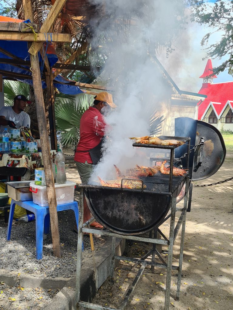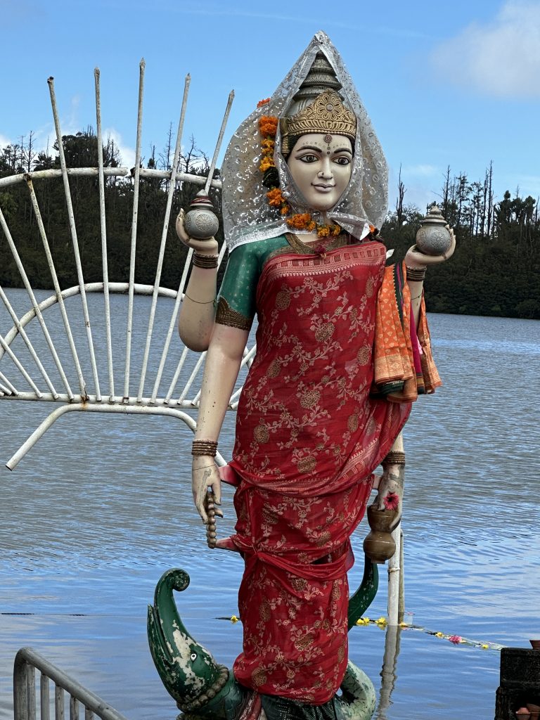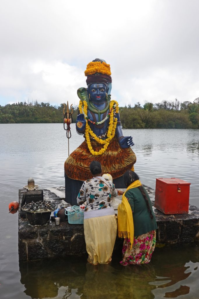 Nach dem erneut vorzüglichen Frühstück stehen die Ganga Talao-Tempel auf dem Programm: Die Shiva-Statue, auch bekannt als Mangal Mahadev, ist 33 Meter hoch, direkt gegenüber auf der „Seeseite“ steht die ebenfalls 33 Meter hohe Statue der hinduistischen Göttin Durga. Ganga Taleo gilt als heiligste Pilgerstätte der Hindus, beruhend auf der Legende, dass Shiva Gangeswasser verschüttet haben soll, das diesen (Krater-) See gebildet hat. Dementsprechend verehren Hindus diese Stätte und bringen mit den Füßen im Wasser den hier am Uferrand stehenden Götterfiguren ihre Opfergaben dar. Trotz der beeindruckenden Höhe der beiden Figuren – inmitten eines riesengroßen Parkplatzes – wirkt alles irgendwie sonderbar auf. Religiöse Anmut verspüren wir vielleicht noch am See, bei den Figuren fühlt man sich eher wie auf einem Supermarktplatz. Anschließend geht es zum ersten Mal zum Tanken. Wir tanken 40 Liter für knapp 2400 Rupien. Dann machen wir uns auf den Weg zum Cap Malheureux im Norden von Mauritius. Die dort stehende schlichte kleine Kirche Notre Dame Auxiliatrice mit ihrem leuchtend roten Dach ist eine der meistfotografierten Sehenswürdigkeiten der Insel. Leider begegnet uns dieses Highlight als überlaufener Touristenhotspot. Mit anderen Worten ist die Hölle los, die „rauchenden“ Grillstationen samt Sitzangeboten direkt neben der Kirche sind „proppevoll“. Den Parkplatz knapp 100 Meter nach der Kirche ergattern wir eher zufällig, von der Vorstellung einer idyllischen Kirche am Meeresufer ist die Tagesrealität weit entfernt. Sicherlich trägt auch die Uhrzeit – es ist Mittag – dazu bei bei. Andererseits haben wir mit unseren beiden Hotels im Süden im Grunde gar keine Möglichkeit, früher hier zu sein. Dass hier die Ausrichtung auf den Massentourismus ausgeprägter zu sein scheint, war uns zuvor schon in Grand Baie aufgefallen. So entscheiden wir uns entlang der Ostküste „langsam“ den Heimweg anzutreten. Der Tempel Sagar Shiv Mandir auf einer Mangroveninsel bleibt hier unser einziger Stopp auf dem Weg bis nach Mahébourg. Zwar lässt der Tourismus – je weiter nach Süden man kommt – merklich nach, allerdings wird auch das Meer unattraktiver und in dem einen oder anderen Ort stinkt es furchtbar nach faulen Eiern. Außerdem beginnt es zu regnen und die seit Malheureux reduzierte Begeisterung für unseren Trip heute sinkt weiter. Gegen 16 Uhr erreichen wir endlich – sichtlich genervt – unser Hotel. Unabhängig davon ist von der Vorfreude auf Réunion mit dem damit verbundenen „Aufgeben“ dieses paradiesischen Hotels samt Reisestress mit Pünktlich-am-Flughafen-Sein und rechtzeitiger Autorückgabe noch nichts zu spüren. Vielleicht hätten wir hier einen Tag länger bleiben sollen. Das Wetter passt sich dieser Missstimmung nun auch an. Besagter Regen hat nun auch unser Hotel erreicht. Erfreulich ist, dass wir beim 2. Aufenthalt auf Mauritius nicht mehr zum Cap müssen und dass wir nun um die Erfahrung reicher sind, dass so lange Fahrstrecken einfach „nerven“.