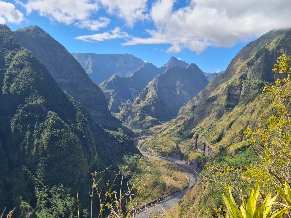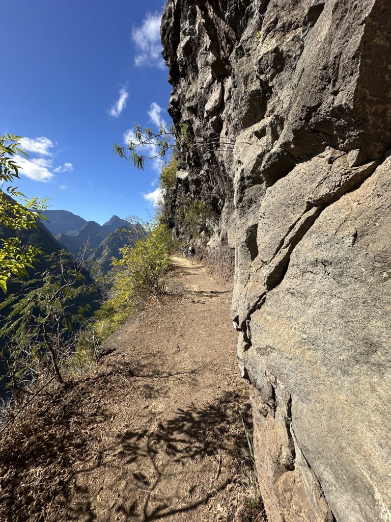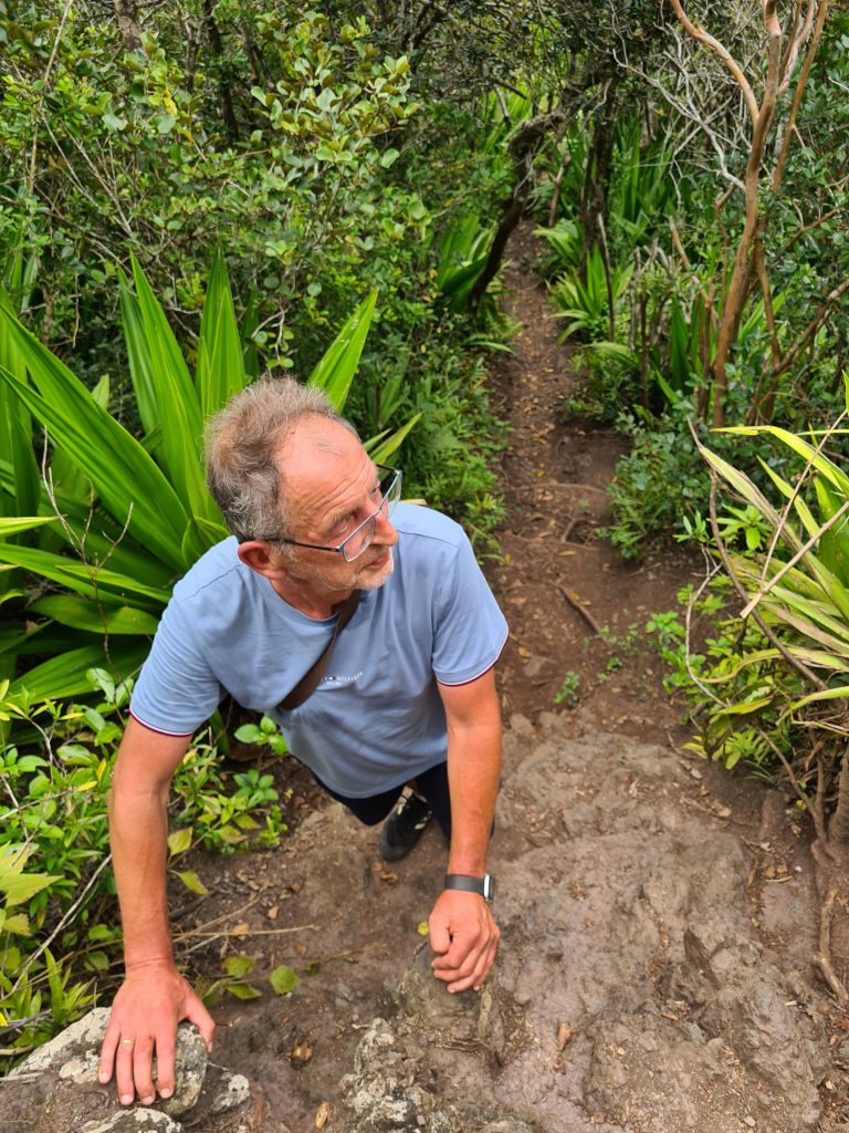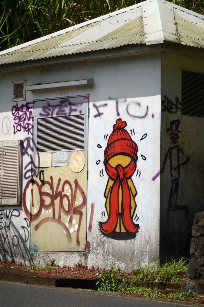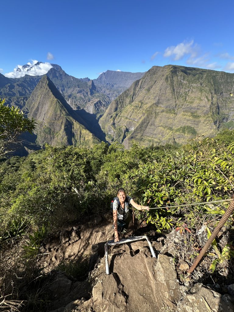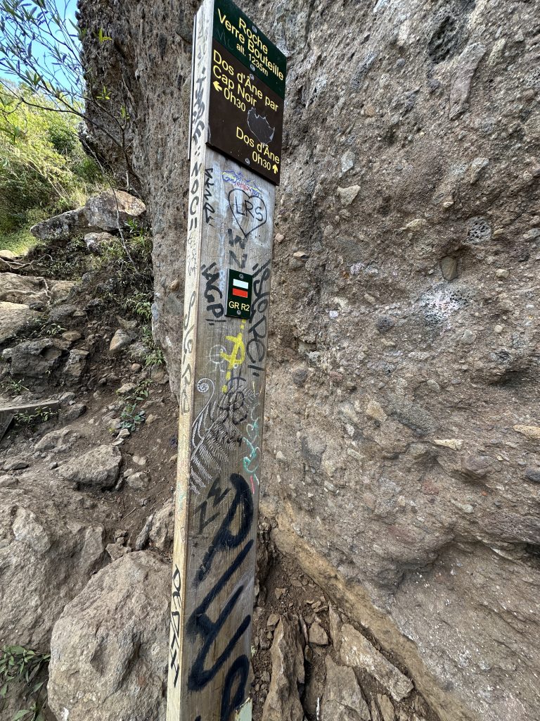 Frühstück – wie gehabt und dann le Cap Noir als Ziel. Teile dieser Wanderung sollen geschlossen sein, allerdings liest man im Netz, dass sich viele nicht an die Sperrung halten. Kurz nach 8 Uhr brechen wir auf. Noch in Saline des Bains kaufen wir uns schnell noch ein frisches Baguette fürs Abendessen. Der Startpunkt unseres Hikes ist das Tal des Rivière des Galets kurz nach der hoch in den Bergen gelegenen Ortschaft Dos d’Ane. Dass man hierzu wieder 1000 Serpentinen mit den berüchtigten, aber schon gewohnten Straßengräben fahren muss, haben wir logischerweise erwartet. Erhofft haben wir einen „guten“ Parkplatz, was angesichts der vielen parkenden Pkws am Straßenende nicht zu erwarten gewesen wäre. Bekommen haben einen ganz am Ende der Straße knapp 50 Meter nach dem aufgebauten Obststand, direkt am Trailhead. Nicht einmal rangieren mussten wir. So geht es den kleinen Hang oberhalb des Parkplatzes hinauf, an der ersten Kreuzung halten wir uns rechts und folgen dem Schild Cap Noir. Der Weg führt langsam bergab und oberhalb des Flusses Rivière des Galets entlang. Gegenüber entdecken wir den Wanderweg Canalisation des orangeres, den wir ja am Tag zuvor gegangen sind. Nach gut 600 Metern erreichen wir den ersten Aussichtspunkt samt Schutzgeländer und dem besagten „Fermé“-Schild, das weder eine Gruppe vor uns noch uns abhält, weiterzugehen. Auf jeden Fall ist der Blick traumhaft, fast senkrecht geht es nach unten, man sieht den Rivière des Galets bzw. weit entfernt die nur zu Fuß erreichbaren Mafatedörfer. Kurz danach sind wir auch schon bei der ersten Leiter, die wir nach oben klettern. Insgesamt ist diese Wanderung – obwohl kürzer als die gestrige – etwas anstrengender, weil man einfach mehr aufpassen muss, um nicht über die Wurzeln oder Steine zu stolpern oder auszurutschen. An der einen oder anderen „gefährlichen“ Stelle sind zusätzlich Metallseile links angebracht. Der Weg schlängelt sich serpentinenförmig nach oben zum La Roche Verre Bouteille. Dieser vertikale Felsen erinnert in seiner Form an eine Flasche. Kurz danach erreichen wir den Kamm mit Blick auf den Talkessel von Mafate und nach „vorne“ auf das Dörfchen Dos d’Ane. Eine dort angebrachte Bank nutzen wir für eine kurze Pause, ehe es dann langsam – erneut mit zwei kleinen Leiterpassagen – hinunter in Richtung Parkplatz geht. Gegen 11:25 Uhr steigen wir in unseren Peugeot, fahren gen Saint Gilles des Baines und fotografieren dort „unser“ Jace-Bild, an dem wir gestern schon vorbeigefahren sind. Sonntagsbedingt finden wir keinen geöffneten Supermarkt und steuern unseren „Heimatort“ Saline des Bains an. Kurzfristig werfen wir noch eine „Kurzinspektion“ des Public Beaches ein, der sich aufgrund des vorgelagerten Riffes als „schwimmsicher“ erweist, aber aufgrund des starken Windes, der vielen Leute und der spitzen Korallen im Sand wenig zum Verweilen einlädt. 20 Minuten später sind wir wieder bei unserer Unterkunft Poz Lagon mit dem gleichen Plan für die Abendgestaltung wie an den vorangegangenen Tagen.