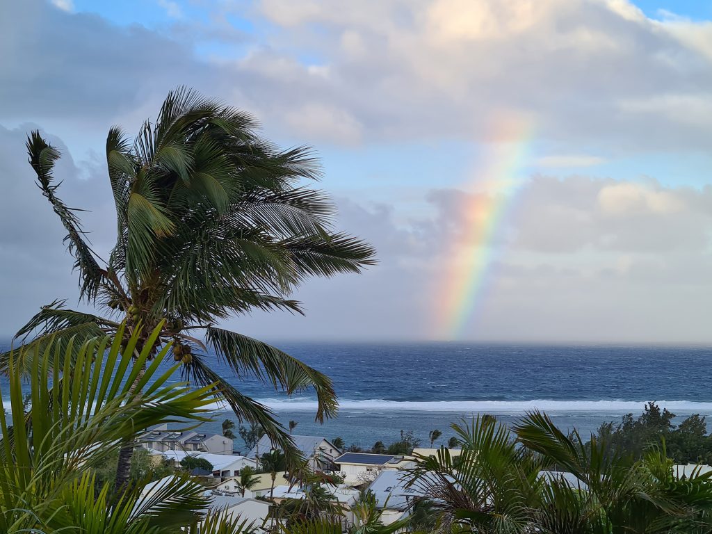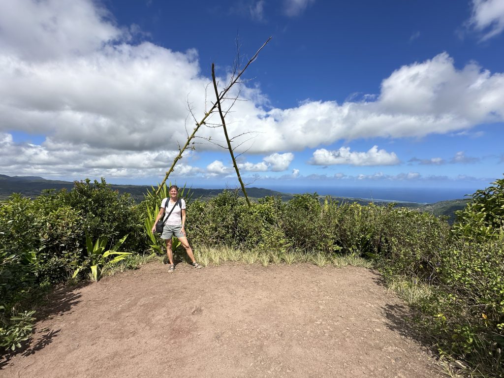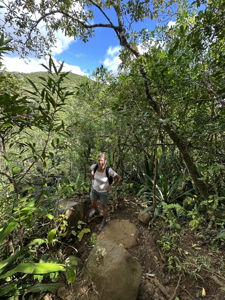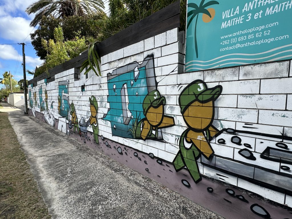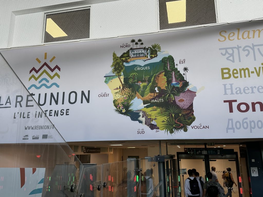 Frühstück – wie gehabt und dann le Cap Noir als Ziel. Teile dieser Wanderung sollen geschlossen sein, allerdings liest man im Netz, dass sich viele nicht an die Sperrung halten. Kurz nach 8 Uhr brechen wir auf. Noch in Saline des Bains kaufen wir uns schnell noch ein frisches Baguette fürs Abendessen. Der Startpunkt unseres Hikes ist das Tal des Rivière des Galets kurz nach der hoch in den Bergen gelegenen Ortschaft Dos d’Ane. Dass man hierzu wieder 1000 Serpentinen mit den berüchtigten, aber schon gewohnten Straßengräben fahren muss, haben wir logischerweise erwartet. Erhofft haben wir einen „guten“ Parkplatz, was angesichts der vielen parkenden Pkws am Straßenende nicht zu erwarten gewesen wäre. Bekommen haben einen ganz am Ende der Straße knapp 50 Meter nach dem aufgebauten Obststand, direkt am Trailhead. Nicht einmal rangieren mussten wir. So geht es den kleinen Hang oberhalb des Parkplatzes hinauf, an der ersten Kreuzung halten wir uns rechts und folgen dem Schild Cap Noir. Der Weg führt langsam bergab und oberhalb des Flusses Rivière des Galets entlang. Gegenüber entdecken wir den Wanderweg Canalisation des orangeres, den wir ja am Tag zuvor gegangen sind. Nach gut 600 Metern erreichen wir den ersten Aussichtspunkt samt Schutzgeländer und dem besagten „Fermé“-Schild, das weder eine Gruppe vor uns noch uns abhält, weiterzugehen. Auf jeden Fall ist der Blick traumhaft, fast senkrecht geht es nach unten, man sieht den Rivière des Galets bzw. weit entfernt die nur zu Fuß erreichbaren Mafatedörfer. Kurz danach sind wir auch schon bei der ersten Leiter, die wir nach oben klettern. Insgesamt ist diese Wanderung – obwohl kürzer als die gestrige – etwas anstrengender, weil man einfach mehr aufpassen muss, um nicht über die Wurzeln oder Steine zu stolpern oder auszurutschen. An der einen oder anderen „gefährlichen“ Stelle sind zusätzlich Metallseile links angebracht. Der Weg schlängelt sich serpentinenförmig nach oben zum La Roche Verre Bouteille. Dieser vertikale Felsen erinnert in seiner Form an eine Flasche. Kurz danach erreichen wir den Kamm mit Blick auf den Talkessel von Mafate und nach „vorne“ auf das Dörfchen Dos d’Ane. Eine dort angebrachte Bank nutzen wir für eine kurze Pause, ehe es dann langsam – erneut mit zwei kleinen Leiterpassagen – hinunter in Richtung Parkplatz geht. Gegen 11:25 Uhr steigen wir in unseren Peugeot, fahren gen Saint Gilles des Baines und fotografieren dort „unser“ Jace-Bild, an dem wir gestern schon vorbeigefahren sind. Sonntagsbedingt finden wir keinen geöffneten Supermarkt und steuern unseren „Heimatort“ Saline des Bains an. Kurzfristig werfen wir noch eine „Kurzinspektion“ des Public Beaches ein, der sich aufgrund des vorgelagerten Riffes als „schwimmsicher“ erweist, aber aufgrund des starken Windes, der vielen Leute und der spitzen Korallen im Sand wenig zum Verweilen einlädt. 20 Minuten später sind wir wieder bei unserer Unterkunft Poz Lagon mit dem gleichen Plan für die Abendgestaltung wie an den vorangegangenen Tagen.