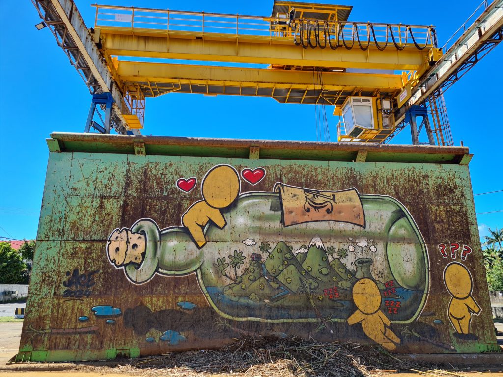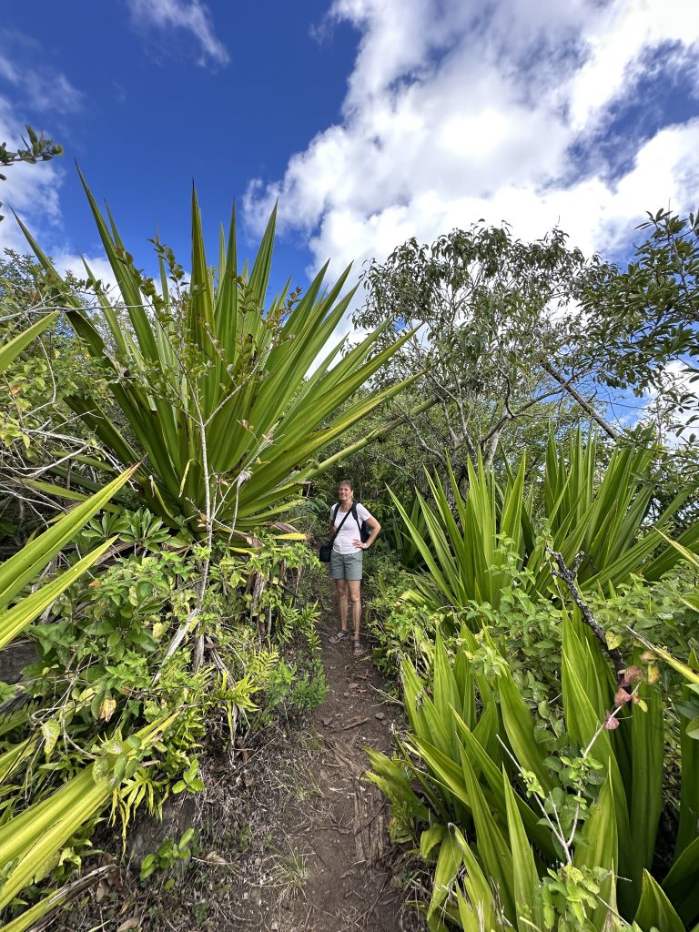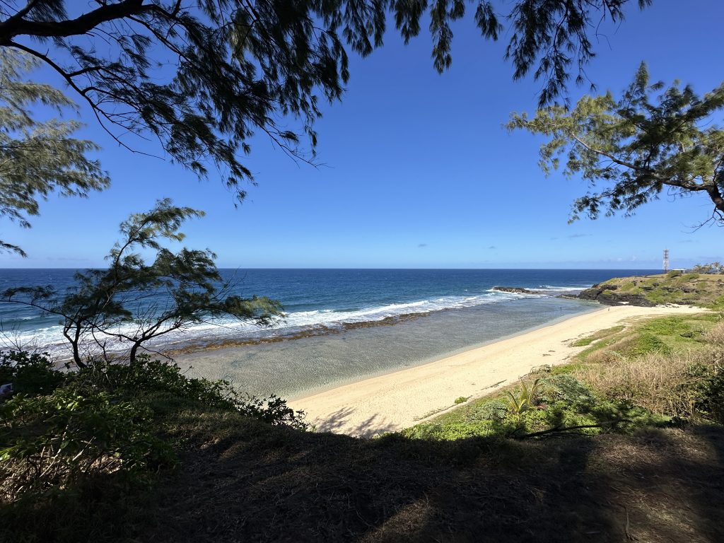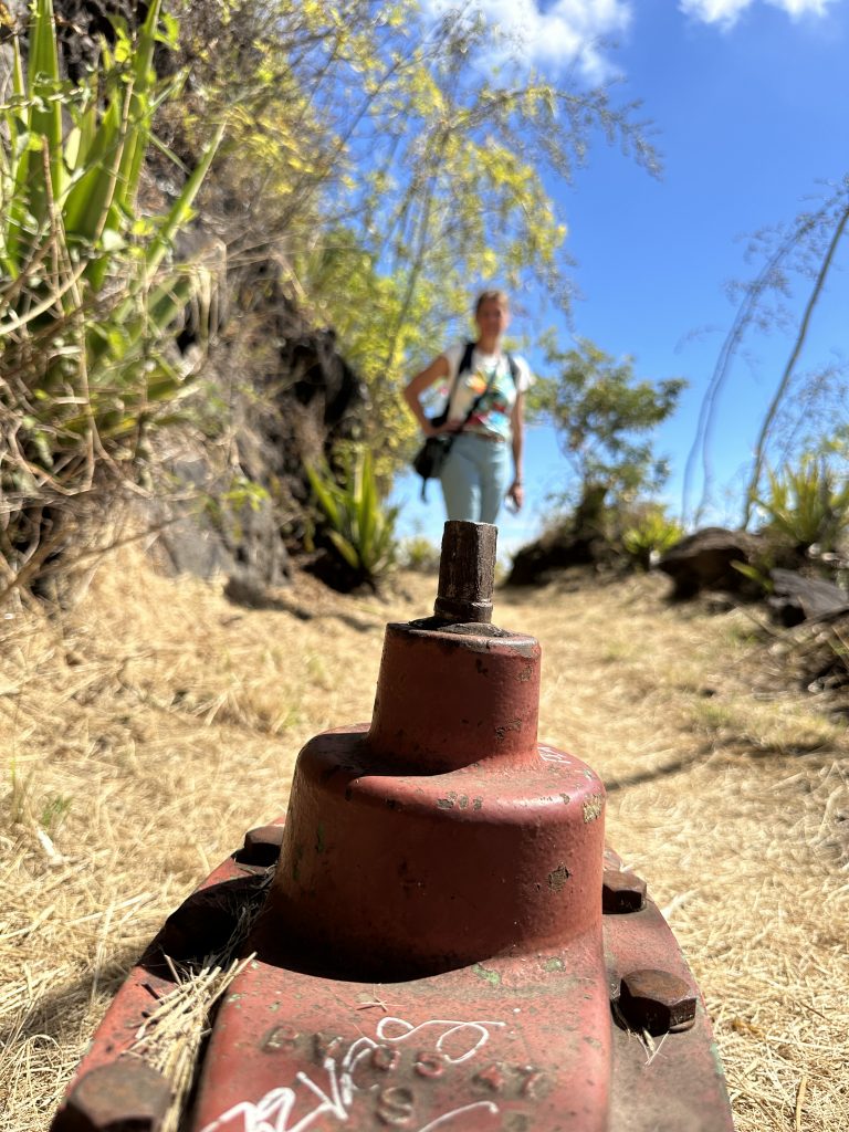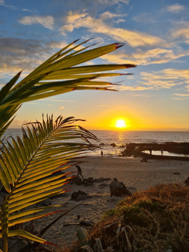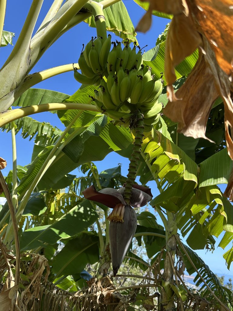 Frühstück – wie gehabt und dann le Cap Noir als Ziel. Teile dieser Wanderung sollen geschlossen sein, allerdings liest man im Netz, dass sich viele nicht an die Sperrung halten. Kurz nach 8 Uhr brechen wir auf. Noch in Saline des Bains kaufen wir uns schnell noch ein frisches Baguette fürs Abendessen. Der Startpunkt unseres Hikes ist das Tal des Rivière des Galets kurz nach der hoch in den Bergen gelegenen Ortschaft Dos d’Ane. Dass man hierzu wieder 1000 Serpentinen mit den berüchtigten, aber schon gewohnten Straßengräben fahren muss, haben wir logischerweise erwartet. Erhofft haben wir einen „guten“ Parkplatz, was angesichts der vielen parkenden Pkws am Straßenende nicht zu erwarten gewesen wäre. Bekommen haben einen ganz am Ende der Straße knapp 50 Meter nach dem aufgebauten Obststand, direkt am Trailhead. Nicht einmal rangieren mussten wir. So geht es den kleinen Hang oberhalb des Parkplatzes hinauf, an der ersten Kreuzung halten wir uns rechts und folgen dem Schild Cap Noir. Der Weg führt langsam bergab und oberhalb des Flusses Rivière des Galets entlang. Gegenüber entdecken wir den Wanderweg Canalisation des orangeres, den wir ja am Tag zuvor gegangen sind. Nach gut 600 Metern erreichen wir den ersten Aussichtspunkt samt Schutzgeländer und dem besagten „Fermé“-Schild, das weder eine Gruppe vor uns noch uns abhält, weiterzugehen. Auf jeden Fall ist der Blick traumhaft, fast senkrecht geht es nach unten, man sieht den Rivière des Galets bzw. weit entfernt die nur zu Fuß erreichbaren Mafatedörfer. Kurz danach sind wir auch schon bei der ersten Leiter, die wir nach oben klettern. Insgesamt ist diese Wanderung – obwohl kürzer als die gestrige – etwas anstrengender, weil man einfach mehr aufpassen muss, um nicht über die Wurzeln oder Steine zu stolpern oder auszurutschen. An der einen oder anderen „gefährlichen“ Stelle sind zusätzlich Metallseile links angebracht. Der Weg schlängelt sich serpentinenförmig nach oben zum La Roche Verre Bouteille. Dieser vertikale Felsen erinnert in seiner Form an eine Flasche. Kurz danach erreichen wir den Kamm mit Blick auf den Talkessel von Mafate und nach „vorne“ auf das Dörfchen Dos d’Ane. Eine dort angebrachte Bank nutzen wir für eine kurze Pause, ehe es dann langsam – erneut mit zwei kleinen Leiterpassagen – hinunter in Richtung Parkplatz geht. Gegen 11:25 Uhr steigen wir in unseren Peugeot, fahren gen Saint Gilles des Baines und fotografieren dort „unser“ Jace-Bild, an dem wir gestern schon vorbeigefahren sind. Sonntagsbedingt finden wir keinen geöffneten Supermarkt und steuern unseren „Heimatort“ Saline des Bains an. Kurzfristig werfen wir noch eine „Kurzinspektion“ des Public Beaches ein, der sich aufgrund des vorgelagerten Riffes als „schwimmsicher“ erweist, aber aufgrund des starken Windes, der vielen Leute und der spitzen Korallen im Sand wenig zum Verweilen einlädt. 20 Minuten später sind wir wieder bei unserer Unterkunft Poz Lagon mit dem gleichen Plan für die Abendgestaltung wie an den vorangegangenen Tagen.