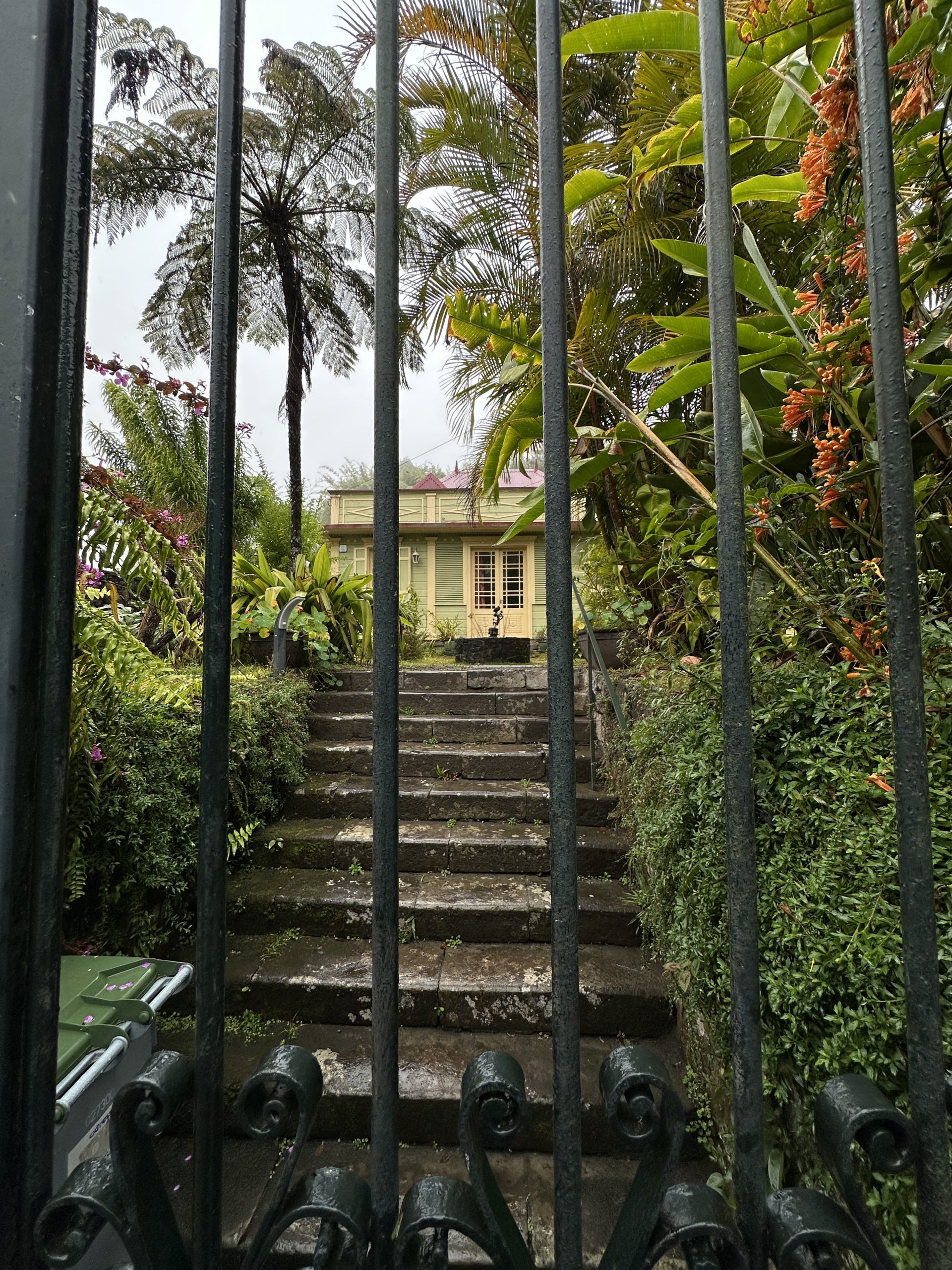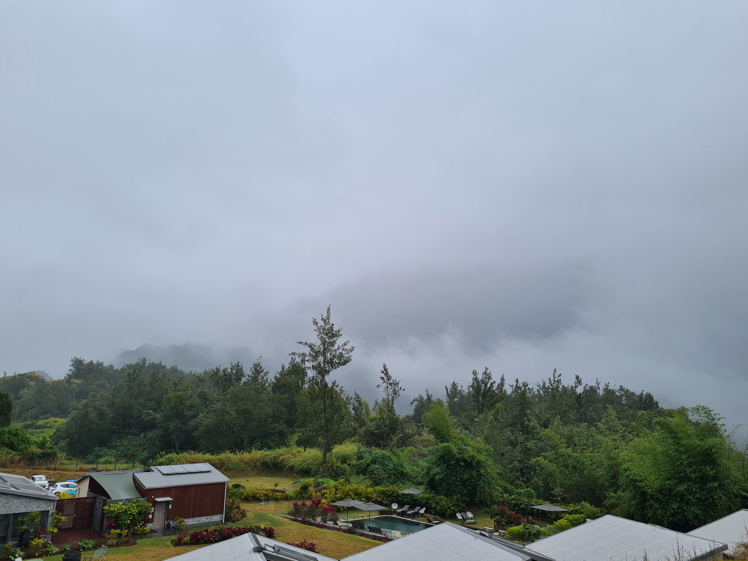 Leider hat der Wetterbericht Recht. Es regnet, die Berge vor uns sind hinter einer weißen Wolkenwand nur zu erahnen. Wenigstens das Frühstücksangebot ist erfreulich. Nun sitzen wir am Balkon und schauen dem Nieselregen zu. In ein paar Minuten werden wir dem scheußlichen Wetter trotzen und uns gen Hell-Bourg aufmachen, um uns dort etwas umzusehen bzw. gegebenenfalls auch etwas zum Essen zu kaufen, um heute Abend nicht erneut einen kostspieligen Reinfall beim Dinner erleben zu müssen: Rosinenschnecke, Apfeltasche und Baguette, le résultat du Hell-Bourg, et fromage de Salazie. Durch beide Dörfer spazieren wir mit Regenschirm und Regenjacke – die Begeisterung hält sich folglich in Grenzen. Ab 12:45 Uhr sitzen wir wieder auf dem Balkon. Als es spätnachmittags zum Regnen aufhört, erkunden wir noch das Hotelgelände, ansonsten verbringen wir diesen Tag mit Nichtstun.