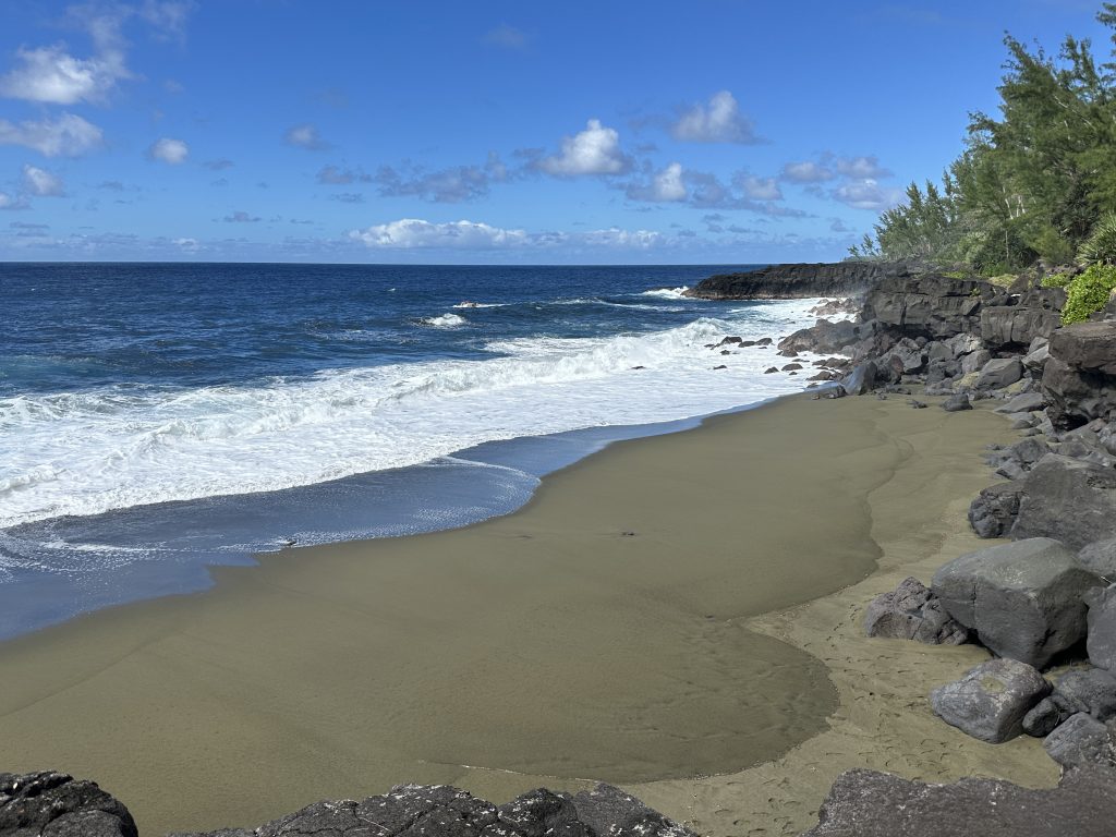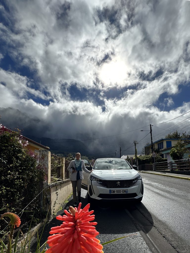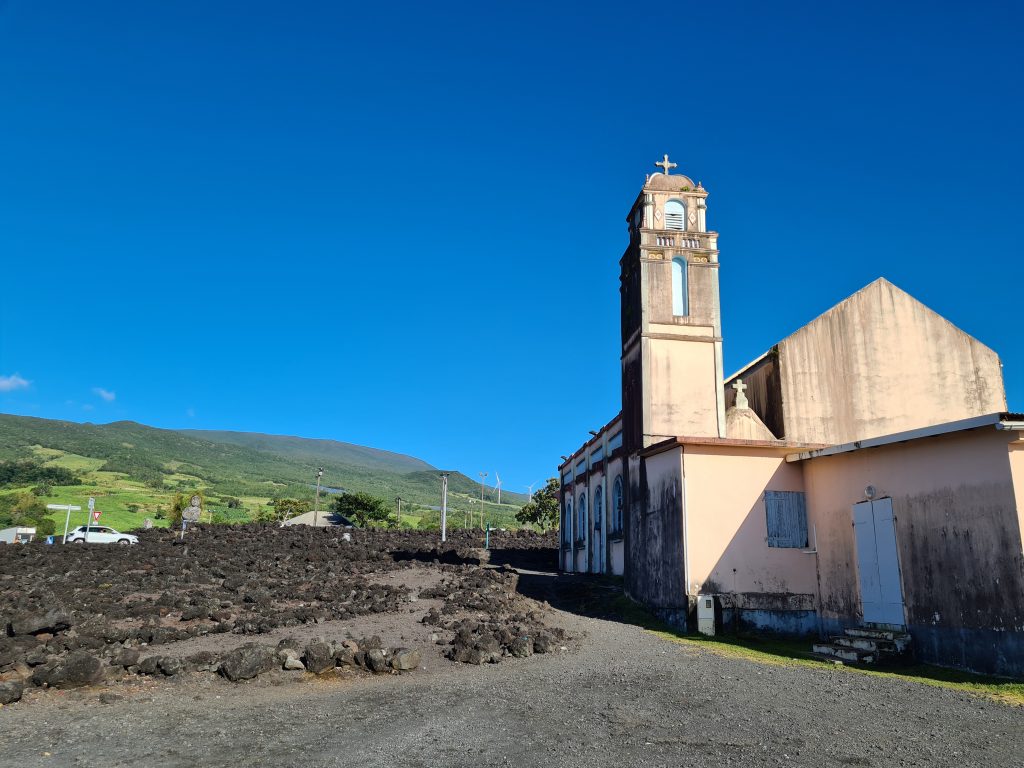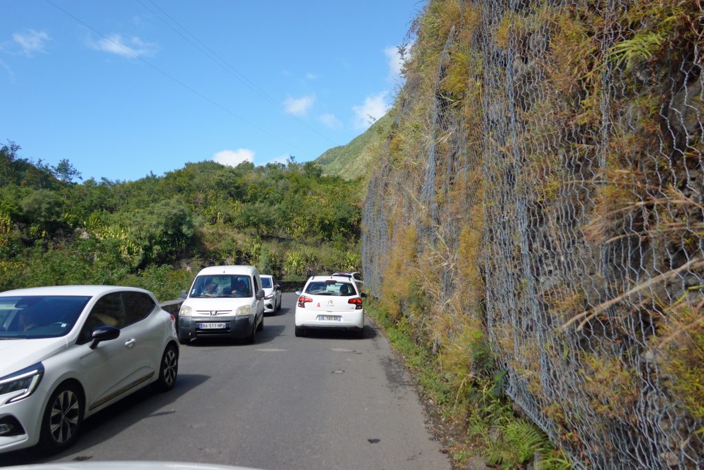 Der Tab beginnt mit blue sky. So frühstücken wir früh und fahren hoch zum Col de Boeuf. Oben erwartet uns bereits ein voller Parkplatz, immer noch Sonnenschein und wir entscheiden uns für die kurze Wanderung zum Col de Boeuf. Dann geht es wieder hinunter, unser nächstes Ziel ist der Vulkan. Heute wollen wir ihn erst einmal „inspizieren“ – morgen wollen wir ja zum Kraterrand gehen. So fahren wir zuerst einmal zum Pas de Belcombe, dem Startpunkt, und werfen einen ersten Blick auf den Weg, den wir uns für morgen vorgenommen haben. Irgendwie wirkt der Vulkan näher als gedacht, wie ein Katzensprung …, außerdem wundern wir uns, dass trotz der vielen Autos keine Wanderer zu entdecken sind. Auf jeden Fall ist es recht frisch und windig. Aus dem Drohneneinsatz auf der Pleine de Sables wird also nichts und filmen stattdessen mit der GoPro. Bei einem zweiten Flugversuch „spinnt“ plötzlich die Belichtung, es bleibt also beim „no flight!“ Beim Runterfahren stoppen wir noch beim Cratère Commerson und steuern dann unsere Lodge „L’enclos du volcan“ an. Die Begrüßung ist recht originell, da unser French nicht für die Verständigung ausreicht und die Eigentümerin kaum des Englischen mächtig ist. Der Googleübersetzer offenbart aber die Überraschung des Tages: Der Vulkan kann aufgrund eines Bergsturzes am 5. August aktuell nicht begangen werden. So ändern sich unsere Pläne für morgen von einer Sekunde auf die andere. Statt Angst vor dem Zusammenbruch beim Wandern fahren wir noch einmal zurück und werden die restliche Ostküste unter die Lupe nehmen. Hauptziele morgen sind also: die L’Eglise de Notre Dame des Laves, das Tresta Star Wrack und die berühmten Cascade Grand-Galet, die eigentlich jeder in seinem Réunion-Urlaubsportfolio hat.