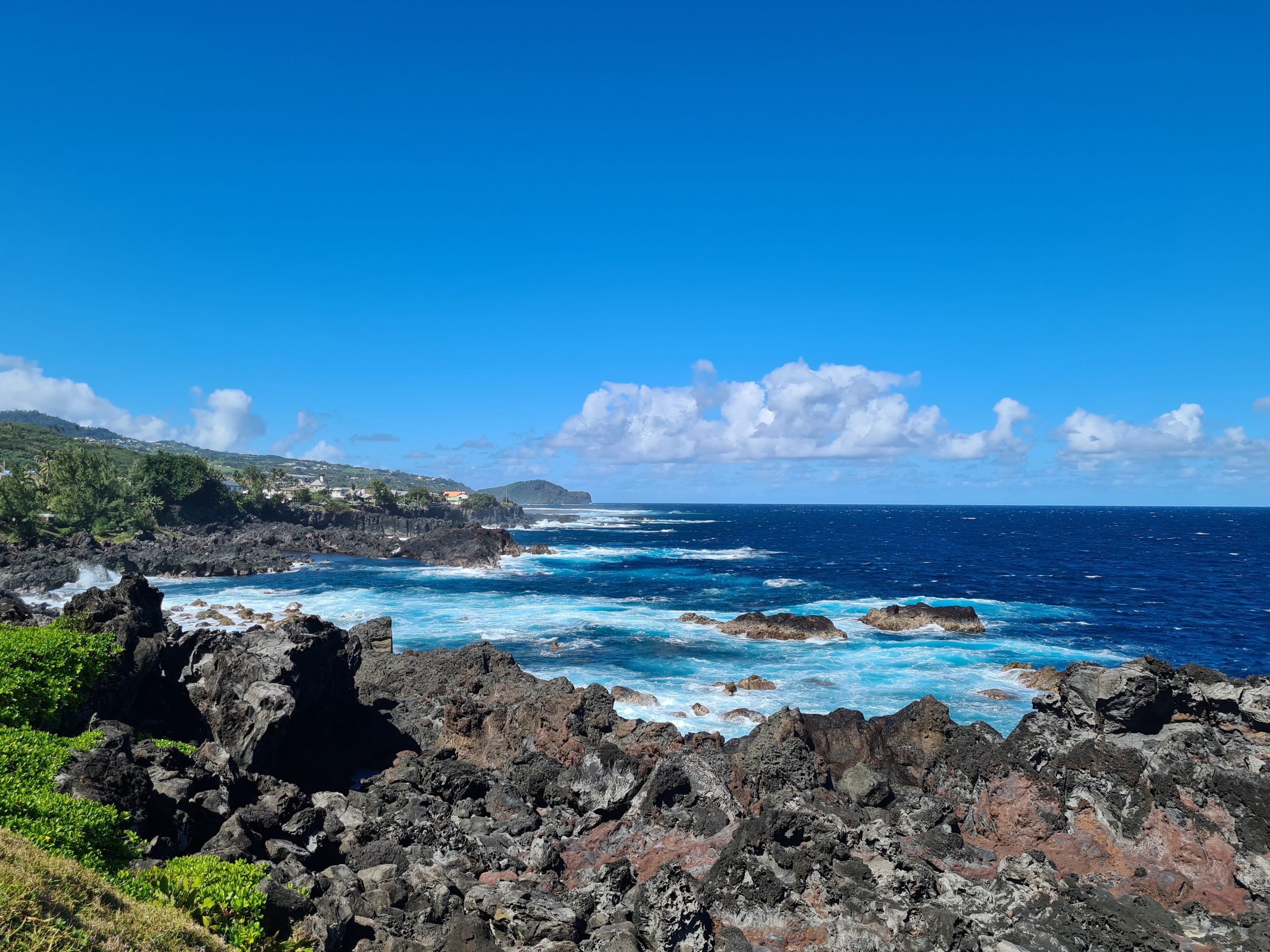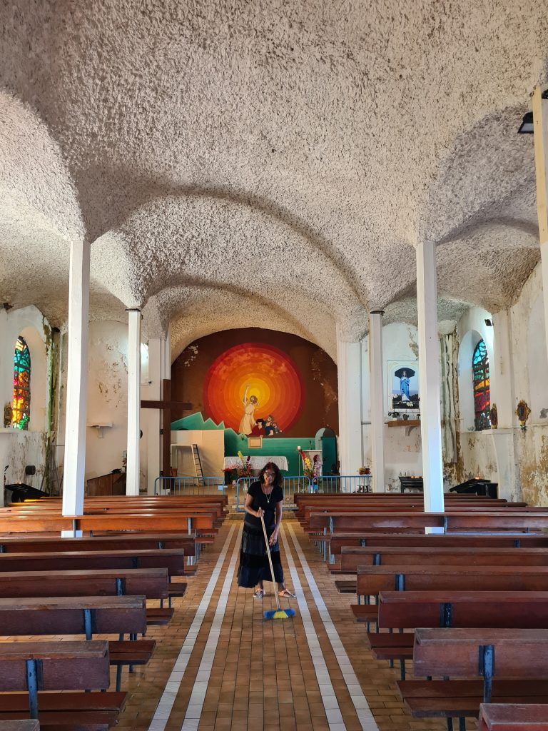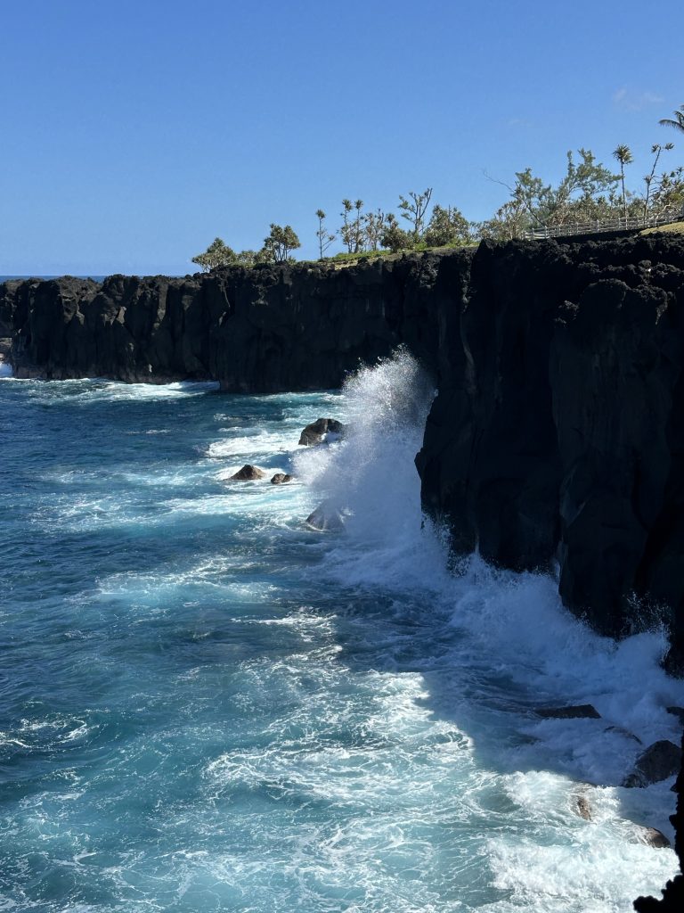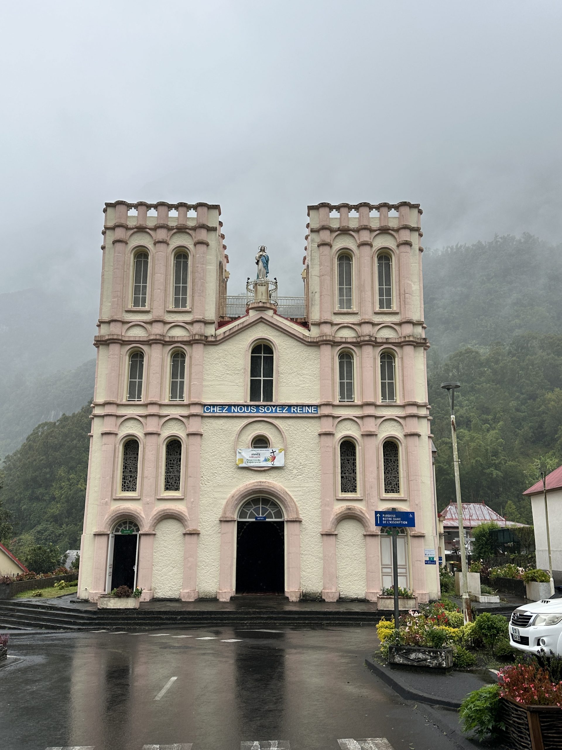 Der Tab beginnt mit blue sky. So frühstücken wir früh und fahren hoch zum Col de Boeuf. Oben erwartet uns bereits ein voller Parkplatz, immer noch Sonnenschein und wir entscheiden uns für die kurze Wanderung zum Col de Boeuf. Dann geht es wieder hinunter, unser nächstes Ziel ist der Vulkan. Heute wollen wir ihn erst einmal „inspizieren“ – morgen wollen wir ja zum Kraterrand gehen. So fahren wir zuerst einmal zum Pas de Belcombe, dem Startpunkt, und werfen einen ersten Blick auf den Weg, den wir uns für morgen vorgenommen haben. Irgendwie wirkt der Vulkan näher als gedacht, wie ein Katzensprung …, außerdem wundern wir uns, dass trotz der vielen Autos keine Wanderer zu entdecken sind. Auf jeden Fall ist es recht frisch und windig. Aus dem Drohneneinsatz auf der Pleine de Sables wird also nichts und filmen stattdessen mit der GoPro. Bei einem zweiten Flugversuch „spinnt“ plötzlich die Belichtung, es bleibt also beim „no flight!“ Beim Runterfahren stoppen wir noch beim Cratère Commerson und steuern dann unsere Lodge „L’enclos du volcan“ an. Die Begrüßung ist recht originell, da unser French nicht für die Verständigung ausreicht und die Eigentümerin kaum des Englischen mächtig ist. Der Googleübersetzer offenbart aber die Überraschung des Tages: Der Vulkan kann aufgrund eines Bergsturzes am 5. August aktuell nicht begangen werden. So ändern sich unsere Pläne für morgen von einer Sekunde auf die andere. Statt Angst vor dem Zusammenbruch beim Wandern fahren wir noch einmal zurück und werden die restliche Ostküste unter die Lupe nehmen. Hauptziele morgen sind also: die L’Eglise de Notre Dame des Laves, das Tresta Star Wrack und die berühmten Cascade Grand-Galet, die eigentlich jeder in seinem Réunion-Urlaubsportfolio hat.