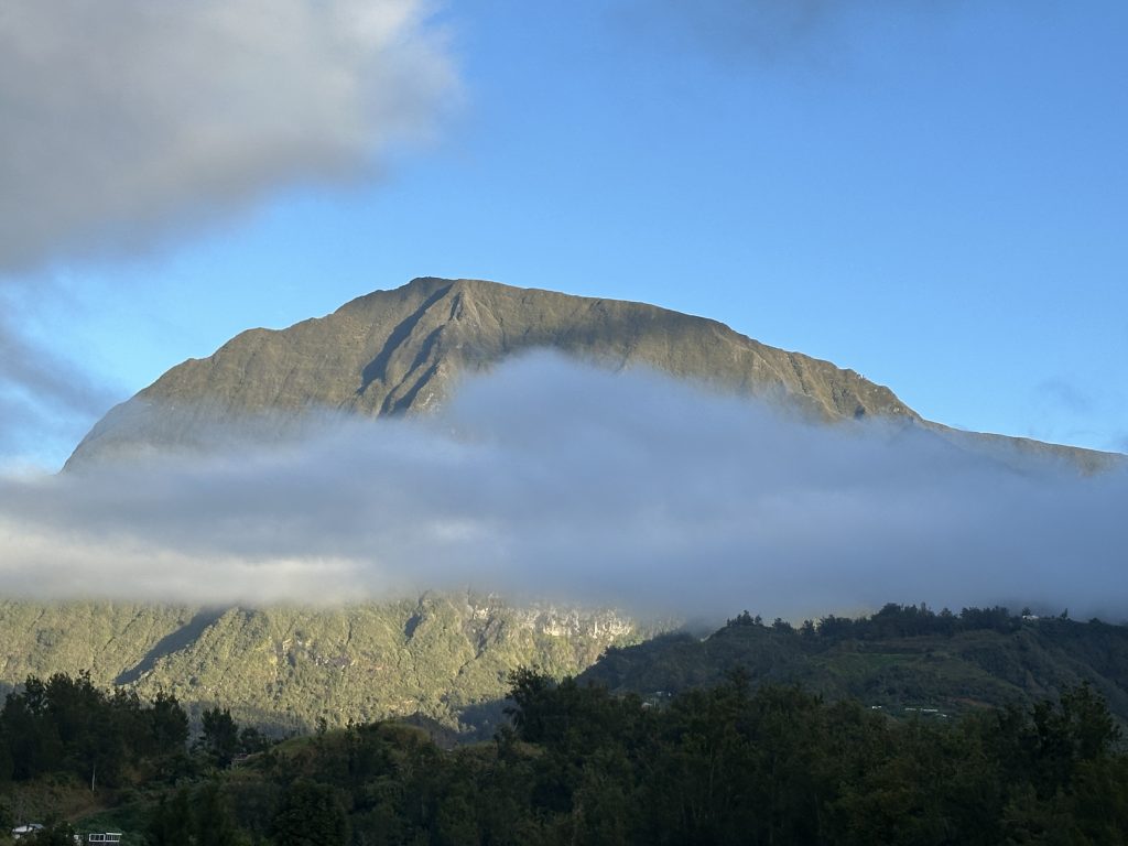 Pascal bringt das Frühstück um 07:20 Uhr, einen Fruchtsalat, ein halbes Baguette, vier Stück homemade cakes und zwei Gläser homemade, recht saueren Jogurt. Kurz nach 8 Uhr brechen wir gen Maïdo …