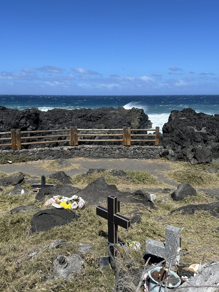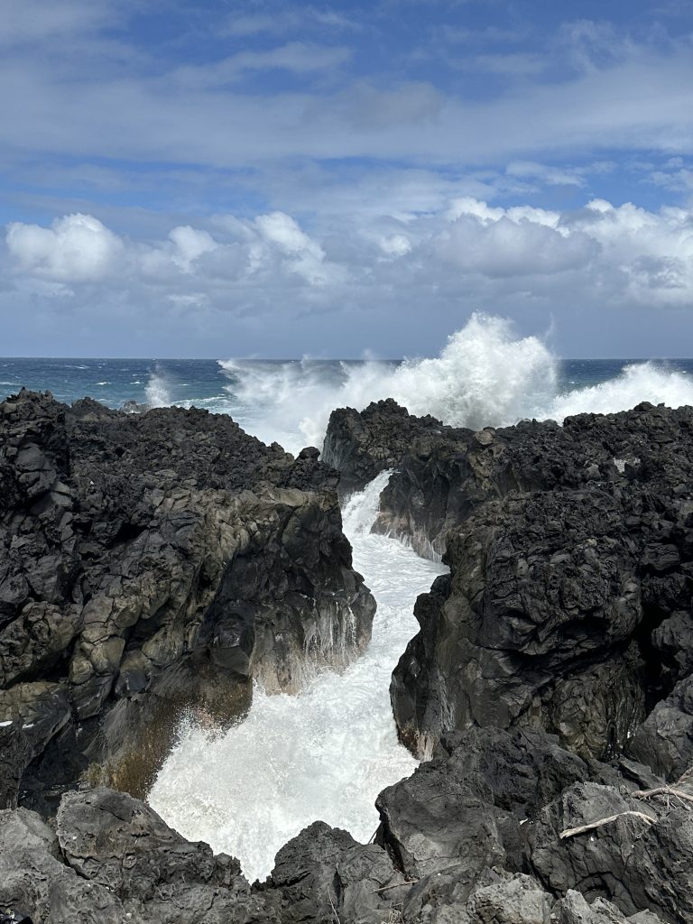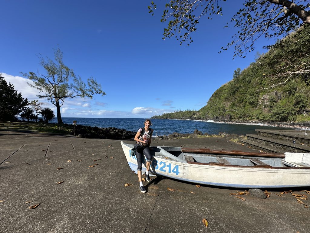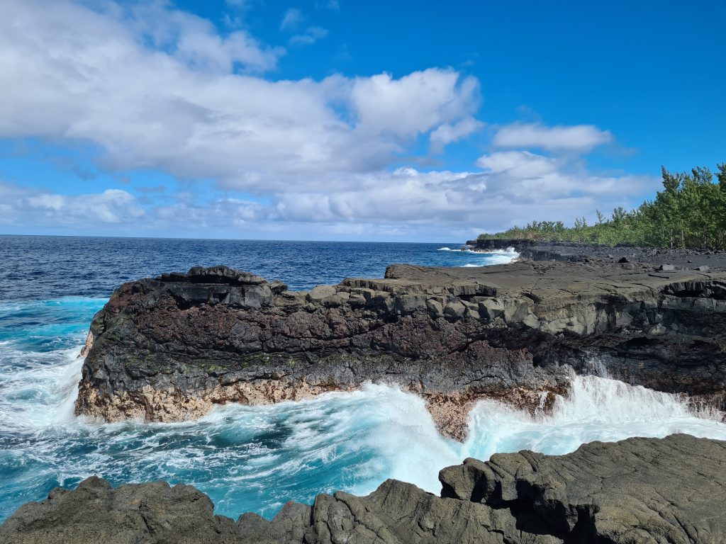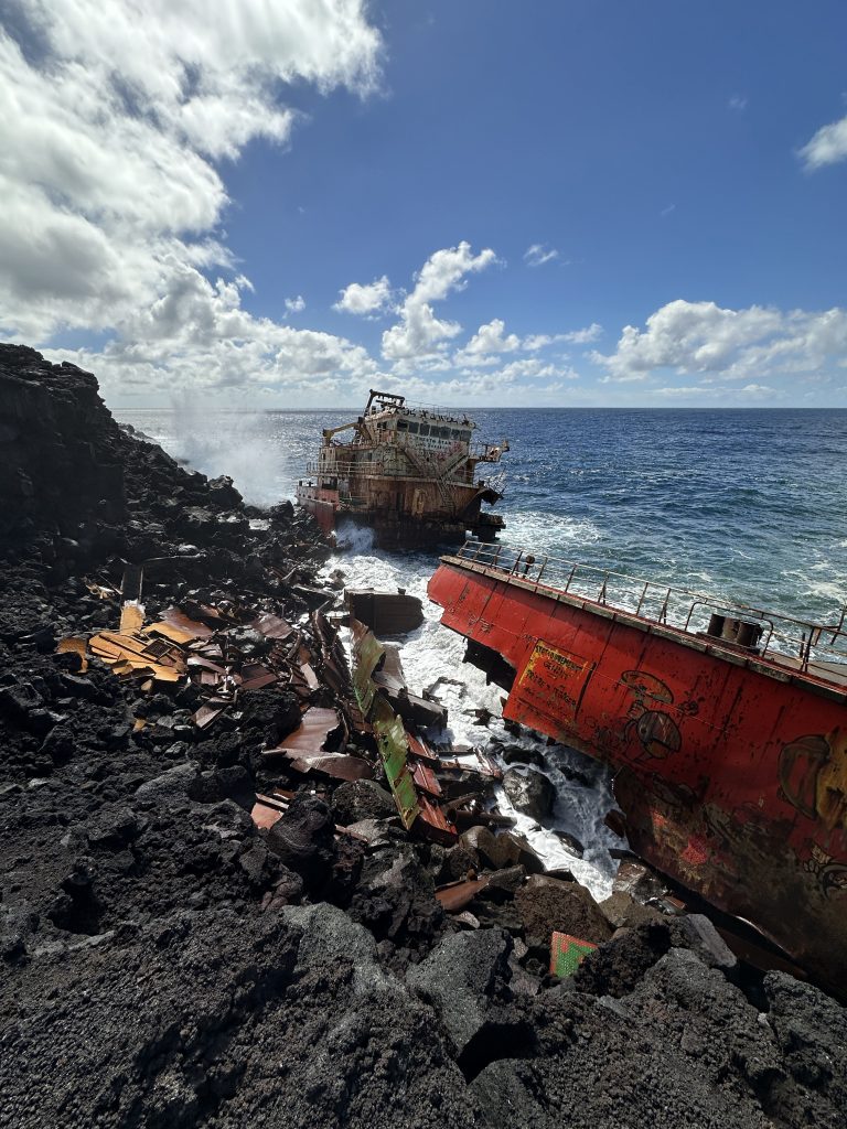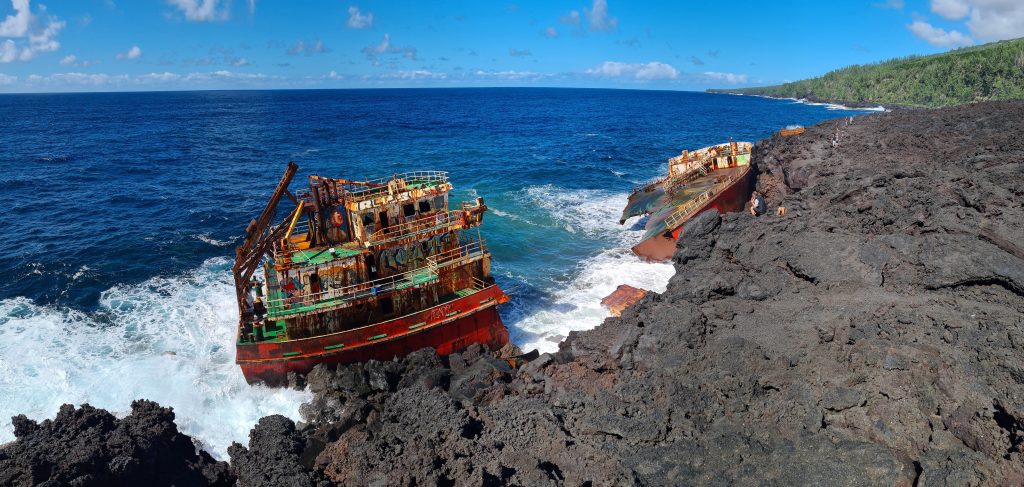 Wir frühstücken im Frühstücksraum um die Ecke eher „sparsam“. So verlassen wir L’enclos ohne Vulkanexperience und sind heilfroh, dass wir eine Nacht schon von zuhause aus gecancelt hatten und stattdessen eine Nacht im Palm Hotel & Spa „eingeschoben“ haben. Das Wetter „spielt“ mit und nach gut 50 km erreichen wir Notre Dames des Laves. Innen hui, außen etwas Fake: Innen ist die Kirche wirklich beeindruckend, ein beeindruckendes Gemälde an Stelle eines Hochaltars, wunderschöne bunte Kirchenfenster, der alte Boden und auch die Gebäudemauern von außen wirken noch „schlüssig“ auf uns. Die die Kirche umgebenden Lavasteine wirken aber seltsam konstruiert, so, als man diese einfach nachträglich hier zum Zwecke der Legendenbildung aufgeschichtet hat. Danach stoppen wir nach kaum 3 Kilometern bei der Anse des Cascades. Links hinunter geht es zum Meer und uns erwartet eine perfekte Infrastruktur: ein breite „gepflegte“ Straße, die Verkehrsinseln frisch gemäht, große Parkplätze und sogar ein schon geöffnetes Lokal. Allerdings sind kaum Touristen vor Ort. So erfreuen wir uns an den vielen kleinen Wasserfällen, die von den Felsenwänden in den Bach zum Meer stürzen, gehen vorne zum Ufer und rutschen auf dem Teer, auf dem die Boote zu Wasser gelassen werden können, noch fast aus. Dann steht das nächste „größere“ Ziel auf dem Plan: das gut 20 km entfernte Schiffswrack. Aus der „Kurzwanderung“ wird überraschend doch ein etwas längerer Hike, denn „unten“ darf man nicht parken, worauf uns ein französisches Ehepaar hinweist. Die Freude über den dort gefundenen Parkplatz löst sich also in Luft aus. Wir fahren also auf dem Sträßelchen wieder nach oben, parken oben rechts an der Hauptstraße und machen uns zu Fuß auf den Weg. Anfangs entlang der genannten forest road, dann 50 Höhenmeter auf einem Pfad nach unten fast zum Meeresufer und dann manchmal etwas leicht kletternd auf den zerklüfteten Lavasteinen zur Terra Star. Gerade die beiden letzten Etappen erweisen sich keineswegs als harmloser Sonntagsspaziergang. In zwei Teile zerrissen liegt das Wrack direkt am Ufer, verrostet, bunt lackiert mit vielen Grafittis, quietschend, wenn größere Wellen auf das Schiff treffen. Sehenswert – und gut frequentiert. Ein Geheimtipp ist dieses Schiffswrack auf jeden Fall nicht mehr. Der Weg zurück geht dann doch in die Beine und so erreichen wir mit dem Vorsatz, möglichst schnell ins vornehmere Palmhotel zu fahren, unseren Peugeot. Einen Kurzstopp bei einer natural bridge lassen wir uns aber nicht entgehen. Das Palm Hotel&Spa erreichen wir gegen 14:30 Uhr. Valet-Parking, kein Kofferschleppen, ein Begrüßungsgetränk, eine Kurzführung über das Hotelgelände, eine tolle Lage mit ebensolchem Blick auf das Meer und ein Deutsch sprechender Receptionist. Unser Zimmer, Nr. 61, ist eigentlich wunderschön, geräumig, mit Terrasse, aber von einem Zaun umgeben und ohne Blick. Unzufrieden sind wir aber nicht, denn im Vergleich zum L’enclos-Zimmerchen residieren wir hier dennoch wie die Könige. Bei unserer Privattour durchs Hotel essen wir noch einen italienischen Salat für über 20 € und gönnen uns sogar noch einen Latte Macchiato plus Pina Colada plus Mohito. Das Angebot der „normalen“ Speisekarte hat uns nach den Sarana-Erfahrungen eher abgeschreckt.