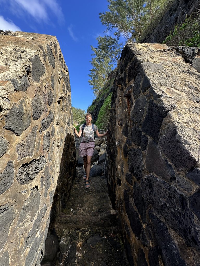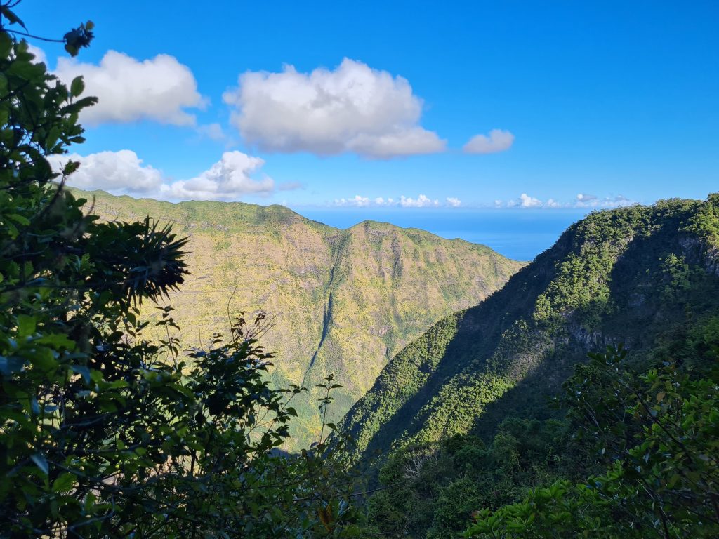 Das Frühstück gleicht dem des Vortags, das Tagesziel ist die Wanderung Canalisation des Orangers. So brechen wir wieder um kurz nach 8 Uhr auf, gen Norden, genauer gesagt zum Örtchen Sanssoucis, dem Startpunkt unseres Hikes. Wieder werden wir von den zahlreichen parkenden Fahrzeugen am Straßenrand überrascht, finden aber selbst eine Parklücke nur wenige Meter vom Ausgangspunkt entfernt. So stampfen wir los, zunächst 100 Meter nach oben auf einem Pfad und dann 1,8 Kilometer auf einem vielleicht 2 Meter breiten langsam ansteigenden Weg. Anfangs noch ohne zu jammern, weil man ohne auf den Weg zu achten einfach dahingehen kann, irgendwann fordert die Steigung ihren Tribut. „Wie lange noch? Wann beginnt endlich der Weg?“ Die ersten Schweißperlen erscheinen auf der Stirn, bis man endlich den wirklichen Wanderweg erreicht hat. Von nun an wird es ebenerdig und wir marschieren – nun wohlgelaunt – auf einem ein Meter breiten Pfad mit weichem Heu als Untergrund und mit faszinierenden Blicken tief hinunter zum Flussbett des Riviere des Galets bzw. entlang der steilen, tiefgrünen Remparts (= Steilhänge). Eigentlich eine Traumwanderung, mit insgesamt 17 km aber doch zu lang für uns. Auf jeden Fall behalten wir den Vorsatz ca. 3 km in dieses beeindruckende Tal hineinzugehen, das zu den Ortschaften im Cirque de Mafate führt, bei. Der Weg erstreckt sich entlang der Kanalisationsrohre für diese abgeschiedenen Orte direkt am „rechten“ Steilhang des Tals in einer Höhe, dass man sogar auf das eine oder andere Touristenbesichtigungskleinflugzeug hinabsehen kann. Die Mühen der anfänglichen Steigung sind auf jeden Fall rasch vergessen und wir gehen und gehen und gehen, bis wir zur Erkenntnis gelangen, dass sich die Perspektive und unsere Eindrücke von dieser so beeindruckenden Umgebung nicht mehr groß ändern können. Wir drehen um und blicken nun hinaus in Richtung Meer. Unser Auto erreichen wir gegen 12:20 Uhr, fahren wieder hinunter nach Saint Paul und über kleine Straßen durch Boucan Canot mit einem Stopp an einer Boulangerie zurück zum Poz Lagon. Den Abend verbringen wir fast schon gewohnt: Jacuzzi samt anschließendem Baguette mit Schinken und Rotwein.