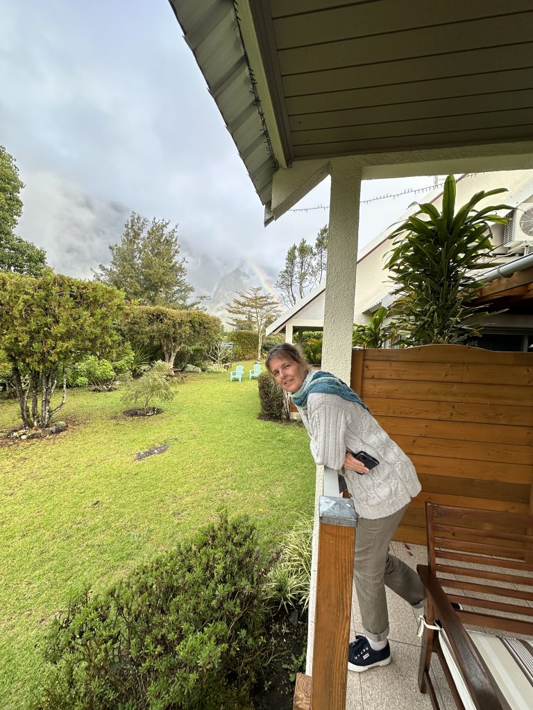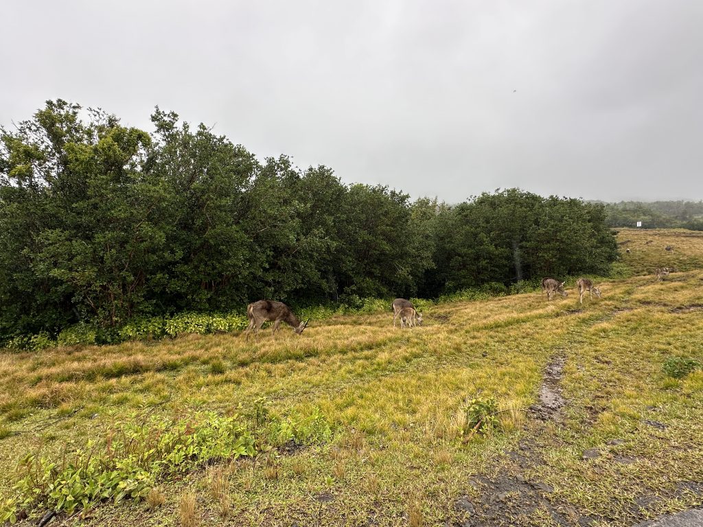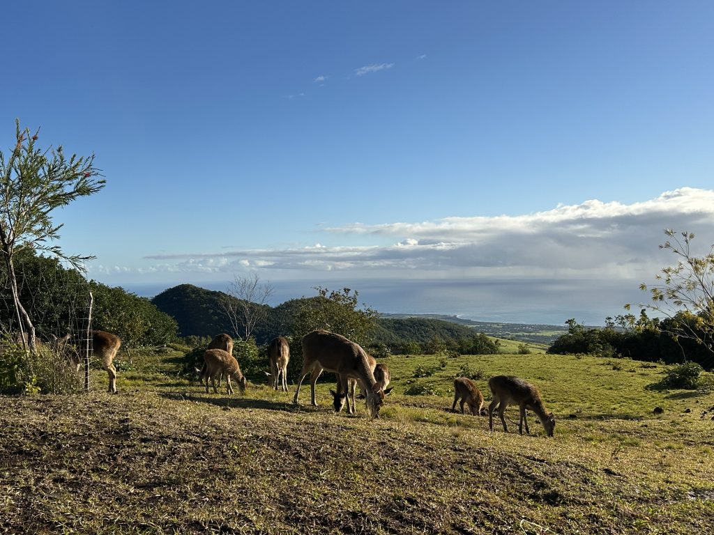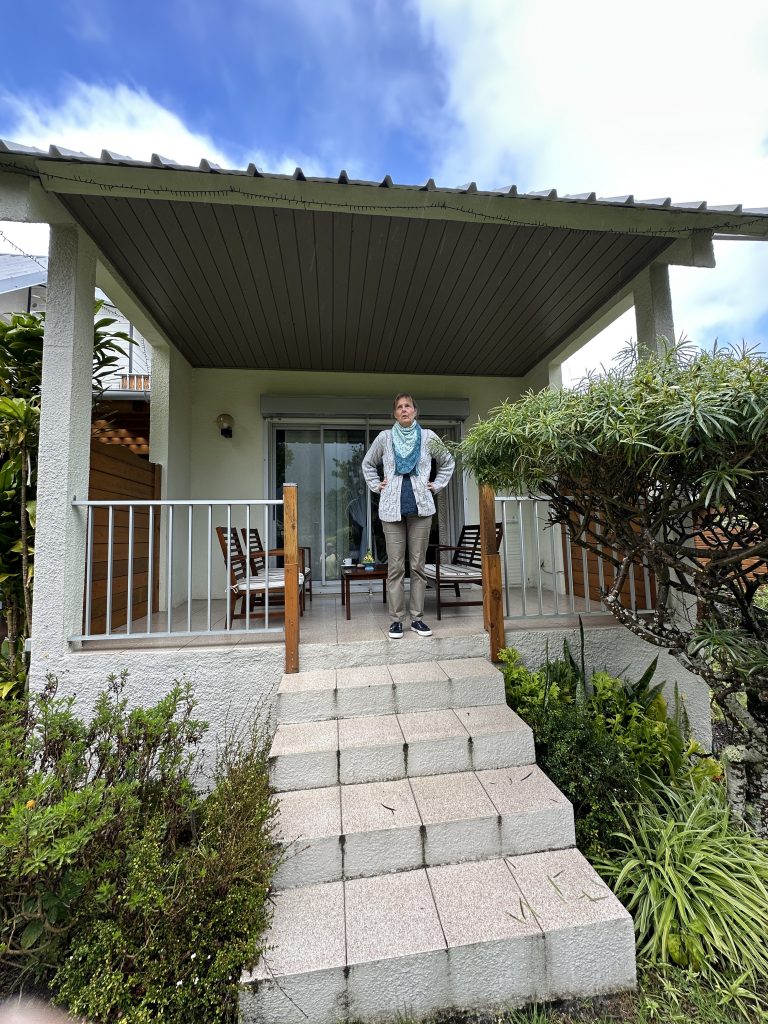 Heute verlassen wir das Boucan Canot, fliegen in der Früh vor dem Frühstück noch mit der Drohne und machen uns gen Süden in die Diana Dea Lodge & Spa auf. Es beginnen also die letzten Rèuniontage. Das Hotel Boucan Canot wird uns wohl nie mehr wiedersehen, es wäre für eine Nacht OK, die „Kakerlakengäste“ am Balkon abends haben aber bei uns keine Freudestränen ausgelöst. Große Stopps sind nicht vorgesehen, ein Zweitbesuch bei der Grande Anse und das Cap Mechant mit dem butterweichen Grasteppich und „einem“ – nicht „dem“– Souffleur und einer Arch. Diana Dea erreichen wir bei Regenwetter im Nebel, die scheinbar berühmt-berüchtigte Straße hoch mag zwar phasenweise eng sein, für uns stellt sie kein Problem dar. Nach einem Tor samt der Bezeichnung „one of the leading hotels of the world“ begegnen uns die hoteleigenen Hotelhirsche und beim Parkplatz bereits ein Angestellter mit Schirm. Man spricht mehrsprachig, französisch, englisch und deutsch, alles wirkt „vornehm“, man kümmert sich um einen, alles ist superschön. Von wirklicher Wohlfühlatmosphäre samt Herzlichkeit spüren wir aber nichts. Zum Dinner haben wir uns Gott sei Dank nicht überreden lassen und bleiben beim Zimmerdinner mit Rotwein und dem irgendwann vormittags besorgten Baguette. Unser Zimmer – Nr. 24 – ist übrigens verdammt klein. Wäre der Badbereich nicht offen gestaltet, besteht bei längerem Aufenthalt die Gefahr, dass einem die Decke auf den Kopf fällt.