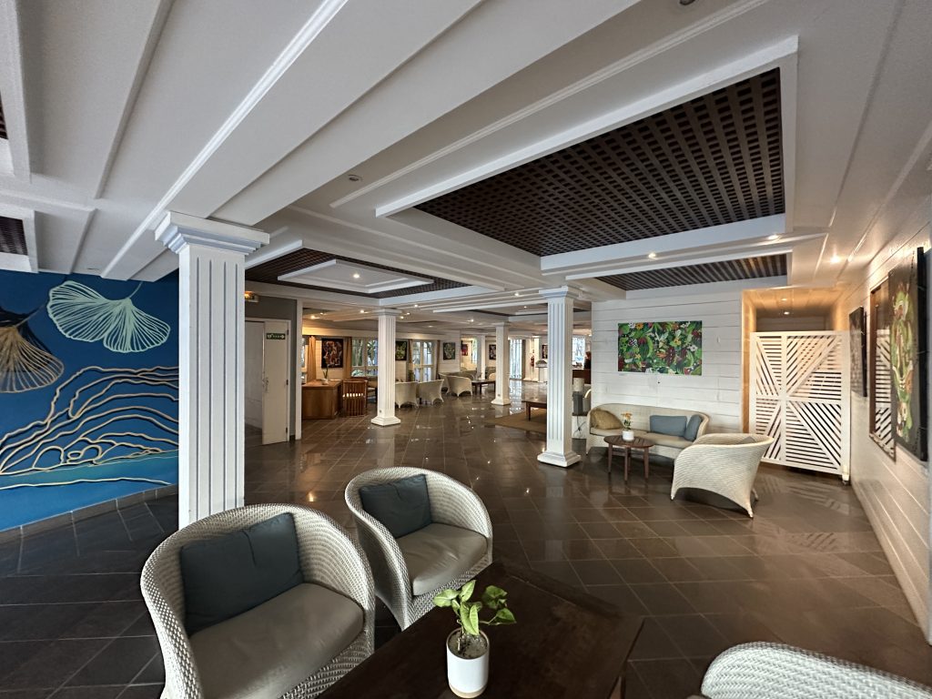 Der übliche, familieninterne Abflugstress beginn schon vor dem Frühstück. Wahrscheinlich wären wir schon um 5 Uhr im Frühstückssaal gesessen, wenn es dieses schon gegeben hätten. So sitzen wir erst um 6:35 Uhr als erste Gäste im riesigen Restaurant und das Angebot ist gut. Als „one-of-the-world-leading-hotels“ hat es allerdings noch Entwicklungspotenzial: das „Süße-Teilchen-Angebot“ ist überschaubar, der Kapsel-Cappuccino ist bestenfalls durchschnittlich. Angesichts des heute sonnigen Wetters gehen wir danach auf die Terrasse zum Pool und inspizieren das leading hotel im Sonnenschein. Auf jeden Fall ist die glasdominierte Architektur inmitten der grünen Landschaft wirklich beeindruckend. Noch vor 8 Uhr verlassen wir das Hotel, tanken nochmals kurz und geben gegen 9 Uhr das Auto ab. Es bestätigt sich, dass die vierstellige Nummer, die wir beim Abholen des Autos erhalten haben, für das Wiedereinfahren in den Rental-Car-Bereich dient. Unter die Lupe genommen wird unser Peugeot nicht. Man gibt den Schlüssel am Schalter ab, wird gefragt, ob der Tank voll ist und dann war es das auch. Erfreulich ist, dass der „Schaltermann“ von Air Mauritius ungewöhnlich ist: humorvoll, lustig, freundlich und angesichts der 8 kg statt der 7 kg beim Handgepäck auch nicht kleinkariert. Nun warten wir beruhigt und ohne den mittlerweile abgeklungenen Abreisestress „stundenlang“ auf den Abflug. Um 12:05 Uhr soll er abheben. Er ist sogar früher dran als erwartet, fast hätten wir – und das will schon etwas heißen – das Boarden verpasst. Noch vor 1 Uhr verlassen wir nach knapp 30 Minuten Flug – den Flughafen von Mauritius und steuern zielgerichtet wie erfahrene Hasen den uns schon bekannten Schalter 4 an – und man glaubt es kaum – wir erhalten den gleichen Pickup vom gleichen Serviceman wie am 7. August. Von der ersten Sekunde – egal, ob Auto oder auch die Dörfer, die wir durchfahren – this is not Europe. Eineinhalb Stunden später erreichen wir das Dinarobin. Eine riesige Anlage mit höchst professionellem Begrüßungsprozedere – so empfinden wir. Allerdings dauert es seine Zeit, bis man „ankommt“. Der erste Strandspaziergang von unserer geräumigen Zensuite – Nr. 673 – und der erste Poolbesuch im Adult’s Only-Bereich helfen uns aber über die erste Dinarobinnovizenunsicherheit hinweg. Nach dem Duschen widmen wir uns dem Sunset, ehe wir erstmals hier zum Essen gehen. Das Buffet ist riesig, die Desserts finden erwartungsgemäß den größten Anklang bei uns.