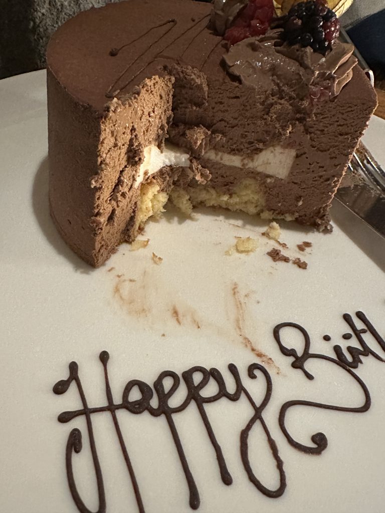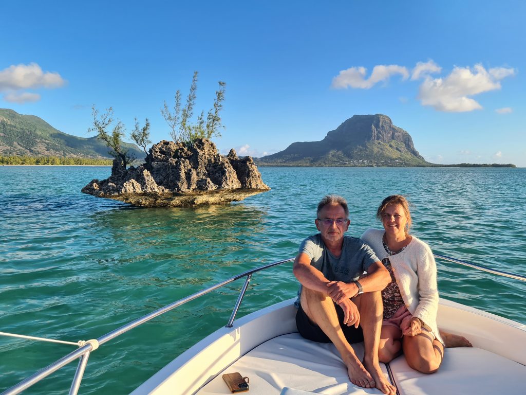 Birthday- und Weddingday: Der Tag beginnt nach einer mückengeplagten Nacht mit einem Strandspaziergang nach der zimmereigenen ersten Tasse Kaffee. Aus dem Early-Birders-Drohneneinsatz wird aber nichts, da die Wachmänner schon patrouillieren bzw. auch der Wind recht stark ist. Das Frühstück im Harmony-Buffet ist wirklich super, vor allem die kalorienbombenhaftige schneeweiße und von der Konsistenz etwas festere Schlagsahne stößt – zusammen mit dem gereichten Kompott – auf unser Interesse. Erfreulich ist auch, dass man nicht stundenlang darauf warten muss, bis der Kaffee nachgeschenkt wird. Heute bilden Gris Gris samt Le Roche qui pleure und die Cascades Mamselle unseren Ausflugsschwerpunkt. Bevor wir losfahren, buchen wir beim Concierge für den Nachmittag noch eine Bootsfahrt entlang der Südwestküste. Irgendwie „zieht“ sich die Anfahrt. Bei Gris Gris angekommen verläuft der Weg zum Roche qui pleure anfangs oberhalb des Strands, ist aber leicht gefunden. So ganz allein sind wir beim Gehen trotz der noch wohl noch schlafenden Touristen nicht, denn wir werden phasenweise von einem vierbeinigen, treu blickenden, weißen Streunerhund begleitet. Dann geht es kurz vor einer Flussmündung etwas halsbrecherisch mit Befestigungsseil und wackliger Treppe nach unten zum Strand. Das besagte Bassin, von dem wir im Internet gelesen hatten, lassen wir im wahrsten Sinne des Wortes „rechts“ hinter uns liegen, da wir ohne Badesachen aufgebrochen sind und es für die Drohne hier auch zu windig ist. Stattdessen steuern wir eine kleine Nameless-Cascade an, die vielleicht 200 m davon entfernt – kurz nach besagter Mündung – ihren Weg ins Meer findet. Allerdings müssen wir dafür etwas über rechts spitze Lavasteine herumklettern, was dann doch wieder etwas nervt. Auffällig ist, dass Teile des Flusslaufes gemauert sind. Dann drehen wir um, es geht auf dem gleichen Weg, den wir gekommen sind, wieder nach oben. Nach ein paar Minuten easy way erreichen wir immer noch fast allein die Cascade Mamselle. Endlich können wir unser Fluggerät zum Einsatz bringen – unbeachtet und auch ohne technische Probleme. „Weniger privat“ kehren wir zu Gris-Gris-Parkplatz zurück – denn die erste Busladung angesichts der getragenen Kopftücher offensichtlich erkennbare muslimische Touristenschar ist unterwegs. Wir stoppen ein 2. Mal in diesem Urlaub bei den Rochesterfällen, wählen aber dieses Mal die andere Straße bzw. Flussseite. Nach einem Supermarktstopp – gekauft haben wir nur Getränke – sind wir gegen 14:30 Uhr in unserem mittlerweile schon vertraut gewordenen Dianarobin. A-little-bit 4-wheel-drive-feeling kommt – obwohl unser Pickup kein 4WD ist – bei der gewählten Sandpiste auf. Frischgemacht stehen wir gegen 15:20 Uhr vorne an der Rezeption und sind schon gespannt auf unsere Bootstour. Man begleitet uns zum Strand, ein kleines Motorboot kommt heran und schon geht es – mittlerweile barfuß – auf Lederpolstern halb liegend vorne vor dem Steuerrad samt Skipper los. Anfangs angesichts der 250 € noch mit leichten Zweifeln behaftet erweist sich diese Sunsettour als wunderschön. Wir sind allein an Bord, keine dumme Musik, zwei nette höfliche – Stichwort „Madame“ – und angenehm zurückhaltend erklärende „Begleiter“. Wir sehen die Küste, die berühmten Berge von der Wasserseite aus, Delphine und auch den wellknown Crystal Rock. Zum Sonnenuntergang gibt es noch Sekt samt Kanapees – genau so und nicht anders haben wir uns dies erhofft. Das Buffetabendessen verläuft zunächst wie am Vortag – incl. des Dessertschwerpunkts, findet aber noch ein Highlight. Ausgewählt als Dessert hatte sich das Geburtstagskind eine Mousse au Chocolat, ein kleines Törtchen, das wie sich herausstellen sollte, ebenfalls als eine „versteckte“ Mousse erweisen sollte, und eine Schokoladentart. Kaum ist alles mit schlechtem Kaloriengewissen verspeist kommt der Kellner und übergibt eine Geburtstagstorte samt kurz brennendem „Feuerwerk“. Nun folgt das Highlight: Es ist eine Chocolat-Mousse-Torte.