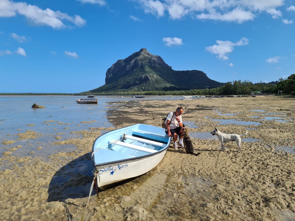 Nach dem mittlerweile schon fast zur Routine gewordenen Frühstück düsen wir per Mazda-Pickup entlang der Küste in Richtung Südosten, nur in der Absicht, diese hier so malerisch wirkende Dörfer filmisch und fotografisch festzuhalten. Highlight dabei ist wieder einmal ein Vierbeiner, der so vertrauenswürdig schauend trotz Spielkameraden unsere Nähe sucht. Dann drehen wir um gen Westküste mit dem Ziel Flic-en-Flac. Für uns ist dieser Trip im Nachhinein wichtig, denn er bestätigt, dass wir mit unseren Hotels weiter im Süden richtig gelegen sind. Flic-en-Flac gefällt uns überhaupt nicht, viele z. T. billig wirkende Hotels mit dazu passender Infrastruktur, und auch der Strand – zumindest der public beach – liegt weit unter dem Level von Dinarobin. Sozusagen haben wir Glück gehabt. Die Stimmen am öffentlichen Strand klangen übrigens sehr vertraut nach Good-Old-Germany. Folglich kehren wir gegen 13 Uhr zurück und verbringen mit einem Kurzbadebesuch im Meer und dem Beantworten der Glückwunschmails relaxt den Nachmittag. Irgendwann erfahren wir telefonisch, dass wir unser Zimmer morgen bis 16 Uhr nutzen dürfen. Zum Sonnenuntergang gönnen wir uns vorne am Meer noch einen Cocktail, ehe wir zum letzten Mal zum Dinner aufbrechen.