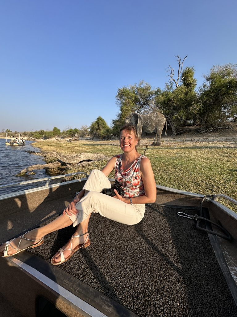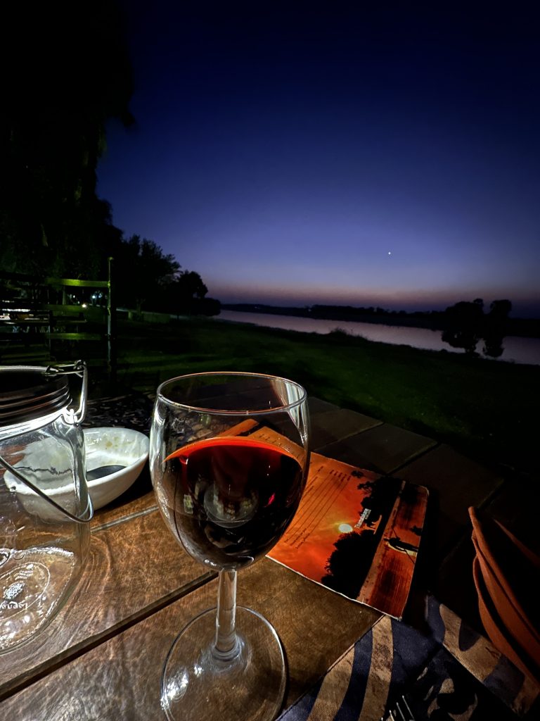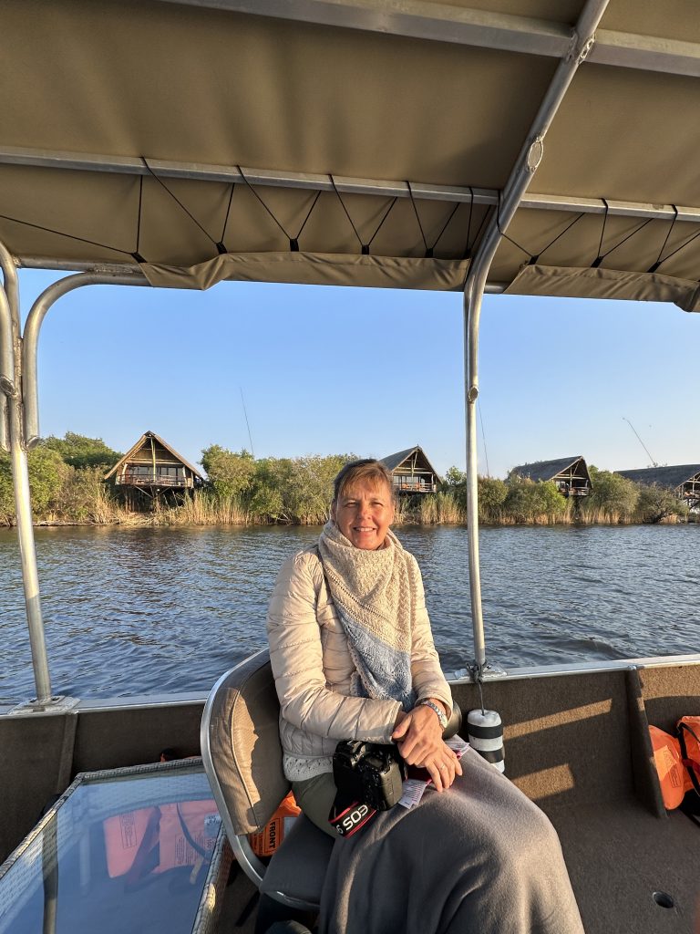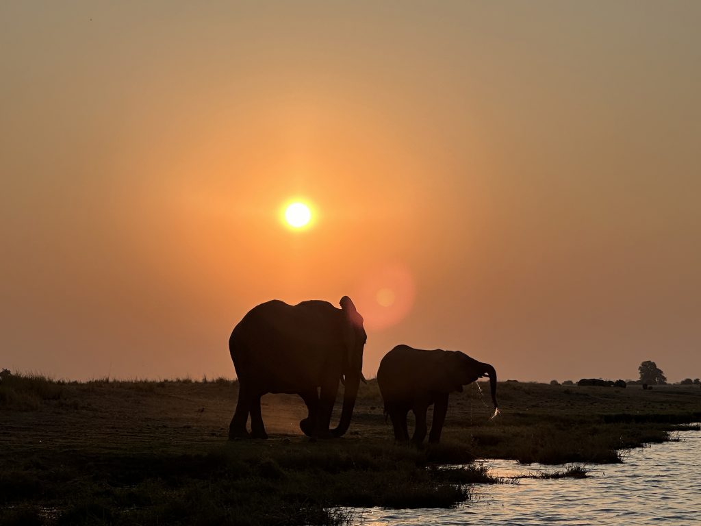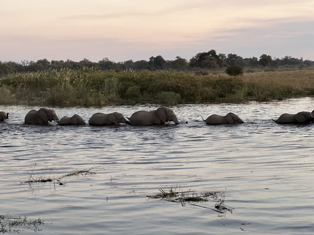 Frühstück geht wie zuletzt vonstatten, nur mit Trinkgeld für den extrem netten Azubi, der uns seit zwei Tagen mit Kaffee und Tee versorgt hat – und im Zimmer bekommt der schwarze, uns schon bekannte Kampftiger Zutritt zum Zimmer, was er zunächst neugierig inspiziert und dann für ein ungestörtes Schläfchen auf dem Bett nutzt. Gegen 9:30 Uhr wird er dann wieder nach draußen zwangsverfrachtet, weil wir unsere Zelte in der Chobe Marina abbrechen müssen. Kaum sind wir die Treppen unten, sieht er uns auf der obersten Treppenstufe mit leicht geneigtem Kopf traurig nach und bekommt dann Sekunden darauf vom Roomservice ein paar Schläge ab. Wahrscheinlich tut dies uns mehr weh als ihm. Dann geht es zum Airport. Wir parken auf einem Europcarplatz vor dem Hauptgebäude des doch recht überschaubaren Flughafens. Die Abholung von den Water Villas gestaltet sich leicht strange, die „Chefin“ verschwindet mit einem Europcarmitarbeiter, der ihr angeboten hat, zu telefonieren und plötzlich steht der Familienfahrer samt Gepäck und dem Water-Villas-Abholer einsam bei der Haupteingangstüre, ohne zu wissen, wo sich die Ehefrau befindet. Irgendwann biegt sie dann um die Ecke … Der Rest verläuft generalstabsmäßig: Emigration in Kasane – Bootsfahrt – Immigration für Namibia auf Impalila Island – Bootsfahrt – Krokodilbeschau – Water Villas – Begrüßungsgetränk und Konzert der gesamten Belegschaft. Wir sind die einzigen Gäste und werden wie Könige in Frankreich behandelt. Gerade waren wir beim Lunch und – obwohl wir auf das Hauptgericht verzichtet haben – satt. Greek salad und ein vorzügliches apple crumble bzw. eine Creme Caramel. Nun warten wir auf unserer Veranda oberhalb des Chobeseitenarms auf die Bootsfahrt incl. high tea. Unter high tea verstehen wir eigentlich etwas anderes als eine längliche Porzellanschale mit Essensangebot, auch der Gin & Tonic mit namibischem Gin war schon einmal besser. Das kann man kritisieren, wenn man will. Ansonsten ist die Fahrt sehr angenehm, los geht es mit Krokodilen am Wasserrande und natürlich mit Vögeln. Irgendwann sind wir parallel zur Chobe River Road und sehen all das, was wir von Land gesehen haben, nunmehr vom Wasser. Das sich darunter keine Löwen befinden, versteht sich von selbst, aber wir sind nah dran an den Elefanten, die sich am Ufer aufhalten, und logischerweise auch viel näher an den Hippos. Das Licht passt und je später es wird – bereits wieder auf dem Rückweg zur Lodge – sind es dann die Elefanten im Sunsetlicht, die uns begeistern. Um 18:15 Uhr sind wir dann zurück und bereiten uns auf das Dinner um 19 Uhr vor. Es schmeckt sehr sehr gut, Lachs mit – man höre und staune – schwarzen Nudeln. Davor gibt es frische, noch warme Semmeln, die „Grüße aus der Küche“ und als Dessert Creme Brûlée mit Cappuccinogeschmack, dazu sparkling water und einen Pinotage und ganz zum Schluss einen Pina Colada. Letzteres scheint für die Bar nicht alltäglich zu sein, denn er dauert relativ lange und schmeckt auch anderes als gewohnt.