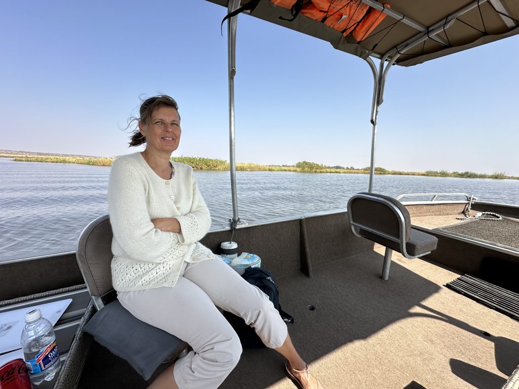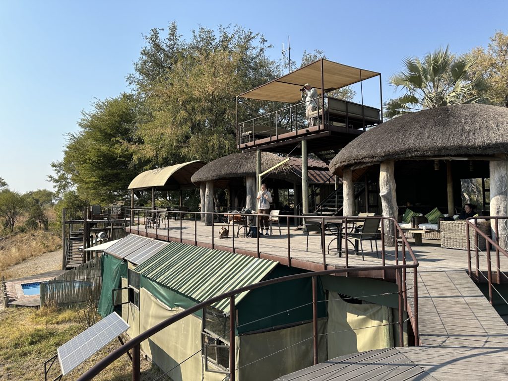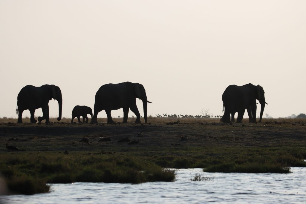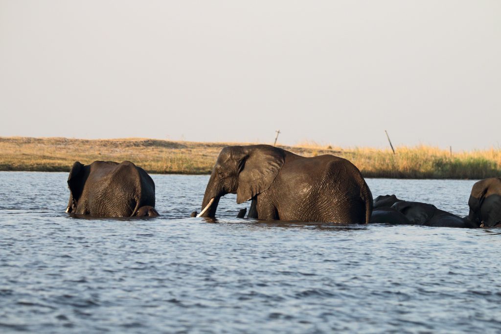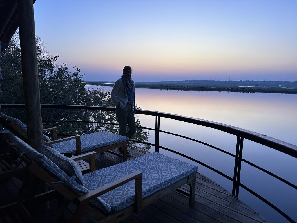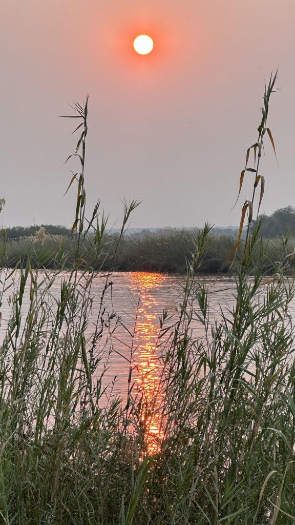 Frühstück geht wie zuletzt vonstatten, nur mit Trinkgeld für den extrem netten Azubi, der uns seit zwei Tagen mit Kaffee und Tee versorgt hat – und im Zimmer bekommt der schwarze, uns schon bekannte Kampftiger Zutritt zum Zimmer, was er zunächst neugierig inspiziert und dann für ein ungestörtes Schläfchen auf dem Bett nutzt. Gegen 9:30 Uhr wird er dann wieder nach draußen zwangsverfrachtet, weil wir unsere Zelte in der Chobe Marina abbrechen müssen. Kaum sind wir die Treppen unten, sieht er uns auf der obersten Treppenstufe mit leicht geneigtem Kopf traurig nach und bekommt dann Sekunden darauf vom Roomservice ein paar Schläge ab. Wahrscheinlich tut dies uns mehr weh als ihm. Dann geht es zum Airport. Wir parken auf einem Europcarplatz vor dem Hauptgebäude des doch recht überschaubaren Flughafens. Die Abholung von den Water Villas gestaltet sich leicht strange, die „Chefin“ verschwindet mit einem Europcarmitarbeiter, der ihr angeboten hat, zu telefonieren und plötzlich steht der Familienfahrer samt Gepäck und dem Water-Villas-Abholer einsam bei der Haupteingangstüre, ohne zu wissen, wo sich die Ehefrau befindet. Irgendwann biegt sie dann um die Ecke … Der Rest verläuft generalstabsmäßig: Emigration in Kasane – Bootsfahrt – Immigration für Namibia auf Impalila Island – Bootsfahrt – Krokodilbeschau – Water Villas – Begrüßungsgetränk und Konzert der gesamten Belegschaft. Wir sind die einzigen Gäste und werden wie Könige in Frankreich behandelt. Gerade waren wir beim Lunch und – obwohl wir auf das Hauptgericht verzichtet haben – satt. Greek salad und ein vorzügliches apple crumble bzw. eine Creme Caramel. Nun warten wir auf unserer Veranda oberhalb des Chobeseitenarms auf die Bootsfahrt incl. high tea. Unter high tea verstehen wir eigentlich etwas anderes als eine längliche Porzellanschale mit Essensangebot, auch der Gin & Tonic mit namibischem Gin war schon einmal besser. Das kann man kritisieren, wenn man will. Ansonsten ist die Fahrt sehr angenehm, los geht es mit Krokodilen am Wasserrande und natürlich mit Vögeln. Irgendwann sind wir parallel zur Chobe River Road und sehen all das, was wir von Land gesehen haben, nunmehr vom Wasser. Das sich darunter keine Löwen befinden, versteht sich von selbst, aber wir sind nah dran an den Elefanten, die sich am Ufer aufhalten, und logischerweise auch viel näher an den Hippos. Das Licht passt und je später es wird – bereits wieder auf dem Rückweg zur Lodge – sind es dann die Elefanten im Sunsetlicht, die uns begeistern. Um 18:15 Uhr sind wir dann zurück und bereiten uns auf das Dinner um 19 Uhr vor. Es schmeckt sehr sehr gut, Lachs mit – man höre und staune – schwarzen Nudeln. Davor gibt es frische, noch warme Semmeln, die „Grüße aus der Küche“ und als Dessert Creme Brûlée mit Cappuccinogeschmack, dazu sparkling water und einen Pinotage und ganz zum Schluss einen Pina Colada. Letzteres scheint für die Bar nicht alltäglich zu sein, denn er dauert relativ lange und schmeckt auch anderes als gewohnt.