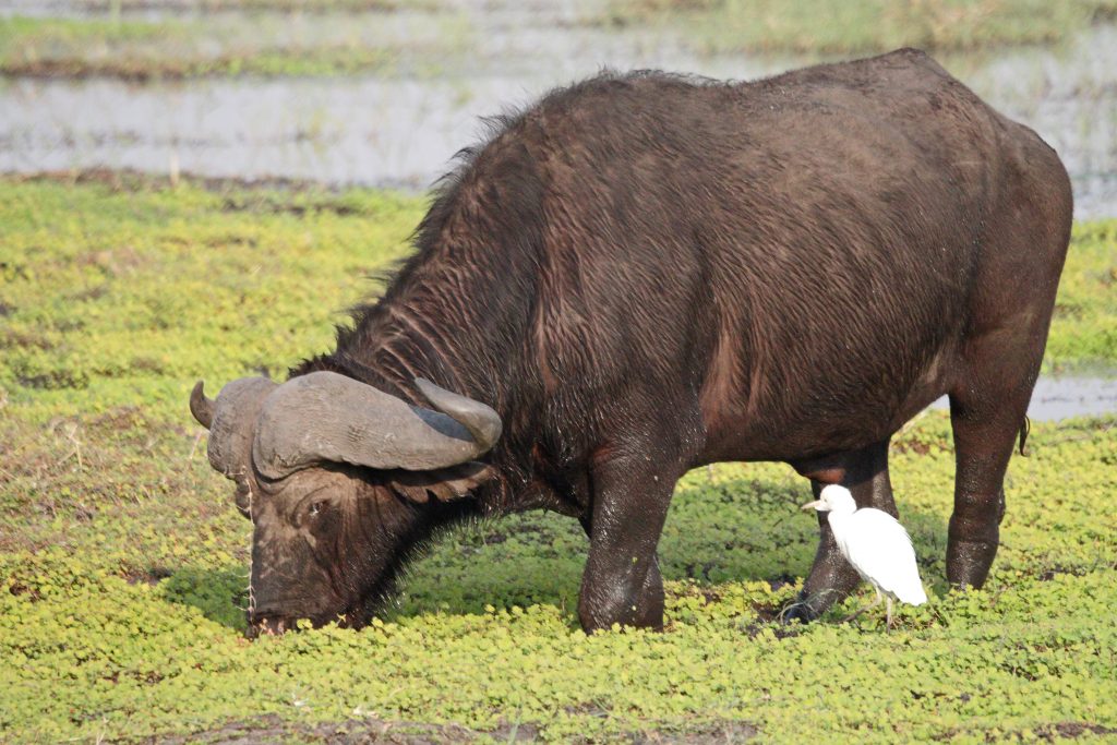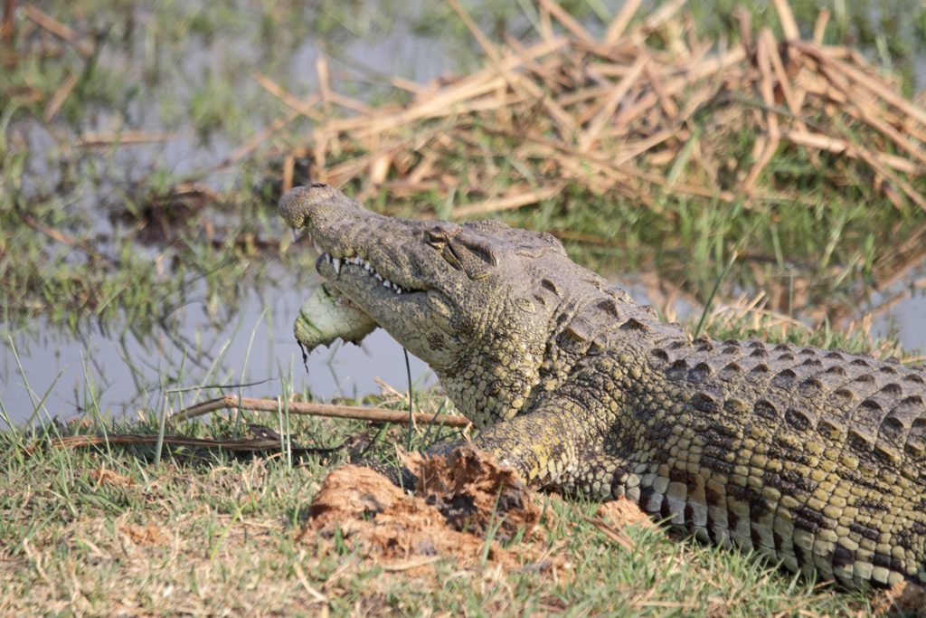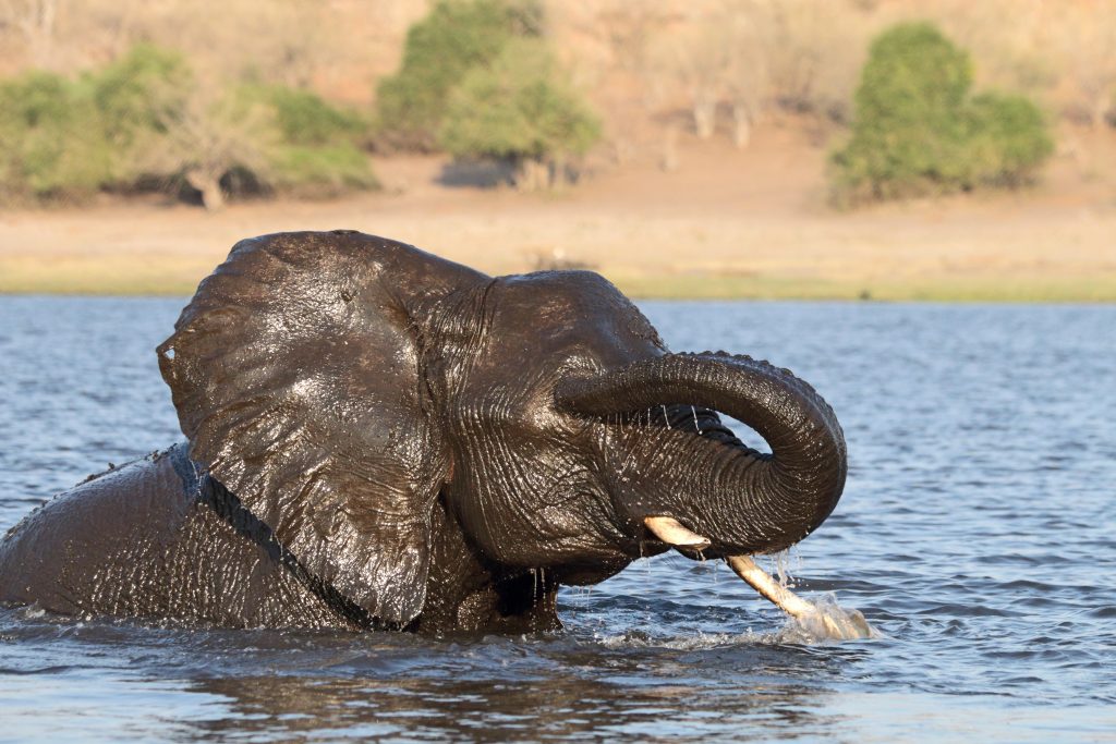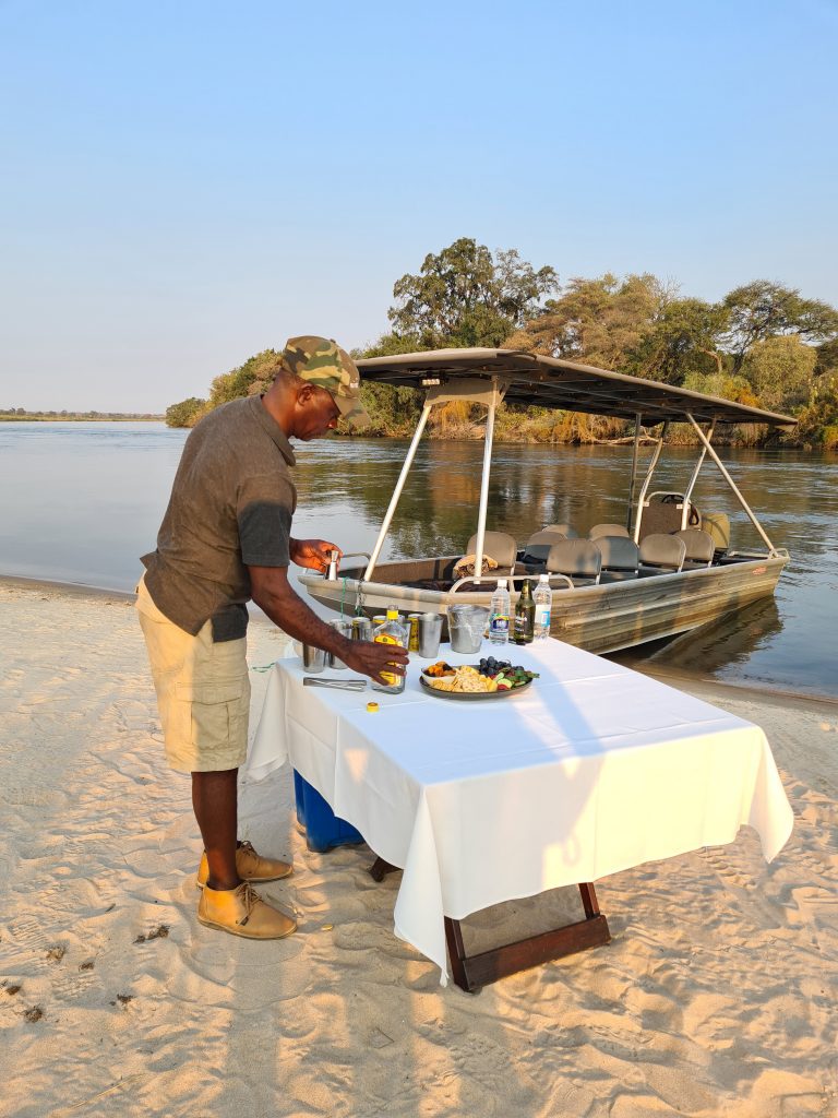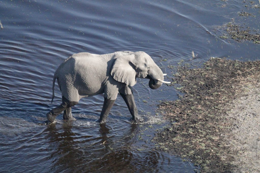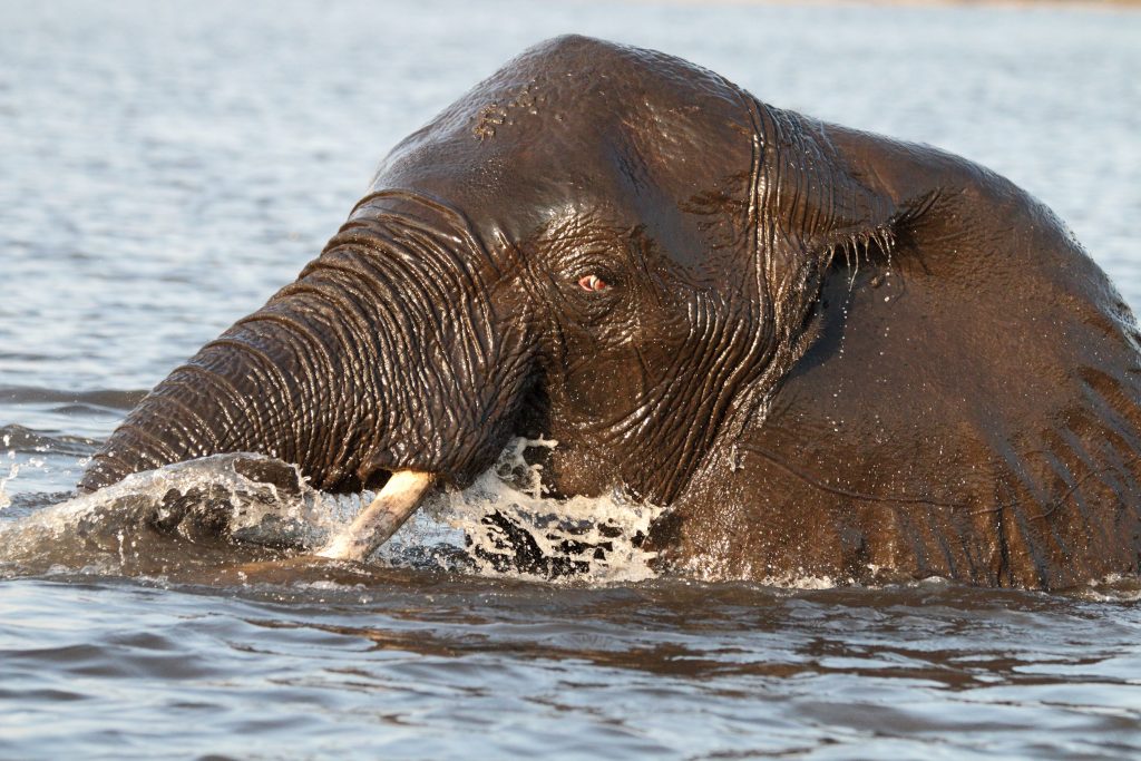 Frühstück geht wie zuletzt vonstatten, nur mit Trinkgeld für den extrem netten Azubi, der uns seit zwei Tagen mit Kaffee und Tee versorgt hat – und im Zimmer bekommt der schwarze, uns schon bekannte Kampftiger Zutritt zum Zimmer, was er zunächst neugierig inspiziert und dann für ein ungestörtes Schläfchen auf dem Bett nutzt. Gegen 9:30 Uhr wird er dann wieder nach draußen zwangsverfrachtet, weil wir unsere Zelte in der Chobe Marina abbrechen müssen. Kaum sind wir die Treppen unten, sieht er uns auf der obersten Treppenstufe mit leicht geneigtem Kopf traurig nach und bekommt dann Sekunden darauf vom Roomservice ein paar Schläge ab. Wahrscheinlich tut dies uns mehr weh als ihm. Dann geht es zum Airport. Wir parken auf einem Europcarplatz vor dem Hauptgebäude des doch recht überschaubaren Flughafens. Die Abholung von den Water Villas gestaltet sich leicht strange, die „Chefin“ verschwindet mit einem Europcarmitarbeiter, der ihr angeboten hat, zu telefonieren und plötzlich steht der Familienfahrer samt Gepäck und dem Water-Villas-Abholer einsam bei der Haupteingangstüre, ohne zu wissen, wo sich die Ehefrau befindet. Irgendwann biegt sie dann um die Ecke … Der Rest verläuft generalstabsmäßig: Emigration in Kasane – Bootsfahrt – Immigration für Namibia auf Impalila Island – Bootsfahrt – Krokodilbeschau – Water Villas – Begrüßungsgetränk und Konzert der gesamten Belegschaft. Wir sind die einzigen Gäste und werden wie Könige in Frankreich behandelt. Gerade waren wir beim Lunch und – obwohl wir auf das Hauptgericht verzichtet haben – satt. Greek salad und ein vorzügliches apple crumble bzw. eine Creme Caramel. Nun warten wir auf unserer Veranda oberhalb des Chobeseitenarms auf die Bootsfahrt incl. high tea. Unter high tea verstehen wir eigentlich etwas anderes als eine längliche Porzellanschale mit Essensangebot, auch der Gin & Tonic mit namibischem Gin war schon einmal besser. Das kann man kritisieren, wenn man will. Ansonsten ist die Fahrt sehr angenehm, los geht es mit Krokodilen am Wasserrande und natürlich mit Vögeln. Irgendwann sind wir parallel zur Chobe River Road und sehen all das, was wir von Land gesehen haben, nunmehr vom Wasser. Das sich darunter keine Löwen befinden, versteht sich von selbst, aber wir sind nah dran an den Elefanten, die sich am Ufer aufhalten, und logischerweise auch viel näher an den Hippos. Das Licht passt und je später es wird – bereits wieder auf dem Rückweg zur Lodge – sind es dann die Elefanten im Sunsetlicht, die uns begeistern. Um 18:15 Uhr sind wir dann zurück und bereiten uns auf das Dinner um 19 Uhr vor. Es schmeckt sehr sehr gut, Lachs mit – man höre und staune – schwarzen Nudeln. Davor gibt es frische, noch warme Semmeln, die „Grüße aus der Küche“ und als Dessert Creme Brûlée mit Cappuccinogeschmack, dazu sparkling water und einen Pinotage und ganz zum Schluss einen Pina Colada. Letzteres scheint für die Bar nicht alltäglich zu sein, denn er dauert relativ lange und schmeckt auch anderes als gewohnt.