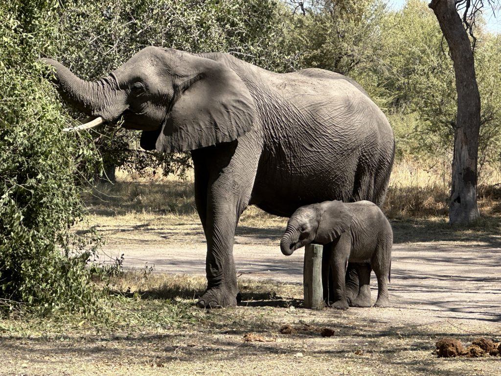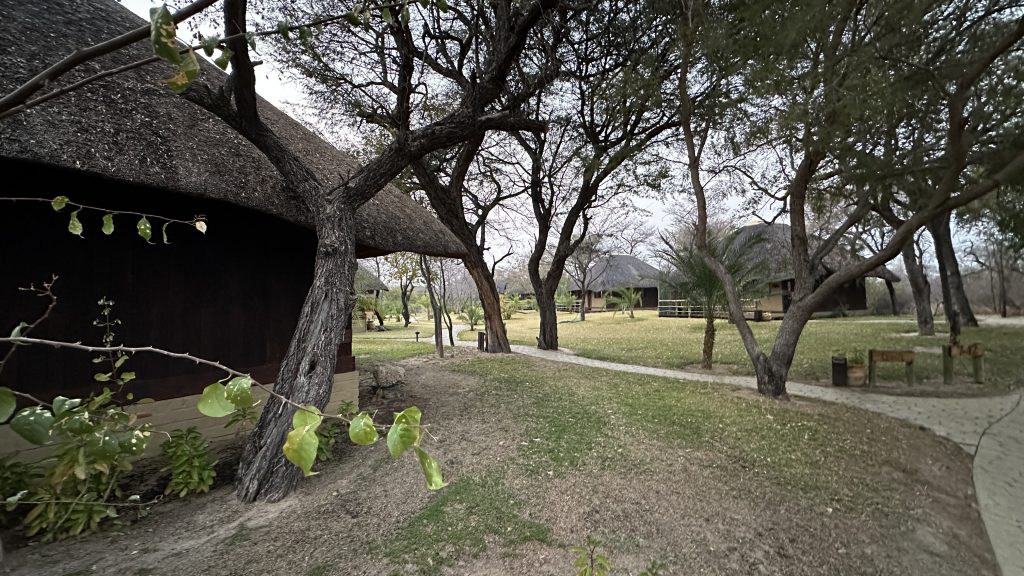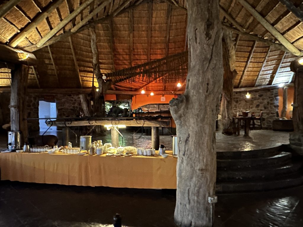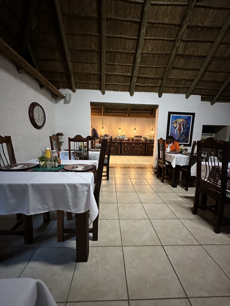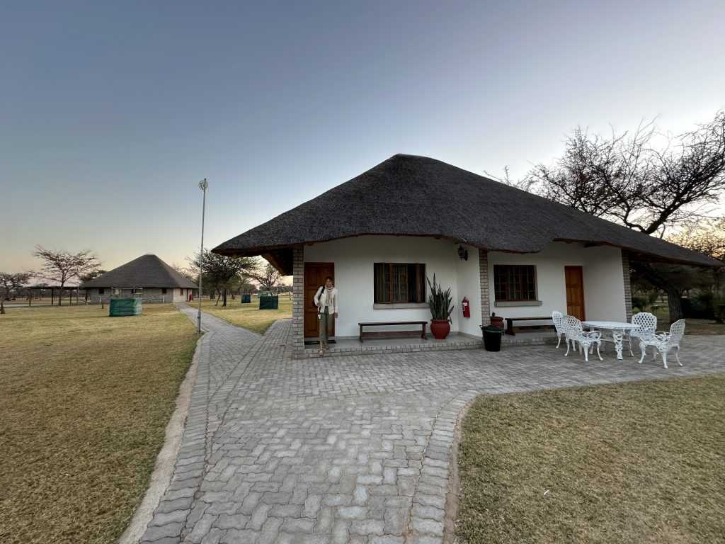 Beim Frühstück um 7 Uhr sind wir „not alone“. Eine große englischsprachige Rentnerband kommt zeitgleich, etwas später gesellen sich six etwas jüngere Germans in perfekter grüner Safarikleidung hinzu. Auch wenn der Abstieg von den Water Villas zur Nata Lodge eklatant ist, sind wir guter Dinge, da wir dank der AC recht gut geschlafen haben und auch das Buffetangebot absolut ausreichend ist. Im Übrigen hatten wir hier unsere erste Outdoorshower – mit hochgradiger Verbrühgefahr und einem Wasserdruck, der es mit den Stromschnellen im Grand Canyon aufnehmen kann. Um 7:45 Uhr checken wir vorne an der Rezeption im Main House aus und machen uns gen Leopard Plains auf den Weg. Im Choppies holen wir uns noch Getränke, bei Shell machen wir unseren Benzintank noch einmal voll. Dann geht es gut 220 km zur nächsten Lodge. Auf die Baines Baobas im Nxai Pan N. P. verzichten wir angesichts der 1,5 Stunden-einfach-dauernden möglicherweise nervigen Tiefsandstrecke. Mitauslöser war ein neben uns parkender Brix-Camper, der im Park auf dem Campingplatz war und uns rät, Luft aus den Reifen herauszulassen. Er hatte einen Kompressor, etwas, was nicht zu unserer Ausstattung gehört. So sind wir recht früh dran. Erfreulicherweise halten uns immer wieder Elefanten auf, die links von der Straße an künstlichen Wasserlöchern trinken. In der Leopard Plains erfahren wir dann, dass viele auch die Betonplatten oberhalb einer Wasserleitung beiseitegeschoben haben, um an das Frischwasser zu kommen. Last elephant stop ist ein Meeting von einem Grautier und ein paar Kühen am Wasserloch. Ein paar Sträuße und road crossing zebras und few giraffes tragen ebenfalls zur gewünschten Verzögerung bei. Wir erreichen das verschlossene Tor mit Funksprechanlage gegen 12:30 Uhr, wir melden uns an, das Tor geht auf und wir werden an der offenen Rezeption von einer recht freundlich tuenden „weißen“ Mitfünfzigerin erwartet. Wir buchen den Gamedrivesundowner, der um 16 Uhr beginnen soll und sie zeigt uns dann unser Häuschen. Eigentlich ist es recht schön, perfekt wäre es, wenn das WLAN auch im Zimmer gehen würde bzw. statt einem Ventilator eine Klimaanlage im Zimmer wäre. Erfreulich im Rückblick ist auch, dass wir eine Radarkontrolle „heil“ überlebt haben. Nachmittags wird es vor und im Zimmer heiß. Der Sundownergamedrive entpuppt sich als Reinfall hoch drei, lt. Autotacho sind wir mit 0 km/h unterwegs, empfinden alles schon direkt als Komödie, sehen 1,5 Giraffen aus 100 m Entfernung mit abruptem Stopp, um das Tier ja nicht zu erschrecken, genauso bei einem Gnu …, reden untereinander so leise, um ja nicht bei der anderen Familie mit unseren an Galgenhumor grenzenden Bemerkungen anzuecken und schauen immer wieder auf die Uhr, in der Hoffnung, dass diese alberne Vorführung endlich sein Ende findet. Beim Sundownerstopp kommen wir dann doch mit den anderen ins Gespräch: eine Familie aus Wien mit zwei Kindern, er ist 53, auch Raucher wie sich herausstellt, und beim Wissenschaftsministerium beschäftigt, beide sind reiseerfahren und so wird aus dem fast peinlichen Schweigen ein doch recht interessanter Austausch über Urlaubserlebnisse auf der ganzen Welt, sei es hier auf dem afrikanischen Kontinent oder zur Wave im Südwesten. Dieser Change findet dann noch eine Fortsetzung: Sie hatten ein Bushdinner gebucht und wir kommen so kostenlos auch in den Genuss dieses normalerweise extra zu bezahlenden Angebots. Übermäßig gut schmeckt es nicht, auch wenn das Ambiente recht schön ist.