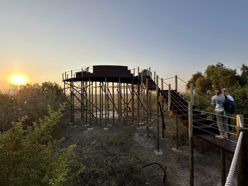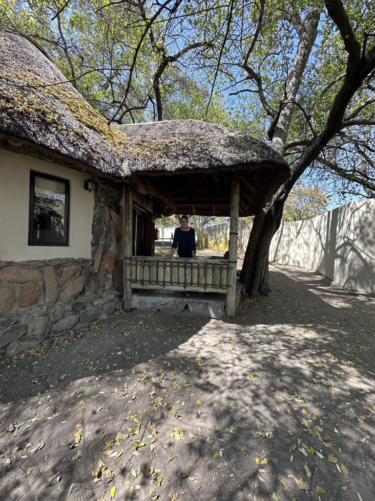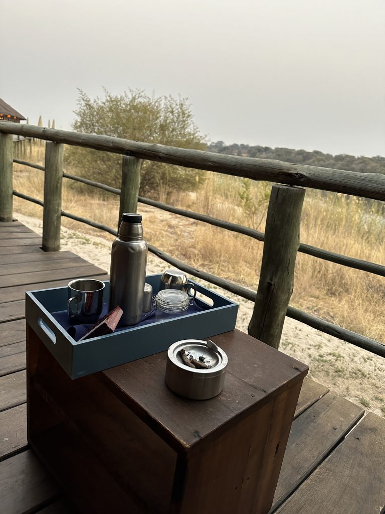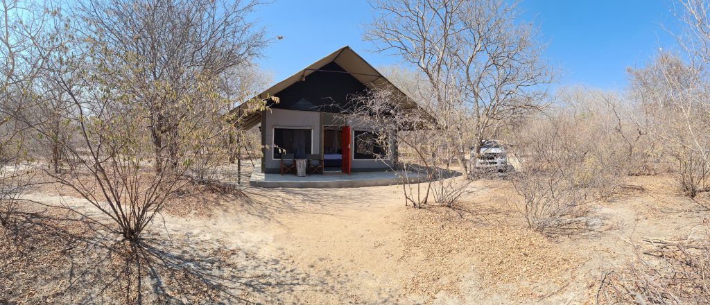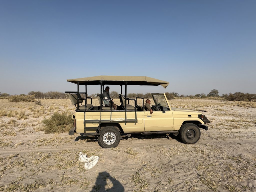 Beim Frühstück um 7 Uhr sind wir „not alone“. Eine große englischsprachige Rentnerband kommt zeitgleich, etwas später gesellen sich six etwas jüngere Germans in perfekter grüner Safarikleidung hinzu. Auch wenn der Abstieg von den Water Villas zur Nata Lodge eklatant ist, sind wir guter Dinge, da wir dank der AC recht gut geschlafen haben und auch das Buffetangebot absolut ausreichend ist. Im Übrigen hatten wir hier unsere erste Outdoorshower – mit hochgradiger Verbrühgefahr und einem Wasserdruck, der es mit den Stromschnellen im Grand Canyon aufnehmen kann. Um 7:45 Uhr checken wir vorne an der Rezeption im Main House aus und machen uns gen Leopard Plains auf den Weg. Im Choppies holen wir uns noch Getränke, bei Shell machen wir unseren Benzintank noch einmal voll. Dann geht es gut 220 km zur nächsten Lodge. Auf die Baines Baobas im Nxai Pan N. P. verzichten wir angesichts der 1,5 Stunden-einfach-dauernden möglicherweise nervigen Tiefsandstrecke. Mitauslöser war ein neben uns parkender Brix-Camper, der im Park auf dem Campingplatz war und uns rät, Luft aus den Reifen herauszulassen. Er hatte einen Kompressor, etwas, was nicht zu unserer Ausstattung gehört. So sind wir recht früh dran. Erfreulicherweise halten uns immer wieder Elefanten auf, die links von der Straße an künstlichen Wasserlöchern trinken. In der Leopard Plains erfahren wir dann, dass viele auch die Betonplatten oberhalb einer Wasserleitung beiseitegeschoben haben, um an das Frischwasser zu kommen. Last elephant stop ist ein Meeting von einem Grautier und ein paar Kühen am Wasserloch. Ein paar Sträuße und road crossing zebras und few giraffes tragen ebenfalls zur gewünschten Verzögerung bei. Wir erreichen das verschlossene Tor mit Funksprechanlage gegen 12:30 Uhr, wir melden uns an, das Tor geht auf und wir werden an der offenen Rezeption von einer recht freundlich tuenden „weißen“ Mitfünfzigerin erwartet. Wir buchen den Gamedrivesundowner, der um 16 Uhr beginnen soll und sie zeigt uns dann unser Häuschen. Eigentlich ist es recht schön, perfekt wäre es, wenn das WLAN auch im Zimmer gehen würde bzw. statt einem Ventilator eine Klimaanlage im Zimmer wäre. Erfreulich im Rückblick ist auch, dass wir eine Radarkontrolle „heil“ überlebt haben. Nachmittags wird es vor und im Zimmer heiß. Der Sundownergamedrive entpuppt sich als Reinfall hoch drei, lt. Autotacho sind wir mit 0 km/h unterwegs, empfinden alles schon direkt als Komödie, sehen 1,5 Giraffen aus 100 m Entfernung mit abruptem Stopp, um das Tier ja nicht zu erschrecken, genauso bei einem Gnu …, reden untereinander so leise, um ja nicht bei der anderen Familie mit unseren an Galgenhumor grenzenden Bemerkungen anzuecken und schauen immer wieder auf die Uhr, in der Hoffnung, dass diese alberne Vorführung endlich sein Ende findet. Beim Sundownerstopp kommen wir dann doch mit den anderen ins Gespräch: eine Familie aus Wien mit zwei Kindern, er ist 53, auch Raucher wie sich herausstellt, und beim Wissenschaftsministerium beschäftigt, beide sind reiseerfahren und so wird aus dem fast peinlichen Schweigen ein doch recht interessanter Austausch über Urlaubserlebnisse auf der ganzen Welt, sei es hier auf dem afrikanischen Kontinent oder zur Wave im Südwesten. Dieser Change findet dann noch eine Fortsetzung: Sie hatten ein Bushdinner gebucht und wir kommen so kostenlos auch in den Genuss dieses normalerweise extra zu bezahlenden Angebots. Übermäßig gut schmeckt es nicht, auch wenn das Ambiente recht schön ist.