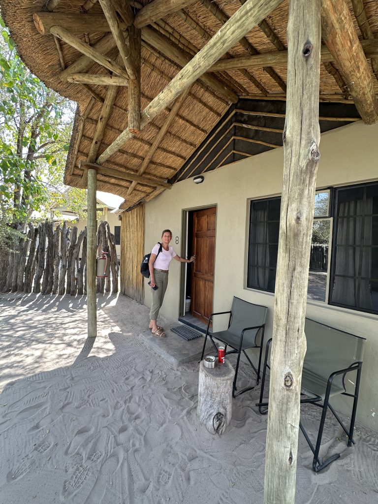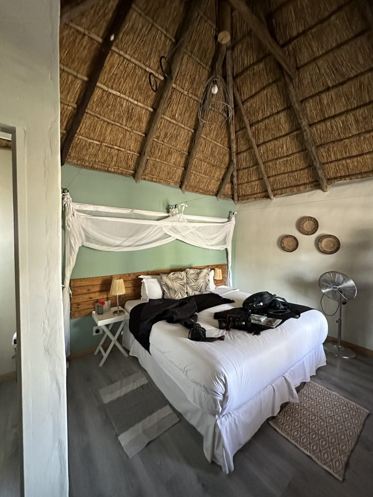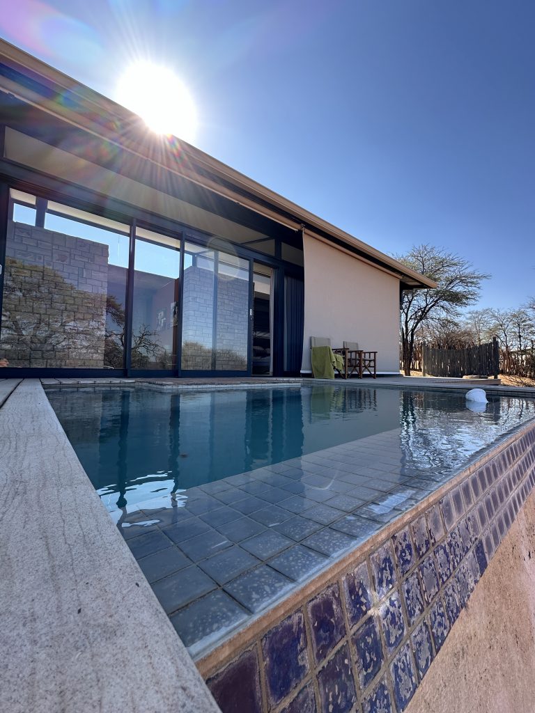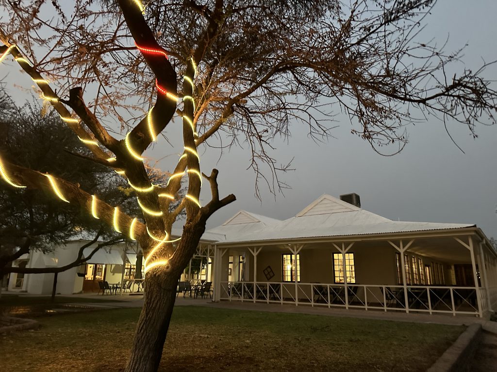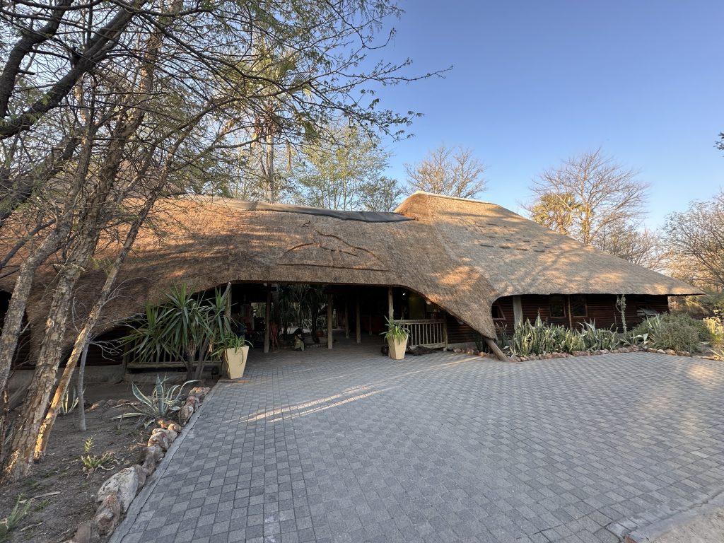 Wir schlafen schlecht, das Frühstück ist OK – damit endet die Zeit in der Lodge in Palm Africa. Dann machen wir uns auf die 460 km lange Strecke gen Ojimbondona mit dem Grenzübertritt bei Mamuno. Die Emigration aus Botswana ist schnell geschafft, die Immigration nach Namibia dauert seine Zeit. Zuerst die Immigration, dann das Auto, dann der Zoll mit dem Abstempeln des Gatepasses. Wieder draußen geht es samt Auto noch durch eine Kontrolle, bei der wir den RFU-Zettel vorzeigen müssen. In Gobabis tanken wir dann voll und dann geht es ohne Pause gen Lodge, zuletzt wieder auf einer namibiatypischen, jedoch gut und zügig zu befahrenden unpaved road. Anita – die perfekt Deutsch sprechende Eigentümerin – erzählt uns etwas von der „Familien- und Lodgegeschichte“. Anfangs wirkt es alles noch etwas seltsam, weil zeitgleich vier Amerikaner angekommen sind. Ganz freundlich wirkt auf jeden Fall Lazarus auf uns, der sich mit einem freundlichen, sympathischen Lachen sichtlich bemüht, uns jeden Wunsch von den Lippen abzulesen. Anita bringt uns dann noch zum Zimmer. Wir machen uns kurz frisch und gehen dann zum Lunch: Fladenbrot bedeckt mit sehr guten Springbockfleisch und Salat. Den Nachmittag relaxen wir dann in unser Villa Warthog – eine der vier Villen, wobei unsere gen Osten, also Sunrise, ausgerichtet ist. Jetzt sitzen wir gerade auf der Veranda und trinken – was sollte es auch sonst sein – einen Gin & Tonic beim Sonnenuntergang. „There is really nothing to complain, only wifi is working at the main building – so würden wir gerade den geforderten Comment bei Booking verfassen. Unser letzter Abend – unser letztes Dinner steht (leider) bevor. Besagtes ist fast erwartungsgemäß sehr gut – mit Lemon Mousse als Dessert und Fleisch als Hauptspeise. Wir hoffen noch, den Online-Checkin erledigen zu können, aber als es „zeitmäßig“ gepasst hätte, wird das Wlan an der Lodge abgeschaltet, sodass wir dies dann doch auf den nächsten Morgen verschieben müssen.