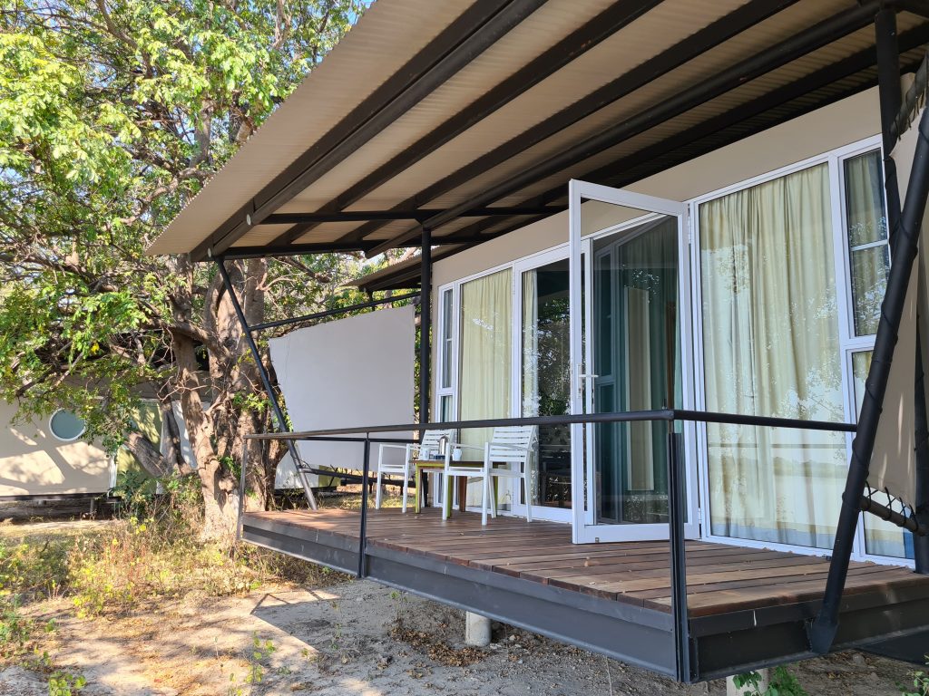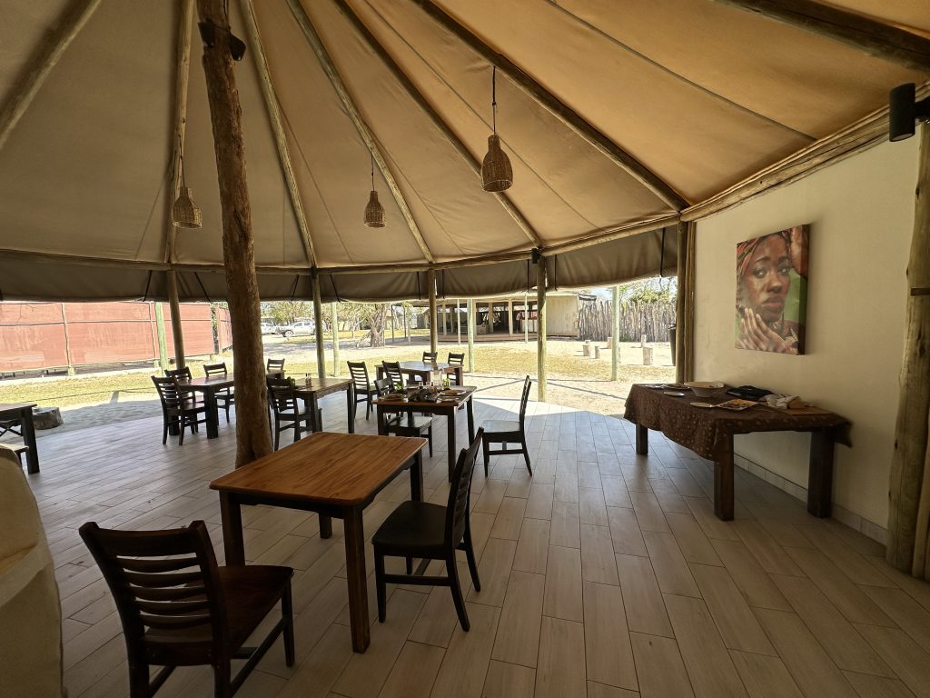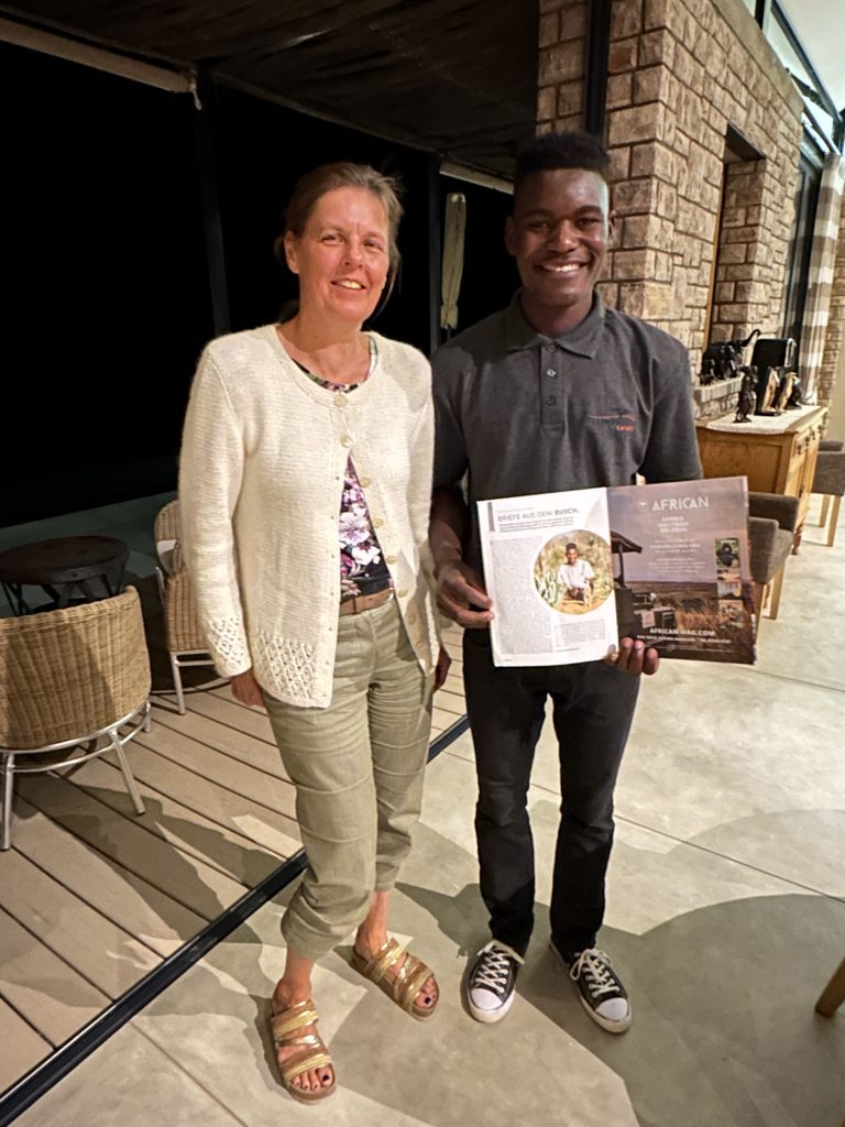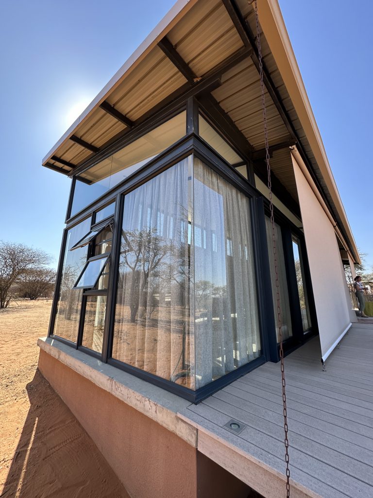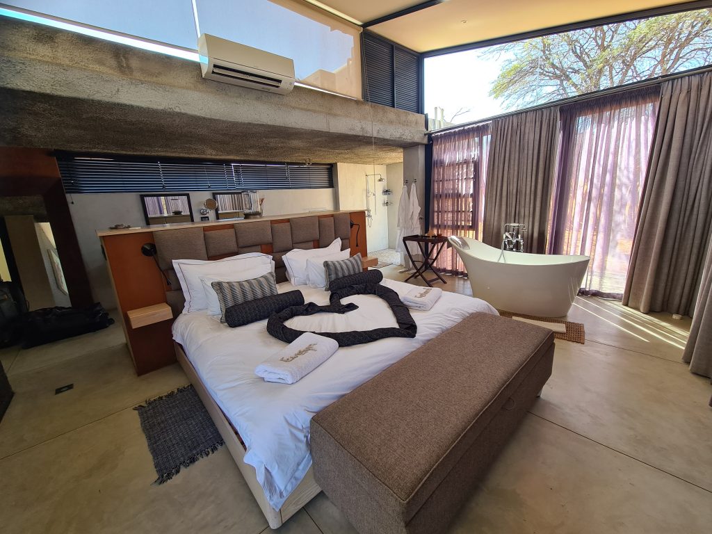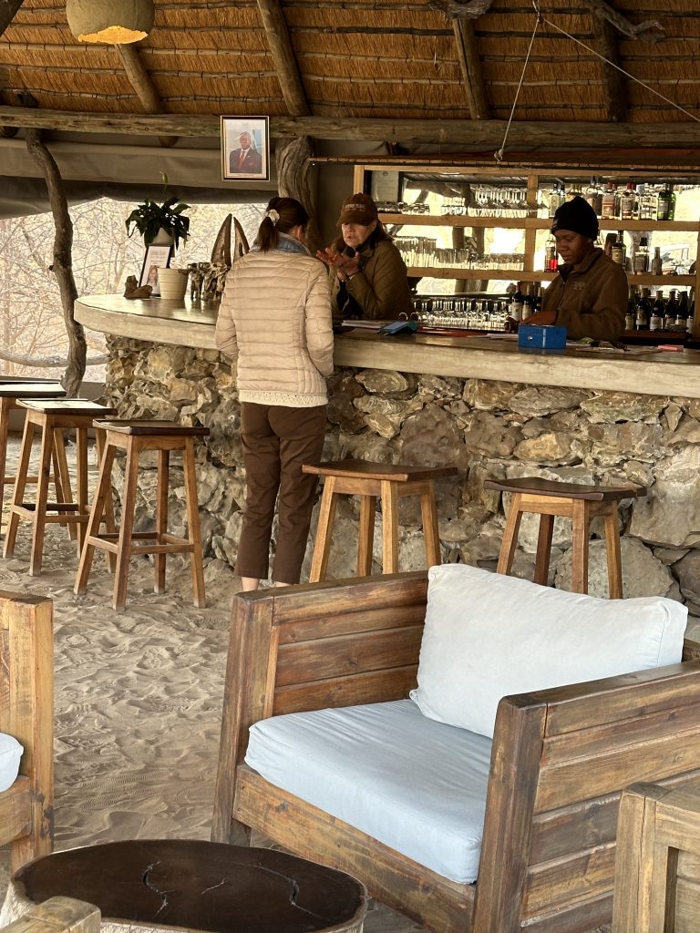 Wir schlafen schlecht, das Frühstück ist OK – damit endet die Zeit in der Lodge in Palm Africa. Dann machen wir uns auf die 460 km lange Strecke gen Ojimbondona mit dem Grenzübertritt bei Mamuno. Die Emigration aus Botswana ist schnell geschafft, die Immigration nach Namibia dauert seine Zeit. Zuerst die Immigration, dann das Auto, dann der Zoll mit dem Abstempeln des Gatepasses. Wieder draußen geht es samt Auto noch durch eine Kontrolle, bei der wir den RFU-Zettel vorzeigen müssen. In Gobabis tanken wir dann voll und dann geht es ohne Pause gen Lodge, zuletzt wieder auf einer namibiatypischen, jedoch gut und zügig zu befahrenden unpaved road. Anita – die perfekt Deutsch sprechende Eigentümerin – erzählt uns etwas von der „Familien- und Lodgegeschichte“. Anfangs wirkt es alles noch etwas seltsam, weil zeitgleich vier Amerikaner angekommen sind. Ganz freundlich wirkt auf jeden Fall Lazarus auf uns, der sich mit einem freundlichen, sympathischen Lachen sichtlich bemüht, uns jeden Wunsch von den Lippen abzulesen. Anita bringt uns dann noch zum Zimmer. Wir machen uns kurz frisch und gehen dann zum Lunch: Fladenbrot bedeckt mit sehr guten Springbockfleisch und Salat. Den Nachmittag relaxen wir dann in unser Villa Warthog – eine der vier Villen, wobei unsere gen Osten, also Sunrise, ausgerichtet ist. Jetzt sitzen wir gerade auf der Veranda und trinken – was sollte es auch sonst sein – einen Gin & Tonic beim Sonnenuntergang. „There is really nothing to complain, only wifi is working at the main building – so würden wir gerade den geforderten Comment bei Booking verfassen. Unser letzter Abend – unser letztes Dinner steht (leider) bevor. Besagtes ist fast erwartungsgemäß sehr gut – mit Lemon Mousse als Dessert und Fleisch als Hauptspeise. Wir hoffen noch, den Online-Checkin erledigen zu können, aber als es „zeitmäßig“ gepasst hätte, wird das Wlan an der Lodge abgeschaltet, sodass wir dies dann doch auf den nächsten Morgen verschieben müssen.