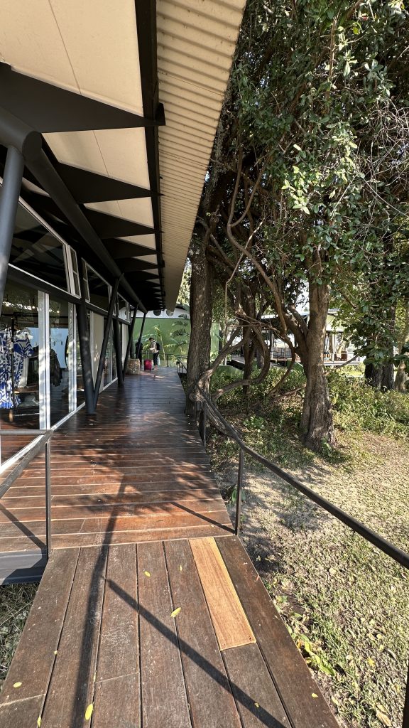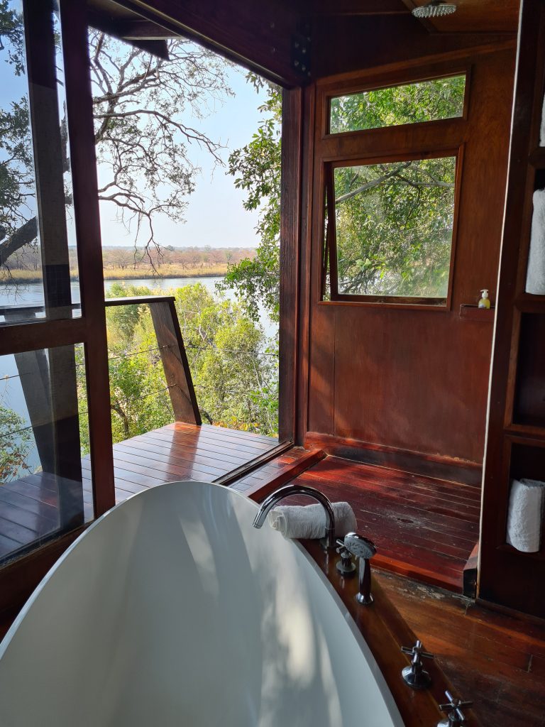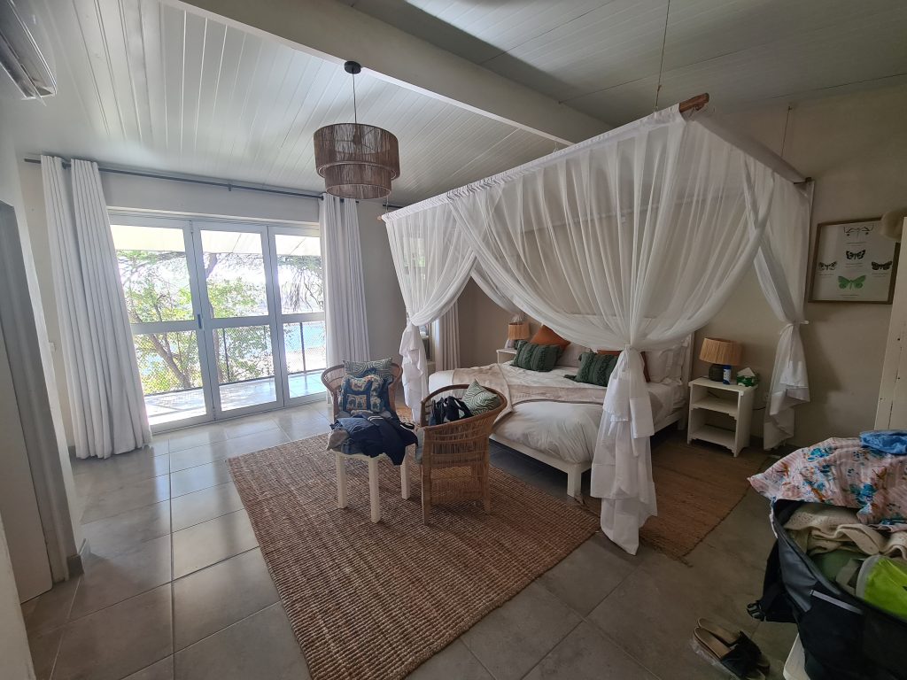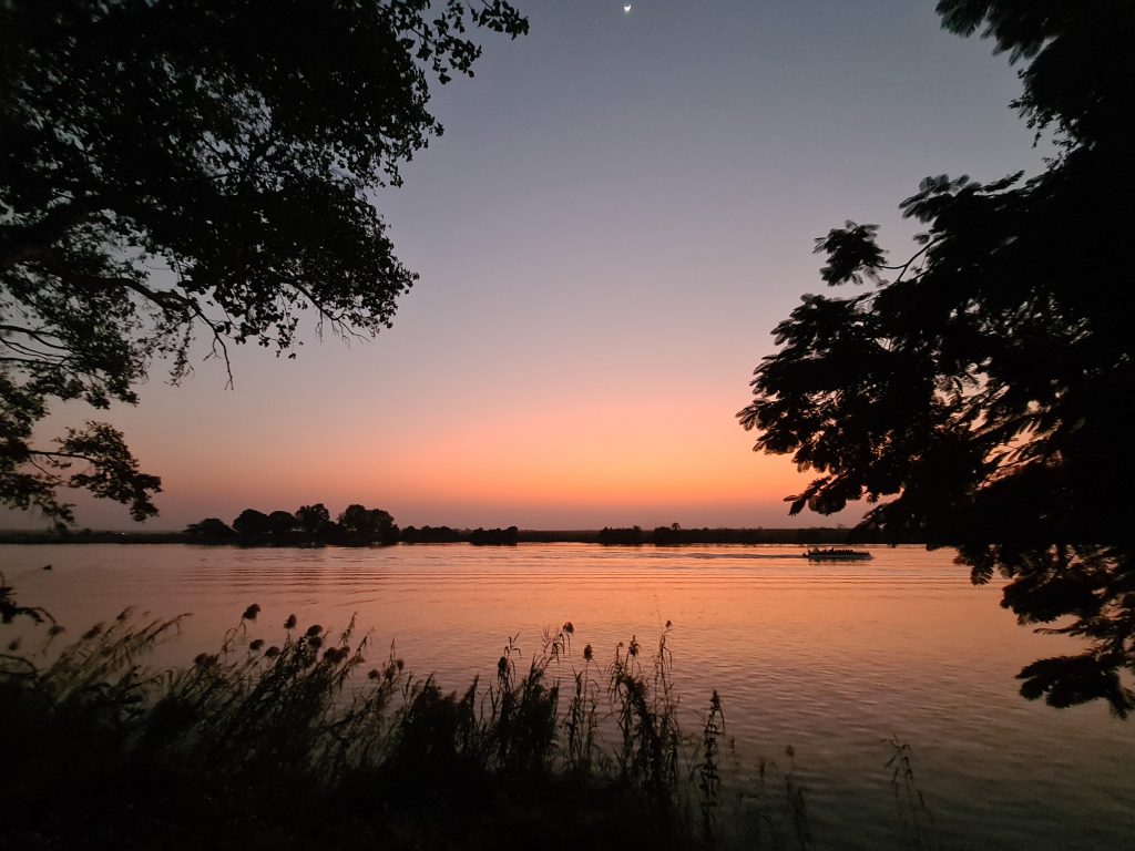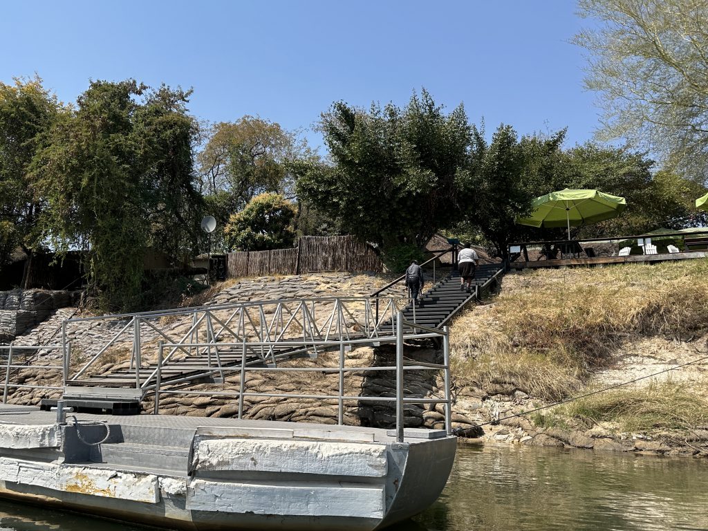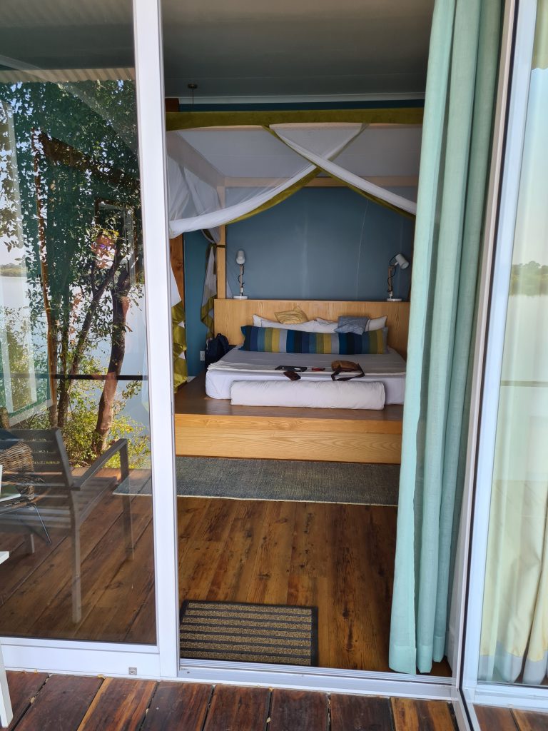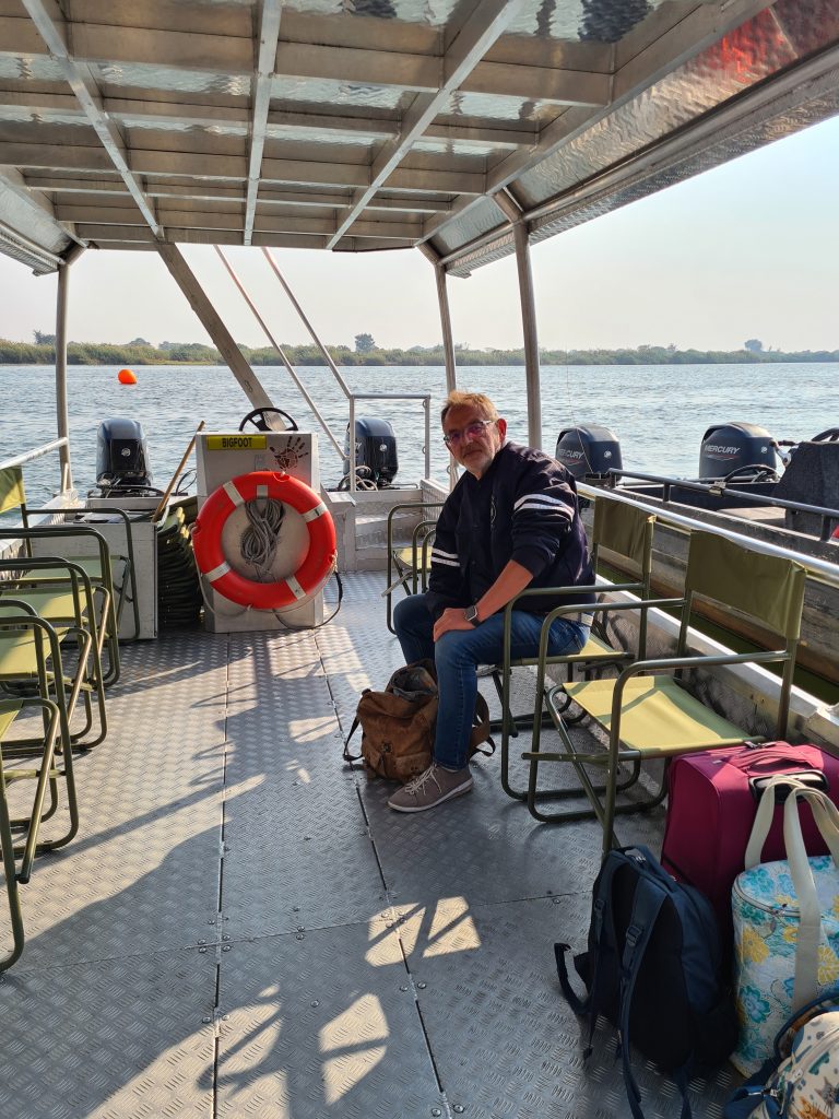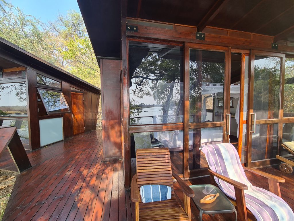 Nach dem tierlosen Morninggamedrive – Highlight ist ausschließlich die grundlose Elefantenverfolgung – frühstücken wir noch und verlassen Nkasa Lupala. Dann geht es gen Zambezi Mubala. Alles läuft zunächst nach Plan: Wir parken, melden uns an und das Boot wartet schon auf uns. Die Bootsfahrt auf dem Zambeziseitenarm und danach auf dem Zambezi lässt uns noch hoffen. Angekommen kommt dann etwas, womit wir nicht gerechnet haben: Die Rezeption in dem eigentlich „vornehmen“ Haus ist zu, dann bequemt sich eine zu jeder Sekunde unfreundliche Madame zu ihren Tresen, informiert uns mit einer Aura bodenloser Arroganz und Desinteresse und grenzenloser Unfreundlichkeit über die Lodgeabläufe und schaut uns dabei nicht einmal an, sodass uns fast die Spucke wegbleibt. Eigentlich denken wir voneinander unabhängig und ohne es auszusprechen das Gleiche: Was sollen wir hier und wie kommen wir hier schnellstmöglich wieder weg? Man zeigt uns das schöne weiträumige Zimmer mit perfekter Klimaanlage und schönem Bad direkt am Zambeziufer, die Eindrücke vom Einchecken bleiben aber in uns. So gehen wir nach vorne zur offenen Bar rechts vom Anlegesteg, überweisen 2000 € auf das Kreditkartenkonto, buchen eine dritte Nacht in der Chobe Marina und canceln die zweite Nacht hier in der Zambezi Mubala Lodge. Unabhängig vom Empfangshorror – im Übrigen auch ohne Begrüßungsgetränk – mag auch eine weitere Riverside Lodge inhaltlich zu viel des Guten zu sein. Auf der Veranda verbringen wir dann den Nachmittag mit einer Doppelportion Nussecken, dass wir das Dinner und die mögliche weitere Bootsfahrt ausfallen lassen, versteht sich angesichts des Desasters von selbst.