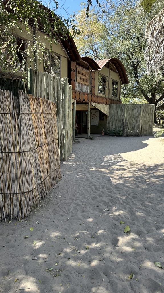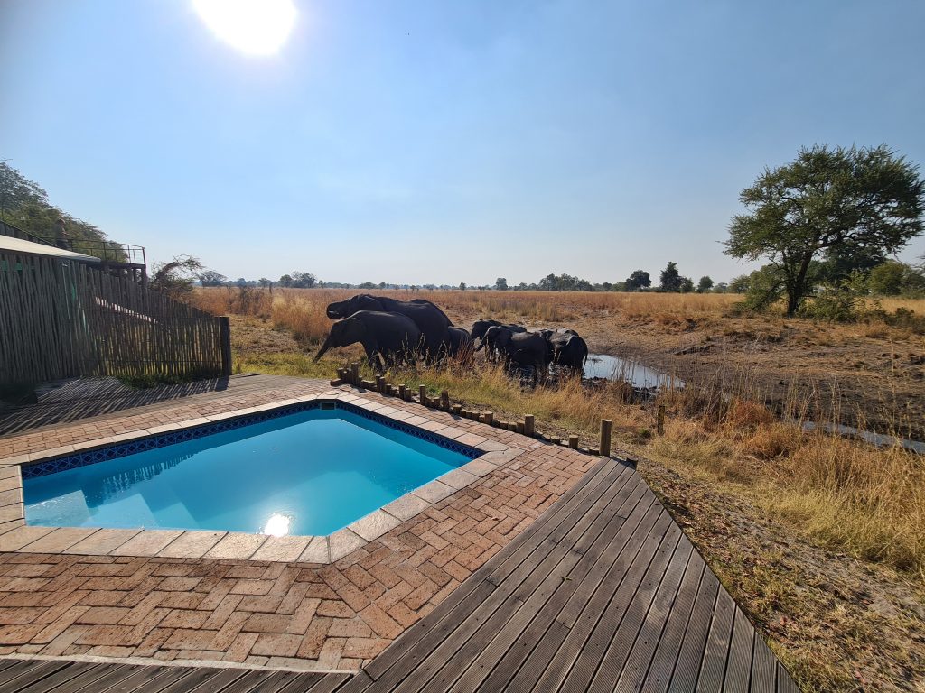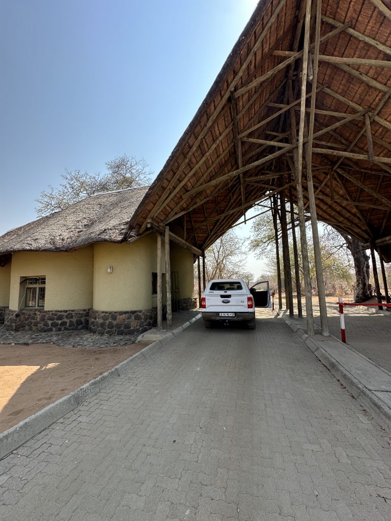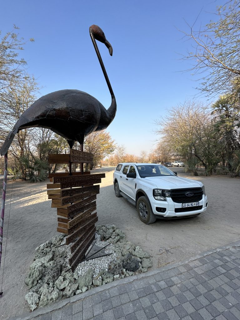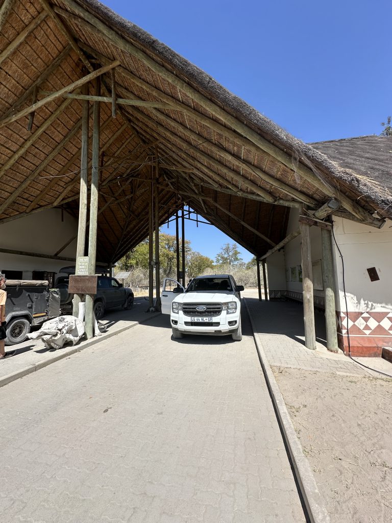Um 7 Uhr sitzen wir beim Frühstück: Statt Eggs Benedict scrambled eggs, statt Joghurt gibt es fluffy pancakes und logischerweise auch keine „Vorlesung“ von Joy zum Thema, was wir zum Lunch gerne hätten. Die Abreise um 8:20 Uhr steht an, wir „trinkgeldern“ und sind angesichts unserer „Sonderbehandlung“ als einzige Gäste dieser 5-Star-Lodge natürlich nicht gerade happy. Tolles Essen, die Aktivitäten waren super, das „einfache“ Personal – allen voran Kelvin, Josephine, die Küchendame Joy und der „Kellner“ mit dem etwas auffälligem Gebiss – war supernett. Joy hatte am Frühstückstisch von sich aus erzählt, wie angenehm es für sie ist, wenn ruhige und wenige Gäste vor Ort sind. Besagter Gebissmann begleitet uns mit Kelvin dann auch noch auf unserer letzten Emi- und Immigrationbootsfahrt. Die Chiefmanagerin samt Stellvertreter Joel winken noch scheinbar herzlich mit unverkennbarem professionellem Geldeintreibeblick. Mit anderem Auto – einem Kleinbus – erwartet uns in Kasane erneut David – der Safariguide vom Vortag –, der uns zum Flughafen zu unserem Auto bringt. Wir tanken nochmals in Kasane und fahren schnurstracks die oft etwas langweiligen 300 km nach Nata in die rustikale, Western-like Nata Lodge. Highlight auf der Fahrt: ein paar wenige Elefanten links oder rechts von der Straße, die Landwirtschaftskontrolle für Auto und Schuhe und die uns bekannte Abzweigung zu Elephant Sands, wo wir vor 7 Jahren übernachtet hatten. In Nata hat uns die „normale“ Touristenwelt wieder. Beim Einchecken müssen wir warten und der Pool ist a) voll und b) laut. Auf der Veranda sitzen wir bei 35 Grad, lesen und schreiben und lassen den Tag ausklingen.