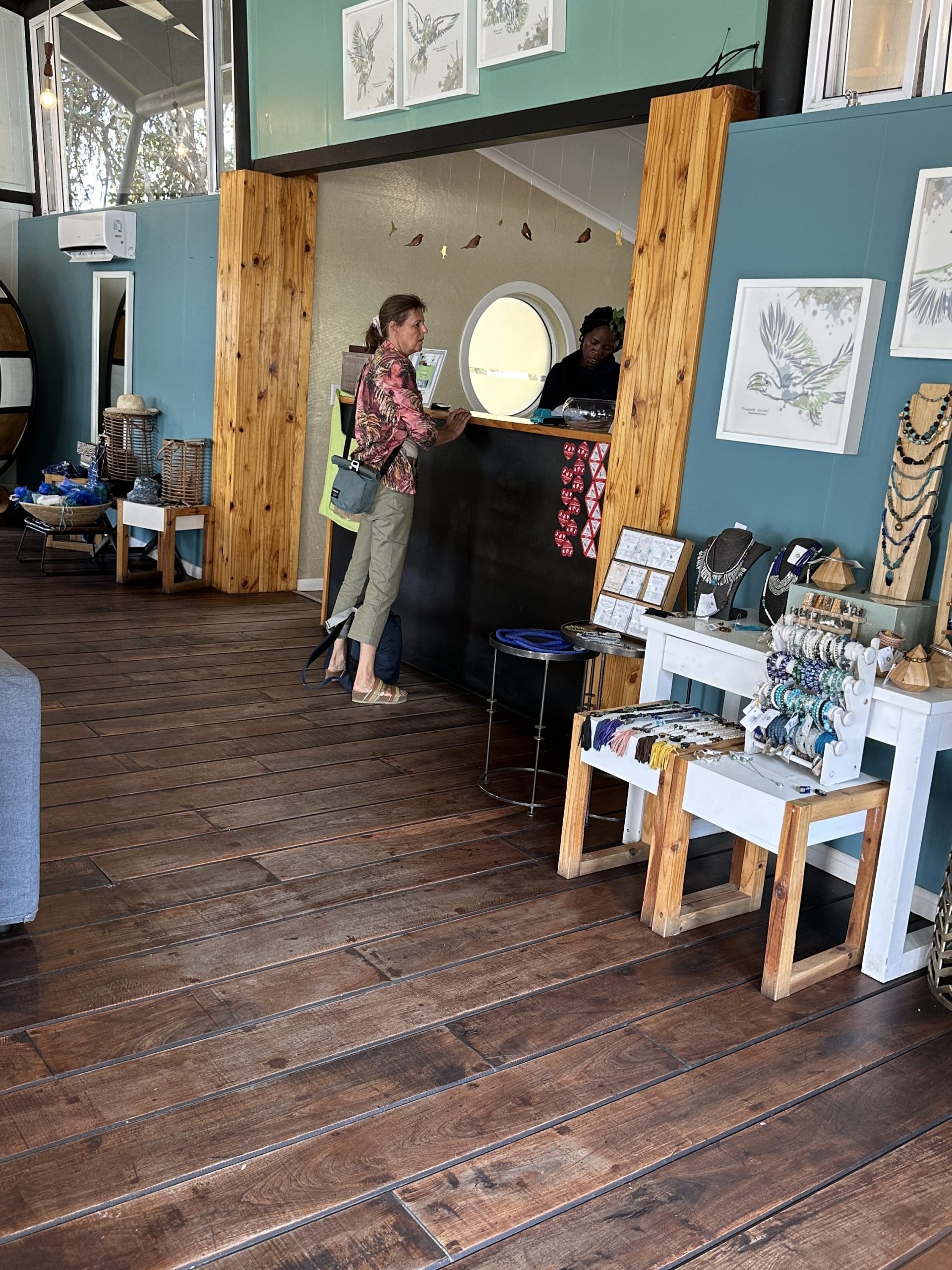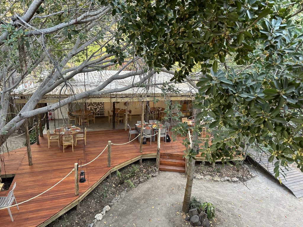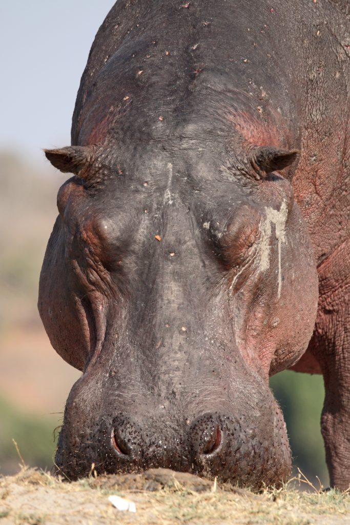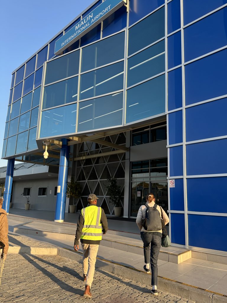 Um 7 Uhr sitzen wir beim Frühstück: Statt Eggs Benedict scrambled eggs, statt Joghurt gibt es fluffy pancakes und logischerweise auch keine „Vorlesung“ von Joy zum Thema, was wir zum Lunch gerne hätten. Die Abreise um 8:20 Uhr steht an, wir „trinkgeldern“ und sind angesichts unserer „Sonderbehandlung“ als einzige Gäste dieser 5-Star-Lodge natürlich nicht gerade happy. Tolles Essen, die Aktivitäten waren super, das „einfache“ Personal – allen voran Kelvin, Josephine, die Küchendame Joy und der „Kellner“ mit dem etwas auffälligem Gebiss – war supernett. Joy hatte am Frühstückstisch von sich aus erzählt, wie angenehm es für sie ist, wenn ruhige und wenige Gäste vor Ort sind. Besagter Gebissmann begleitet uns mit Kelvin dann auch noch auf unserer letzten Emi- und Immigrationbootsfahrt. Die Chiefmanagerin samt Stellvertreter Joel winken noch scheinbar herzlich mit unverkennbarem professionellem Geldeintreibeblick. Mit anderem Auto – einem Kleinbus – erwartet uns in Kasane erneut David – der Safariguide vom Vortag –, der uns zum Flughafen zu unserem Auto bringt. Wir tanken nochmals in Kasane und fahren schnurstracks die oft etwas langweiligen 300 km nach Nata in die rustikale, Western-like Nata Lodge. Highlight auf der Fahrt: ein paar wenige Elefanten links oder rechts von der Straße, die Landwirtschaftskontrolle für Auto und Schuhe und die uns bekannte Abzweigung zu Elephant Sands, wo wir vor 7 Jahren übernachtet hatten. In Nata hat uns die „normale“ Touristenwelt wieder. Beim Einchecken müssen wir warten und der Pool ist a) voll und b) laut. Auf der Veranda sitzen wir bei 35 Grad, lesen und schreiben und lassen den Tag ausklingen.