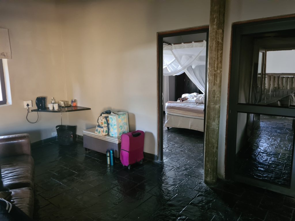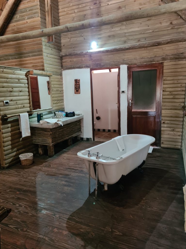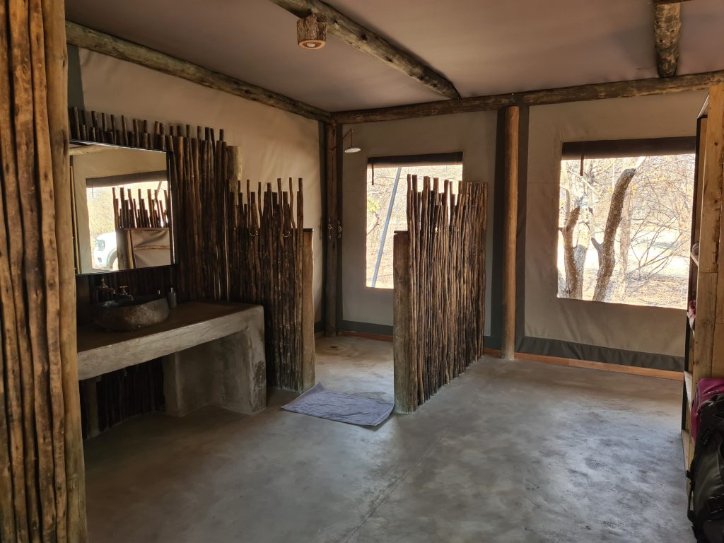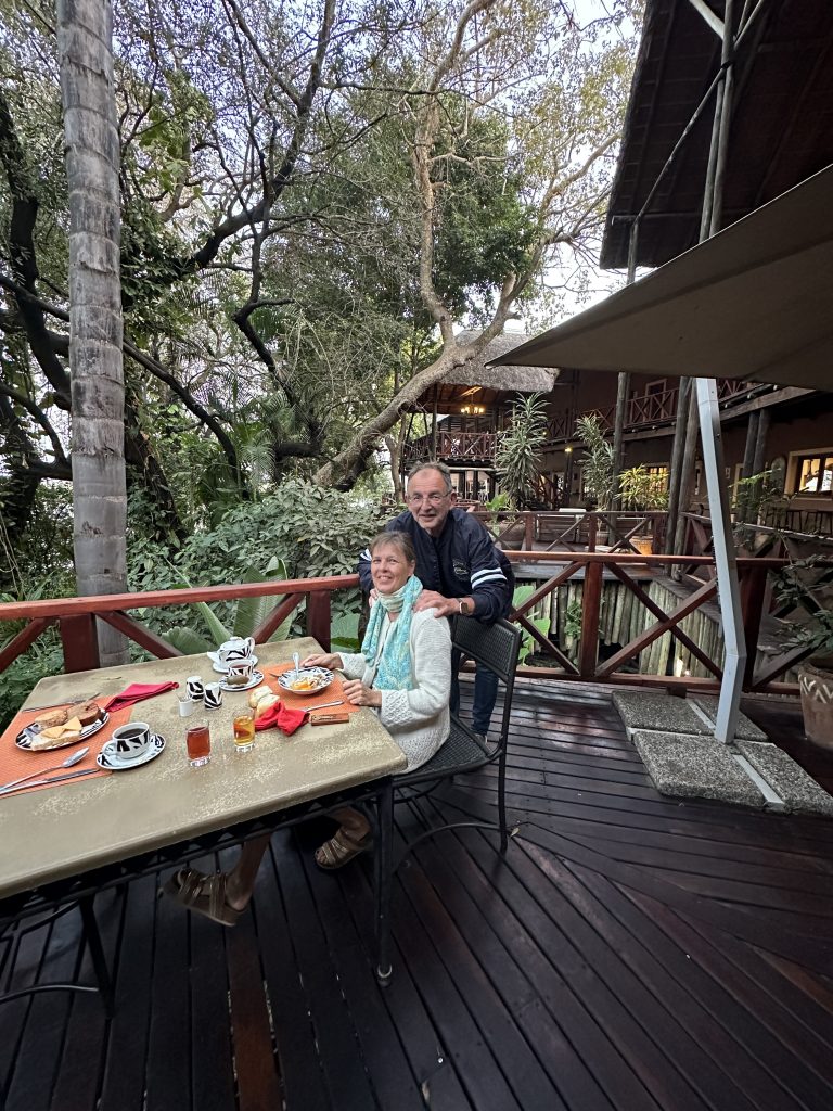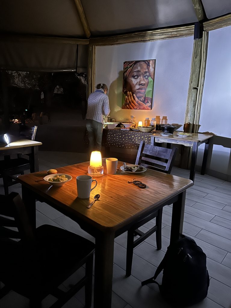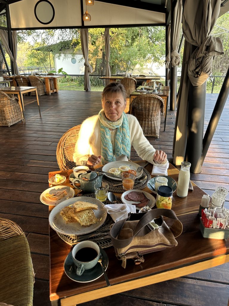Aufstehen um 5:15 Uhr, die Dusche ist erfreulicherweise nicht ganz eiskalt, zum Kaffee gibt es das „steinharte“ Gebäck und unser Morninggamedrive ist privat. Unsere Guides – Alfred und Roman – zeigen sich von ihrer besten Seite, humorvoll mit recht interessanten Informationen und Elefanten, vielen warthogs, einem von Geier „ausgeräumten“ Büffelkadaver und einem entfernten Löwengebrüll, ohne diesen zu Gesicht zu bekommen. Bei der Rückkehr canceln wir noch die zweite Tagesactivity und ordern für morgen Früh noch einen Gamedrive. Erfreulicherweise gibt es noch das ausführlichere Frühstück für uns – mit gutem Brot, Käse, stranger Frischwurst, Joghurt und Früchten. Seitdem sitzen wir auf der Veranda unseres Hochzelts, schwitzen etwas, schreiben und lesen, essen um 12:30 Uhr vorne schnell einen Salat und warten auf die Kaffeejause um 3 Uhr. Trotz Hitze ist dieser Tag nach dem Stress am Tag davor recht angenehm und angesichts des African views eigentlich wunderschön. Abends gibt es Kichererbsensuppe, danach trockenen Schweinebraten mit Kartoffelbrei und einer nicht auffindbaren Pfeffersauce. Gut im Sinne von „very good“ ist die Nachspeise: Pavlowa, Baiser mit Schokoladenganache.
