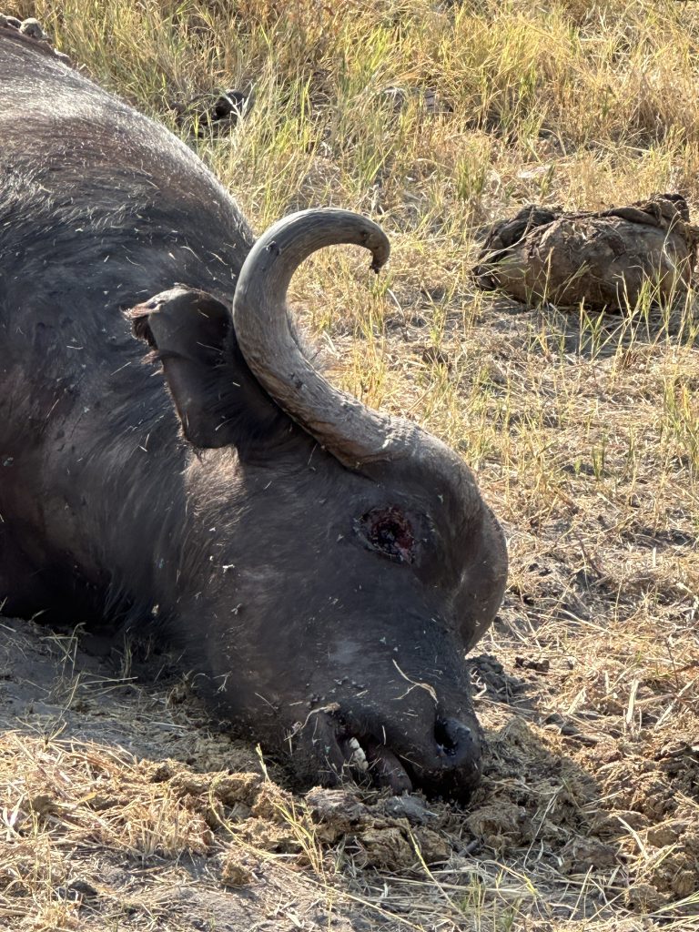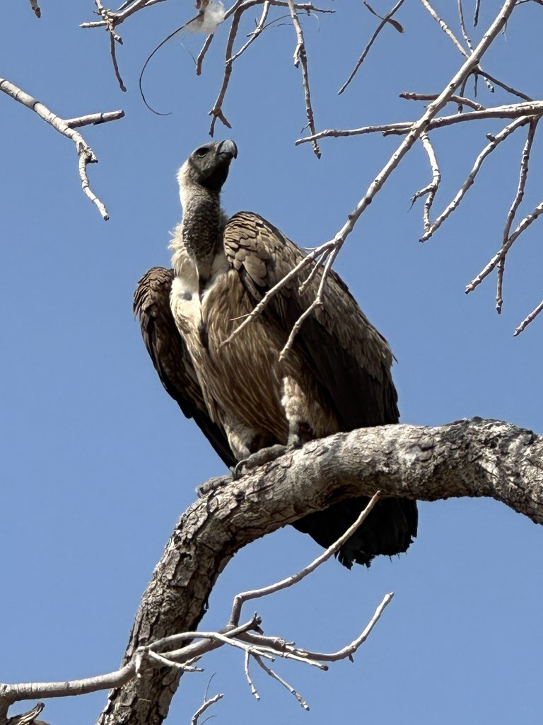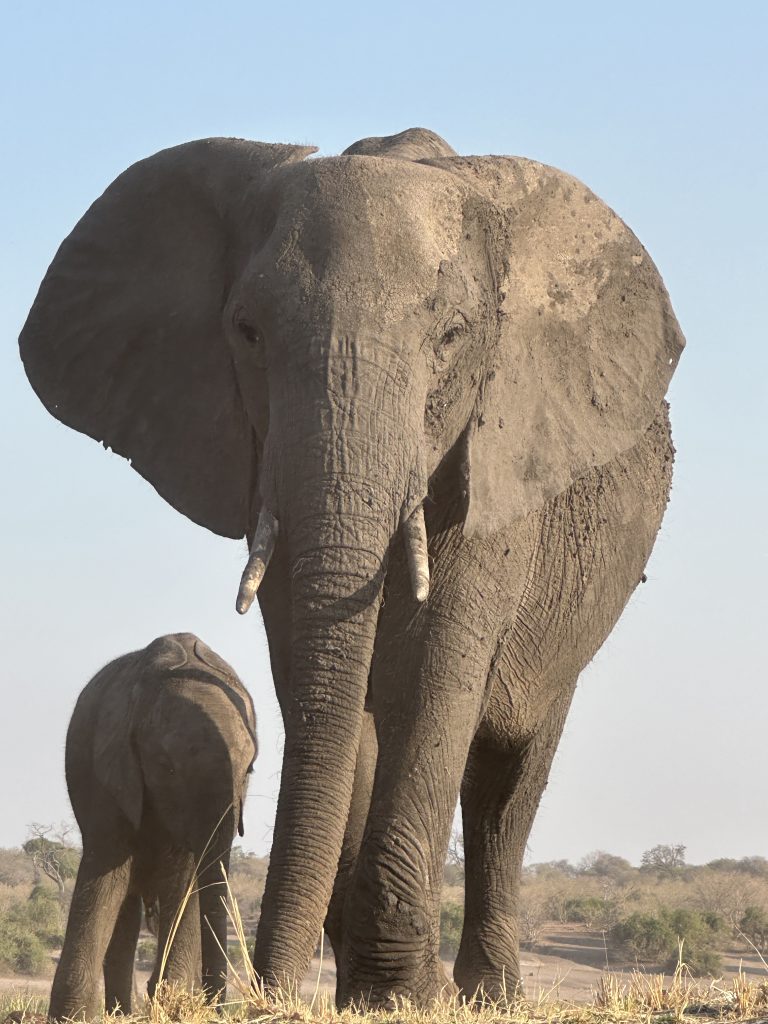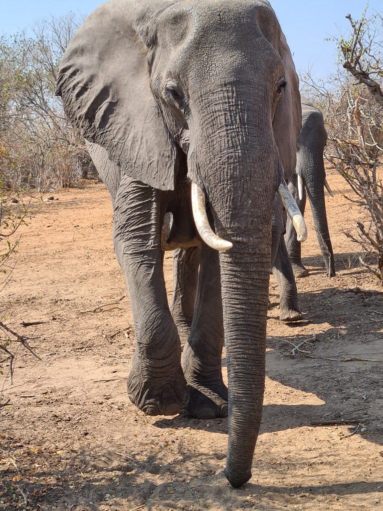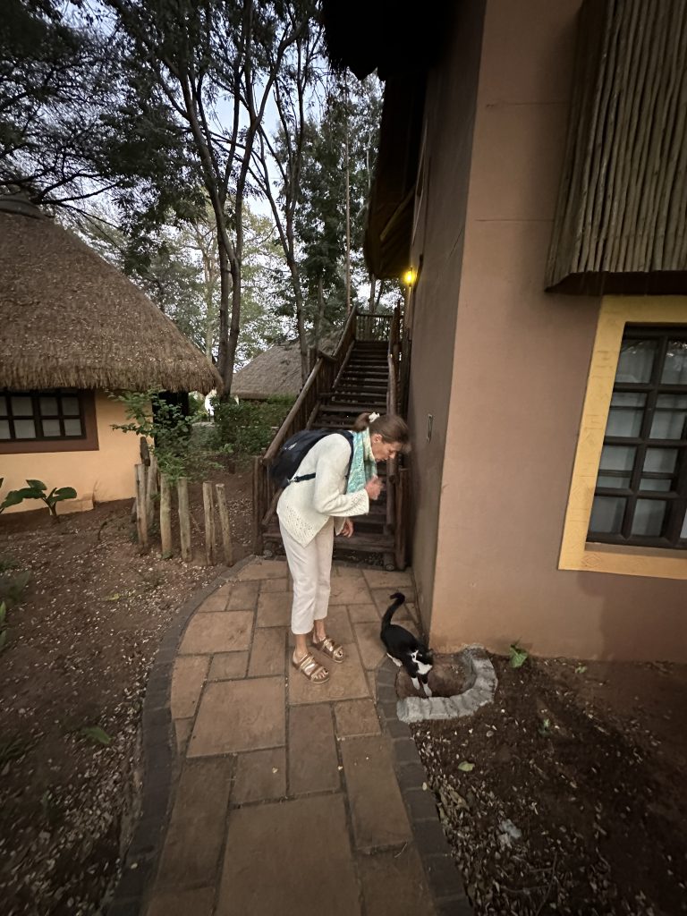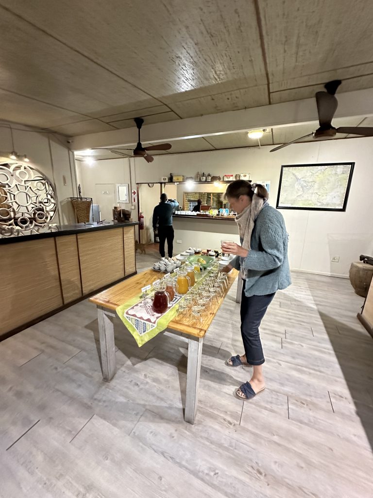 Aufstehen um 5:15 Uhr, die Dusche ist erfreulicherweise nicht ganz eiskalt, zum Kaffee gibt es das „steinharte“ Gebäck und unser Morninggamedrive ist privat. Unsere Guides – Alfred und Roman – zeigen sich von ihrer besten Seite, humorvoll mit recht interessanten Informationen und Elefanten, vielen warthogs, einem von Geier „ausgeräumten“ Büffelkadaver und einem entfernten Löwengebrüll, ohne diesen zu Gesicht zu bekommen. Bei der Rückkehr canceln wir noch die zweite Tagesactivity und ordern für morgen Früh noch einen Gamedrive. Erfreulicherweise gibt es noch das ausführlichere Frühstück für uns – mit gutem Brot, Käse, stranger Frischwurst, Joghurt und Früchten. Seitdem sitzen wir auf der Veranda unseres Hochzelts, schwitzen etwas, schreiben und lesen, essen um 12:30 Uhr vorne schnell einen Salat und warten auf die Kaffeejause um 3 Uhr. Trotz Hitze ist dieser Tag nach dem Stress am Tag davor recht angenehm und angesichts des African views eigentlich wunderschön. Abends gibt es Kichererbsensuppe, danach trockenen Schweinebraten mit Kartoffelbrei und einer nicht auffindbaren Pfeffersauce. Gut im Sinne von „very good“ ist die Nachspeise: Pavlowa, Baiser mit Schokoladenganache.