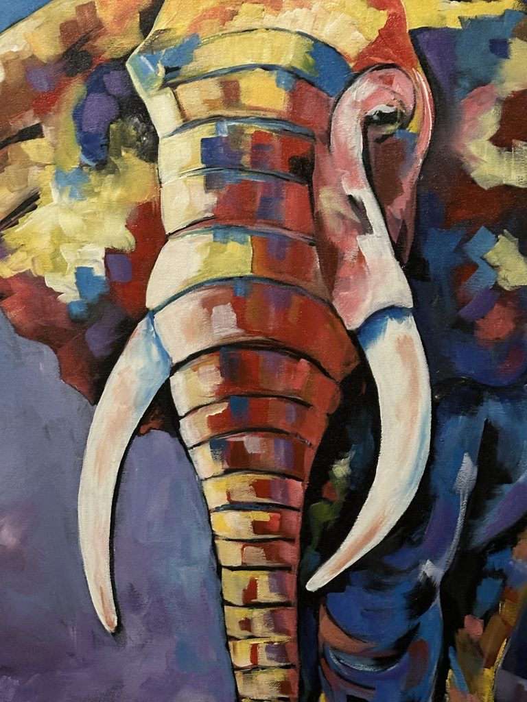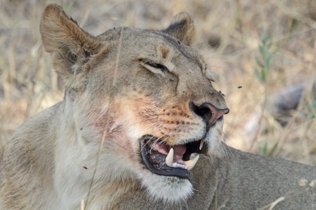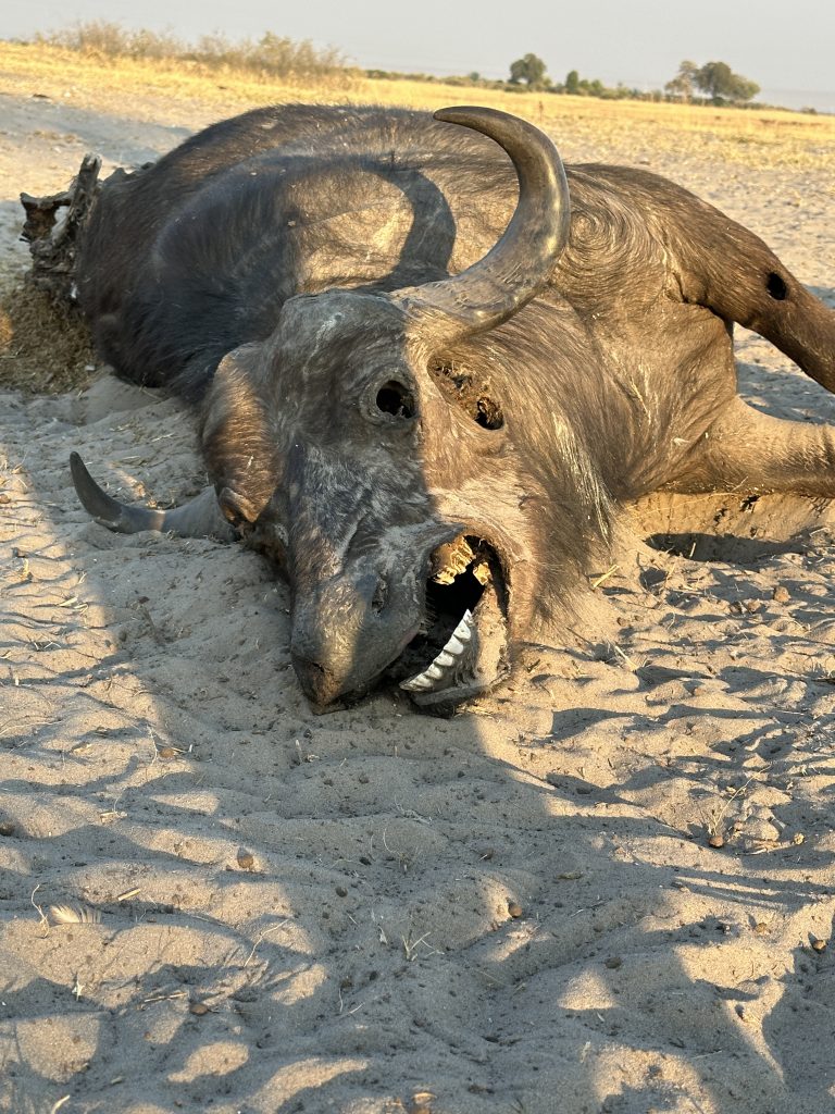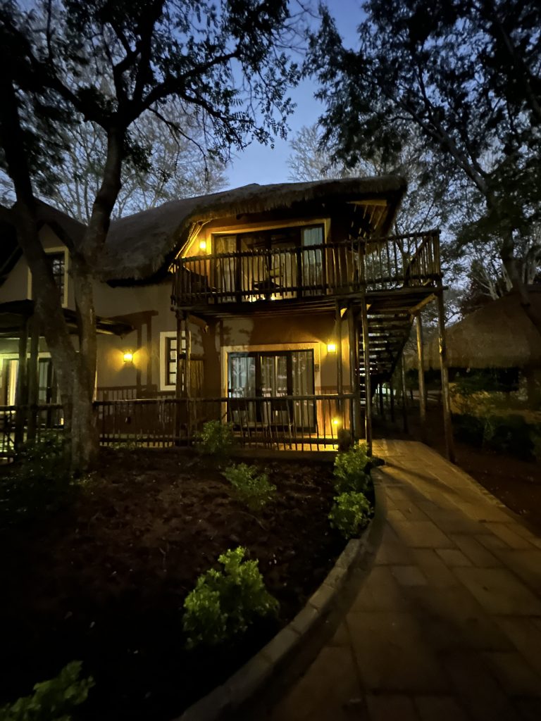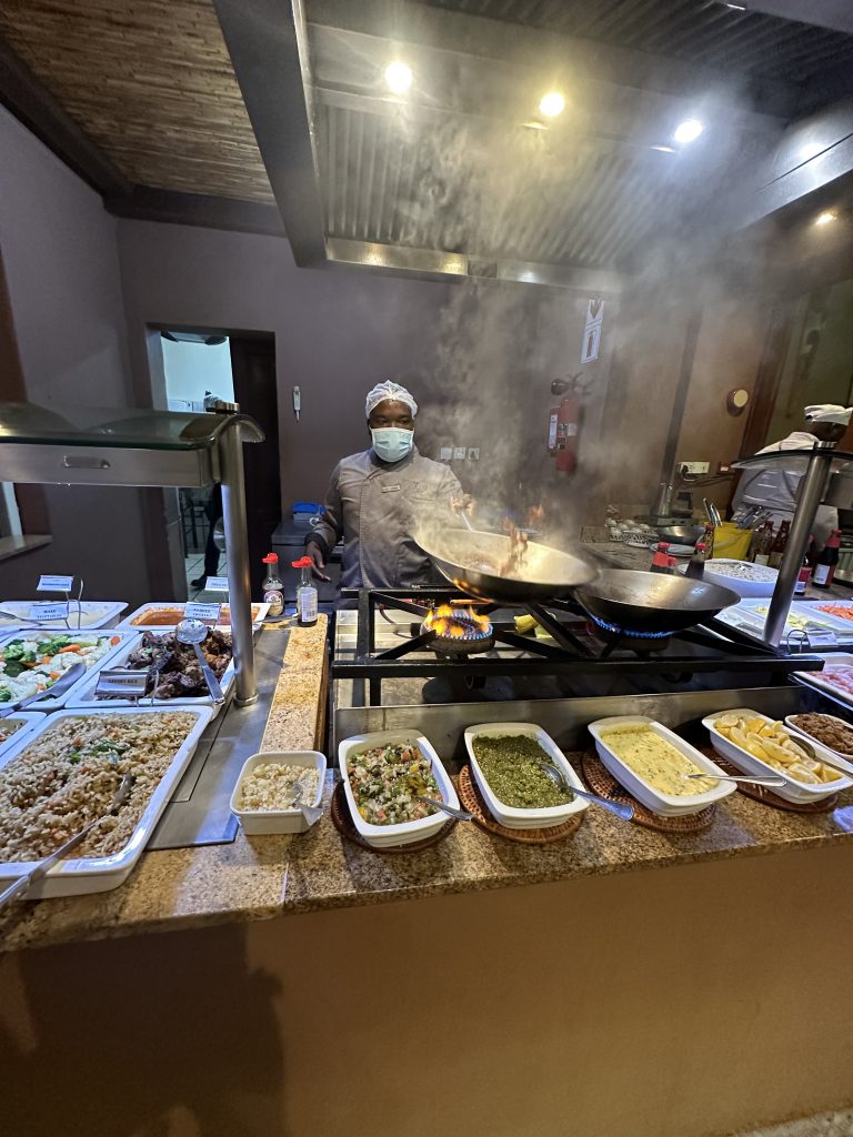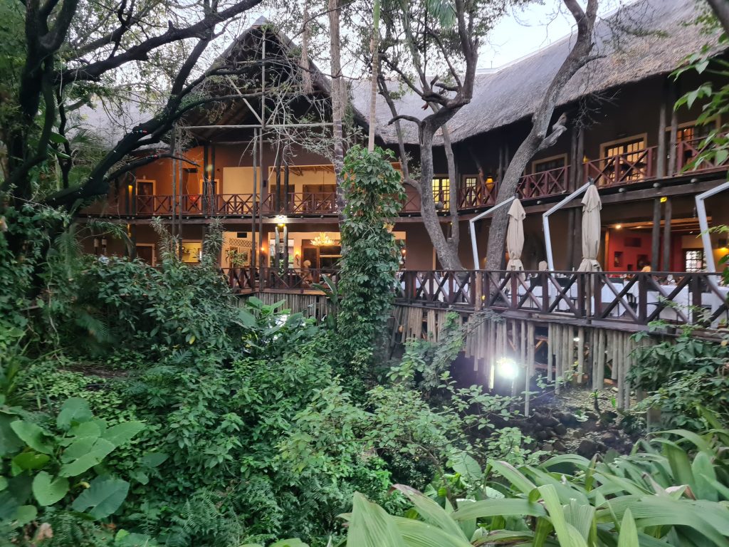 Aufstehen um 5:15 Uhr, die Dusche ist erfreulicherweise nicht ganz eiskalt, zum Kaffee gibt es das „steinharte“ Gebäck und unser Morninggamedrive ist privat. Unsere Guides – Alfred und Roman – zeigen sich von ihrer besten Seite, humorvoll mit recht interessanten Informationen und Elefanten, vielen warthogs, einem von Geier „ausgeräumten“ Büffelkadaver und einem entfernten Löwengebrüll, ohne diesen zu Gesicht zu bekommen. Bei der Rückkehr canceln wir noch die zweite Tagesactivity und ordern für morgen Früh noch einen Gamedrive. Erfreulicherweise gibt es noch das ausführlichere Frühstück für uns – mit gutem Brot, Käse, stranger Frischwurst, Joghurt und Früchten. Seitdem sitzen wir auf der Veranda unseres Hochzelts, schwitzen etwas, schreiben und lesen, essen um 12:30 Uhr vorne schnell einen Salat und warten auf die Kaffeejause um 3 Uhr. Trotz Hitze ist dieser Tag nach dem Stress am Tag davor recht angenehm und angesichts des African views eigentlich wunderschön. Abends gibt es Kichererbsensuppe, danach trockenen Schweinebraten mit Kartoffelbrei und einer nicht auffindbaren Pfeffersauce. Gut im Sinne von „very good“ ist die Nachspeise: Pavlowa, Baiser mit Schokoladenganache.