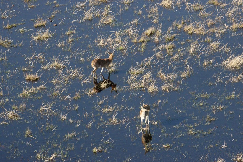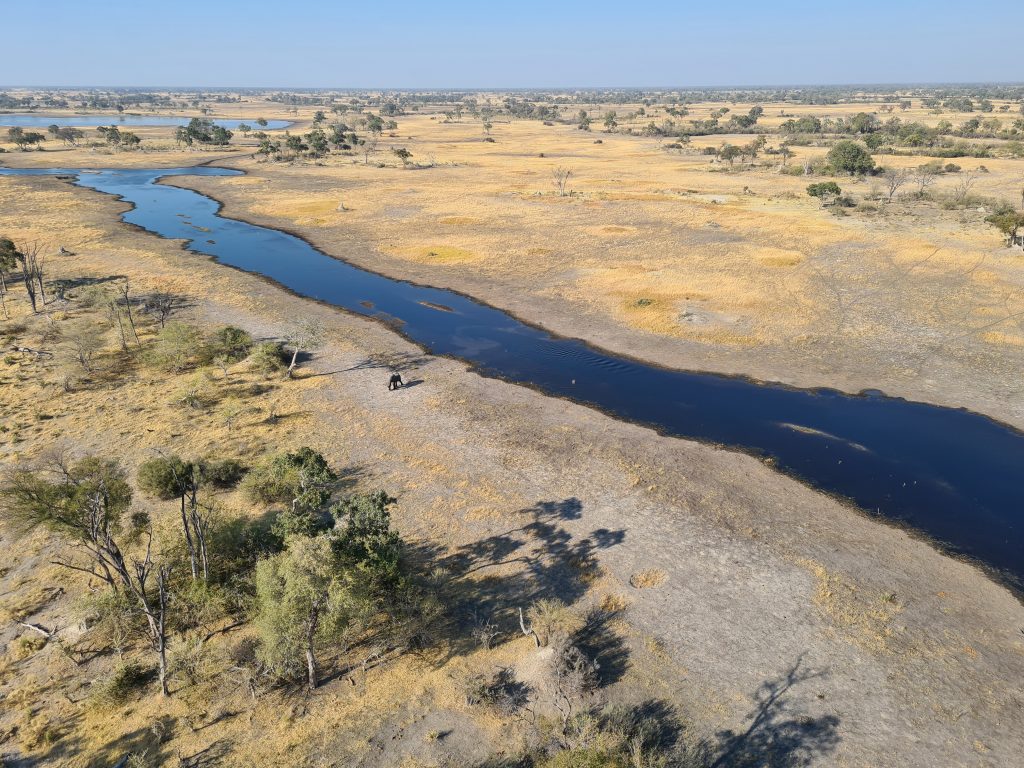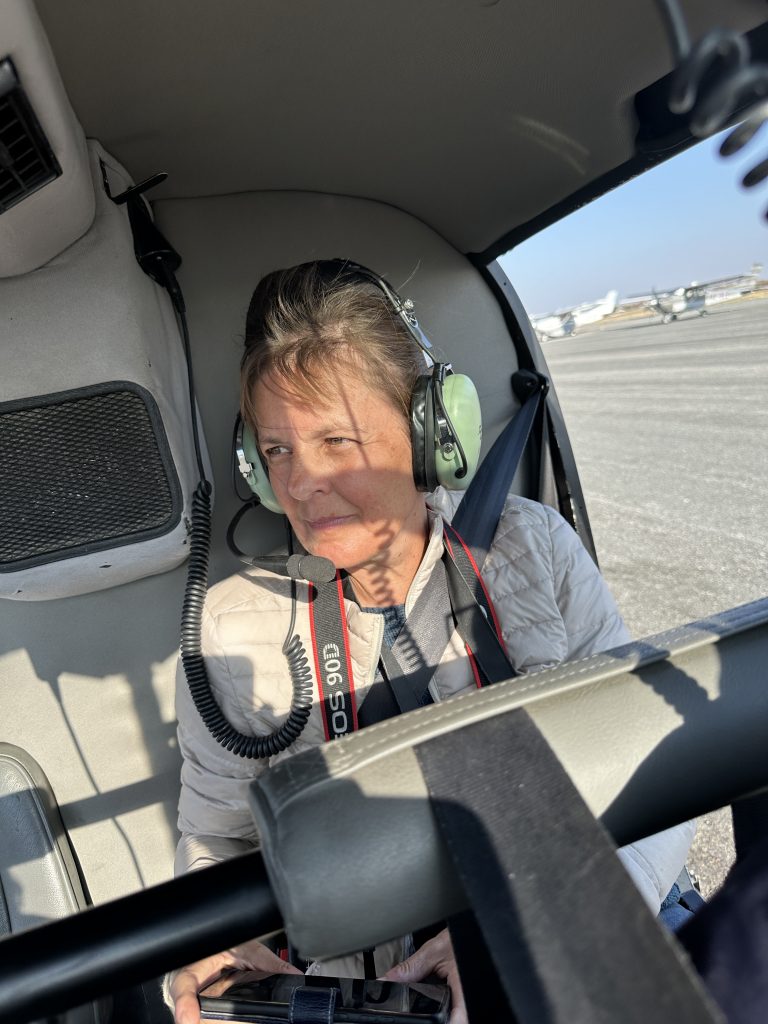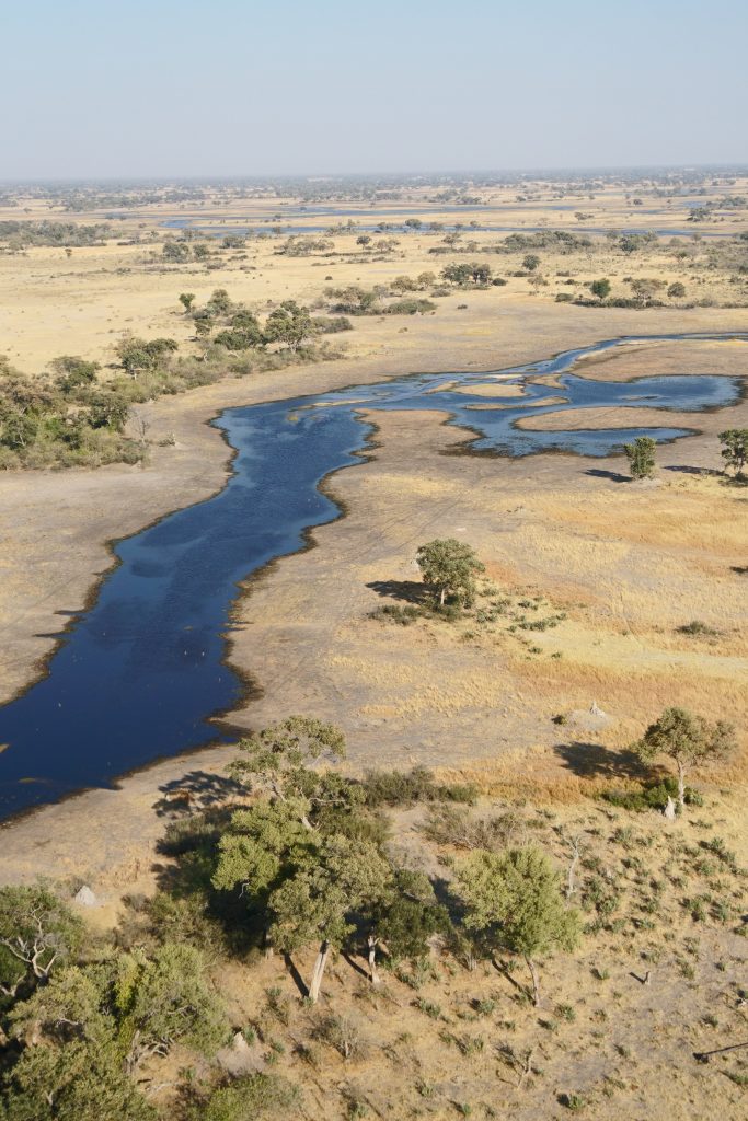 Der Tag des Helikopterflugs beginnt erneut mit den Katzen. Wir sind um 6:30 Uhr deren einzige mögliche Opfer und – wie sollte es anders sein – wir lassen uns um deren Finger wickeln und teilen die scrambled eggs mit Ihnen. Wie kann man auch Nein sagen, wenn eine Katze „Männchen macht“? Pünktlich werden wir abgeholt und zum Flughafen gebracht. Dort vollzieht sich das übliche Flughafenprozedere mit Securitycheck und Abgabe von mitgebrachten Flüssigkeiten. Dann lässt man uns am Gate warten und warten, bis irgendwann nach fast 30 Minuten doch jemand kommt und uns mit dem Auto über das Flugfeld zum Hubschrauber bringt. Wir sind die einzigen Passagiere in dem viersitzigen Helikopter. Dem cardriver wird verständlicherweise der Kopilotenplatz vorne zugewiesen, die „Chefin“ thront in zweiter Reihe und kann sich den Sitzplatz aussuchen. Unser weißer, noch recht junger, sympathisch ruhig und zurückhaltend wirkender Pilot hilft uns noch schnell beim Verstauen des Gepäcks bzw. Festgurten, dann geht es ab in die Luft. Wie beeindruckend jeder Hubschrauberflug für uns Landratten ist, kann man kaum in Worte fassen. So schwirren wir 60 Minuten über dem Delta und filmen und genießen diese atemberaubende Perspektive. Was fällt uns auf? Less animals than expected – less water than expected and no problems with our camera staff. Nichtsdestotrotz ein großartiges Erlebnis! Gleich danach werden wir mit normalem Auto in die Lodge zurückgebracht, die wir für den Rest des Tages – mit Ausnahme einer kurzen Fahrt zum Supermarkt – dann nicht mehr verlassen.