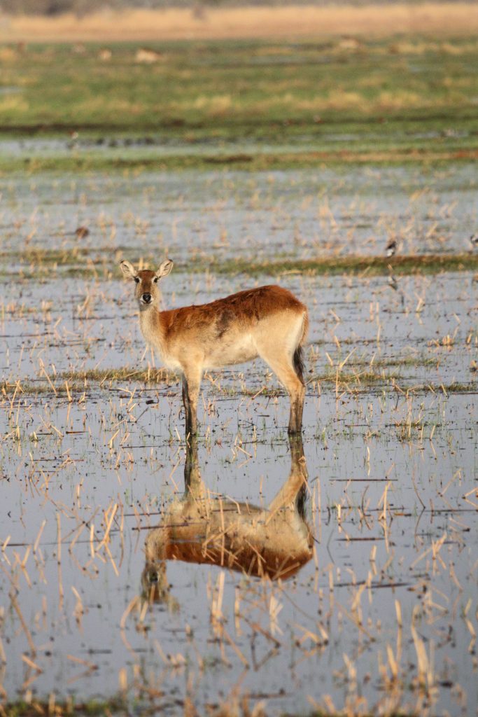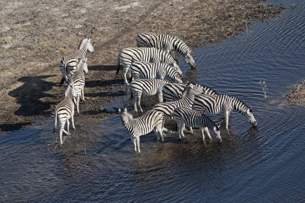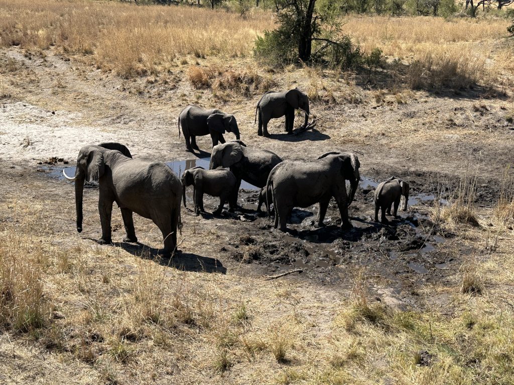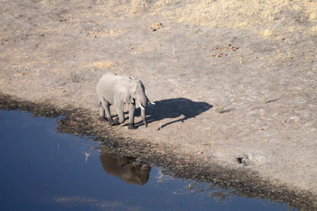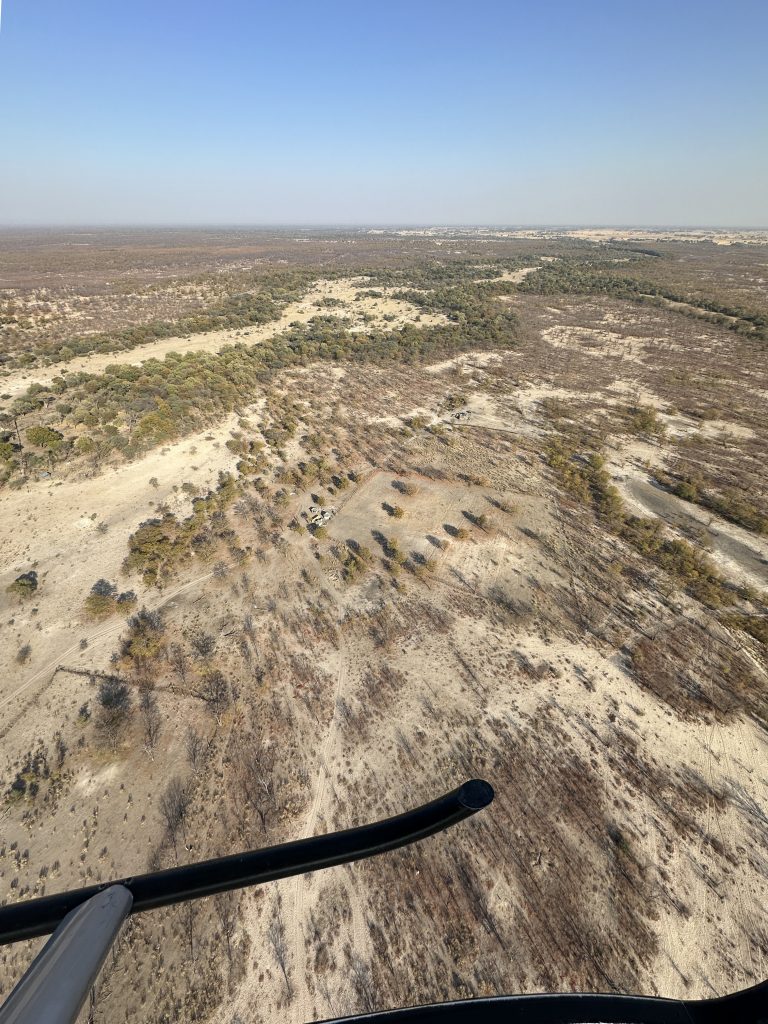 Der Tag des Helikopterflugs beginnt erneut mit den Katzen. Wir sind um 6:30 Uhr deren einzige mögliche Opfer und – wie sollte es anders sein – wir lassen uns um deren Finger wickeln und teilen die scrambled eggs mit Ihnen. Wie kann man auch Nein sagen, wenn eine Katze „Männchen macht“? Pünktlich werden wir abgeholt und zum Flughafen gebracht. Dort vollzieht sich das übliche Flughafenprozedere mit Securitycheck und Abgabe von mitgebrachten Flüssigkeiten. Dann lässt man uns am Gate warten und warten, bis irgendwann nach fast 30 Minuten doch jemand kommt und uns mit dem Auto über das Flugfeld zum Hubschrauber bringt. Wir sind die einzigen Passagiere in dem viersitzigen Helikopter. Dem cardriver wird verständlicherweise der Kopilotenplatz vorne zugewiesen, die „Chefin“ thront in zweiter Reihe und kann sich den Sitzplatz aussuchen. Unser weißer, noch recht junger, sympathisch ruhig und zurückhaltend wirkender Pilot hilft uns noch schnell beim Verstauen des Gepäcks bzw. Festgurten, dann geht es ab in die Luft. Wie beeindruckend jeder Hubschrauberflug für uns Landratten ist, kann man kaum in Worte fassen. So schwirren wir 60 Minuten über dem Delta und filmen und genießen diese atemberaubende Perspektive. Was fällt uns auf? Less animals than expected – less water than expected and no problems with our camera staff. Nichtsdestotrotz ein großartiges Erlebnis! Gleich danach werden wir mit normalem Auto in die Lodge zurückgebracht, die wir für den Rest des Tages – mit Ausnahme einer kurzen Fahrt zum Supermarkt – dann nicht mehr verlassen.
