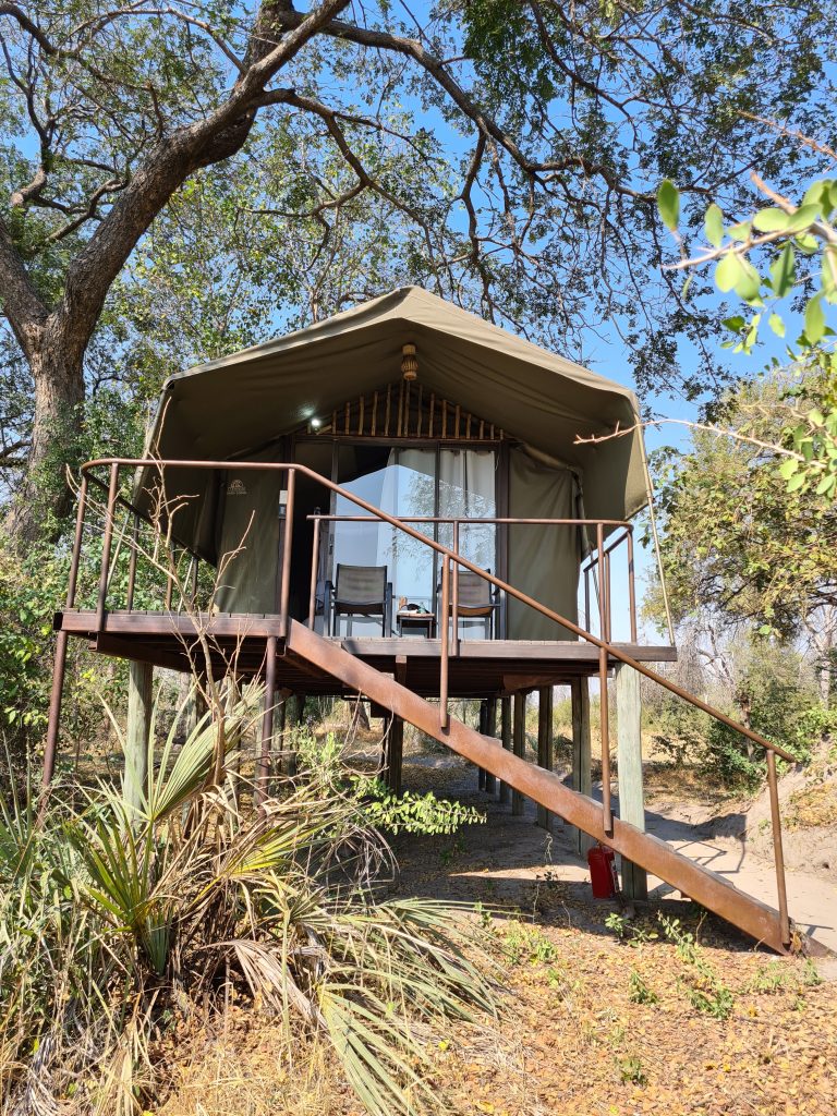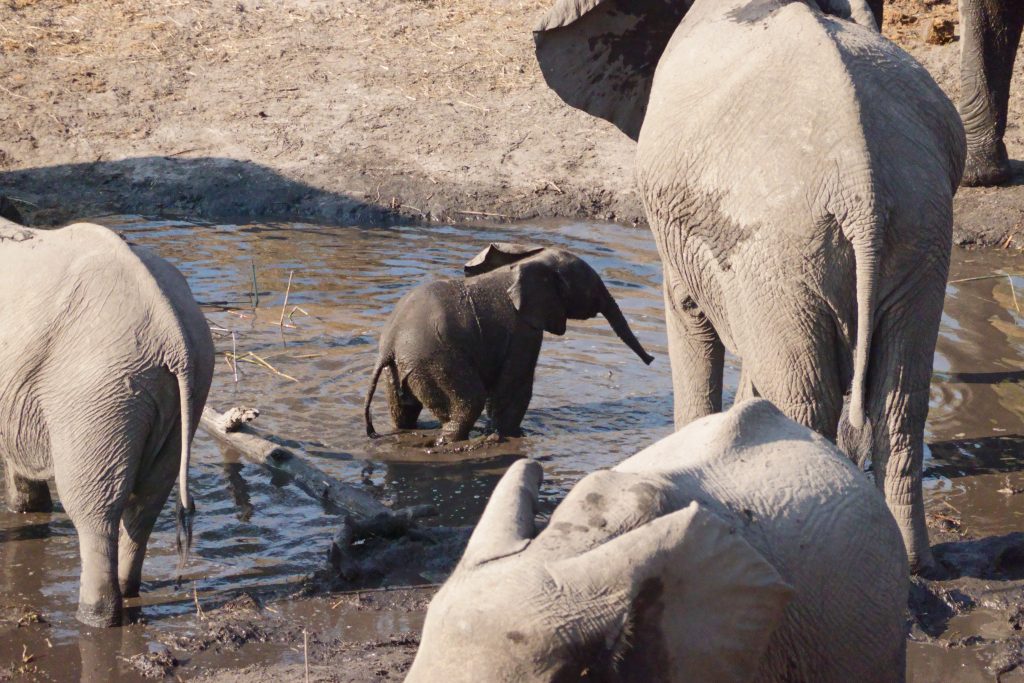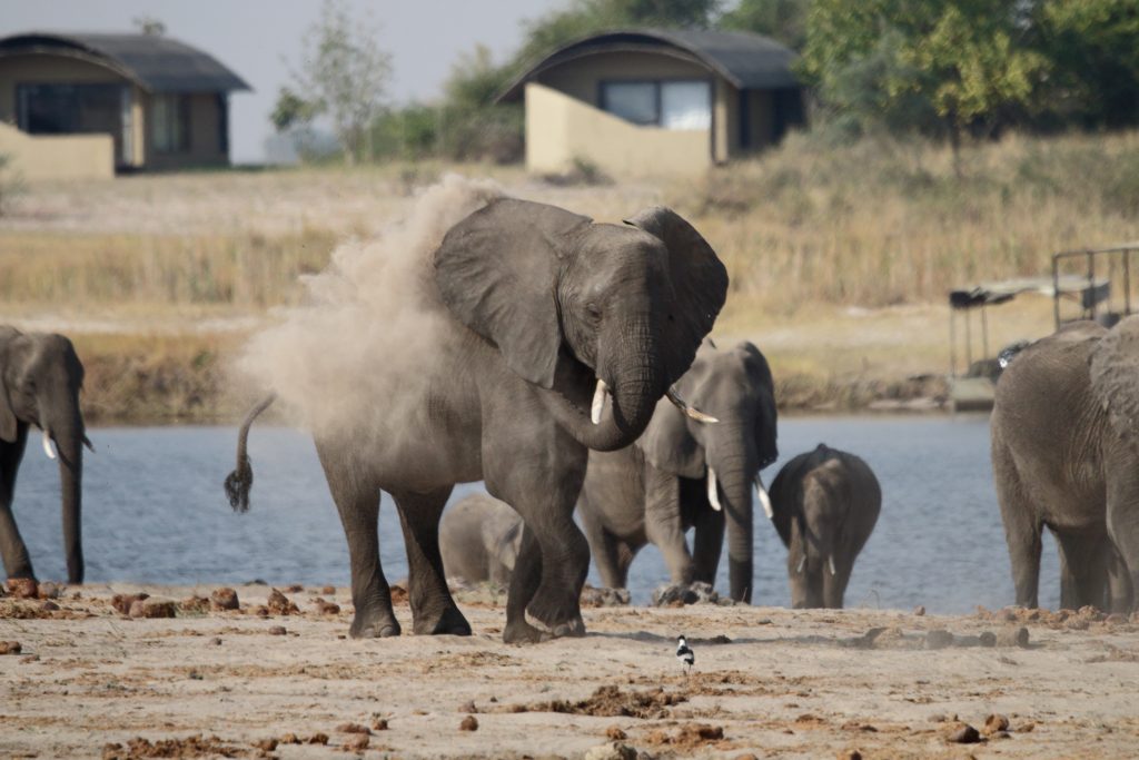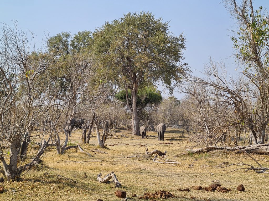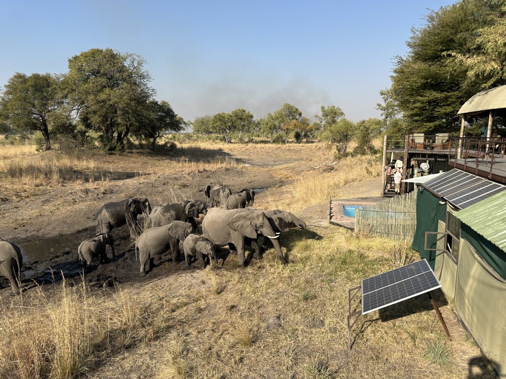 Duschen bei offener Tür bei gefühlten Minustemperaturen, aber heißem Wasser, das Schleppen der Koffer zum Auto, warmes Brot zum Frühstück im Beisein zweiter netter, arg bettelnder Hunde mit hinterhältigem, berechnendem Treublick incl. charmantem Pfote auf die Oberschenkel legend, poached eggs und Pfannkuchen mit Petersilie – so beginnt der Sonntag. Letzteres bekämpfen wir mit Blaubeermarmelade; im 200 km entfernten Kongola geben wir wieder Geld aus: 1x für Volltanken und für Shopping im Mashi Craft mit Erwerb eines Mokoroboots, einer Schüssel und zweier Schlüsselanhänger. In Sangwali 60 km davon entfernt beginnt dann die vermeintlich problembehaftete 10 km lange Zufahrt zu Nkasa Lupala. Die einzige Schwierigkeit bestand darin, dass zum Zeitpunkt der Ankunft in Sichtweise der Lodge und eines „Empfangschefs“ das Einparken und Aussteigen aus dem Auto aufgrund zweier Elefanten in direkter Nähe uns minutenweise verwehrt blieb. Nichtsdestotrotz, richtigerweise genau deshalb, sind wir eigentlich richtig begeistert, vor allem als sich Elefant für Elefant beim Wasserloch unterhalb der Veranda tummeln. Wir buchen vorschnell alle activities, für den Ankunftstag reicht es zeitlich noch für einen Fastfoodlunch und für die kombinierte Tour mit Game Drive und Bootstour auf dem Linyanti. Unser Stelzenzelt ist arg einfach und ist heiß, bietet aber einen freien Blick auf die Elefantenzufahrtsstraße. Der Gamedrive gestaltet sich dann weniger aktionsreich, Tiere außer Vögel und einem stinkenden Elefantenkadaver offenbaren sich uns nicht. Auf der Bootsfahrt mit erforderlichem Bootswechsel aufgrund von Motorschaden kommt es am Ende doch noch zu einem Highlight: eine Elefantenherde durchquert den Linyanti. Das Gesamtresümee der activity: we prefer private tours without other tourists, auch wenn diese ohne deutsche Reisegruppe vonstattenging. Insgesamt dauerte diese Kombitour bis nach 19 Uhr und war damit – vielleicht auch wegen der wenigen Tiersichtungen – einfach zu lang. Beim Dinner „sticht“ nur die Nachspeise heraus: Zimtapfelstückchen im Glas mit etwas (= zu wenig) Vanillepudding.