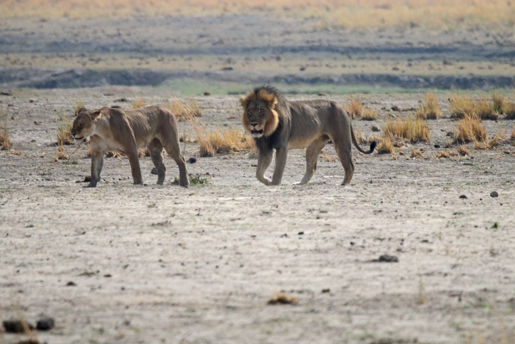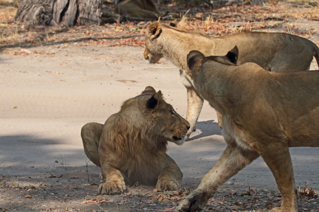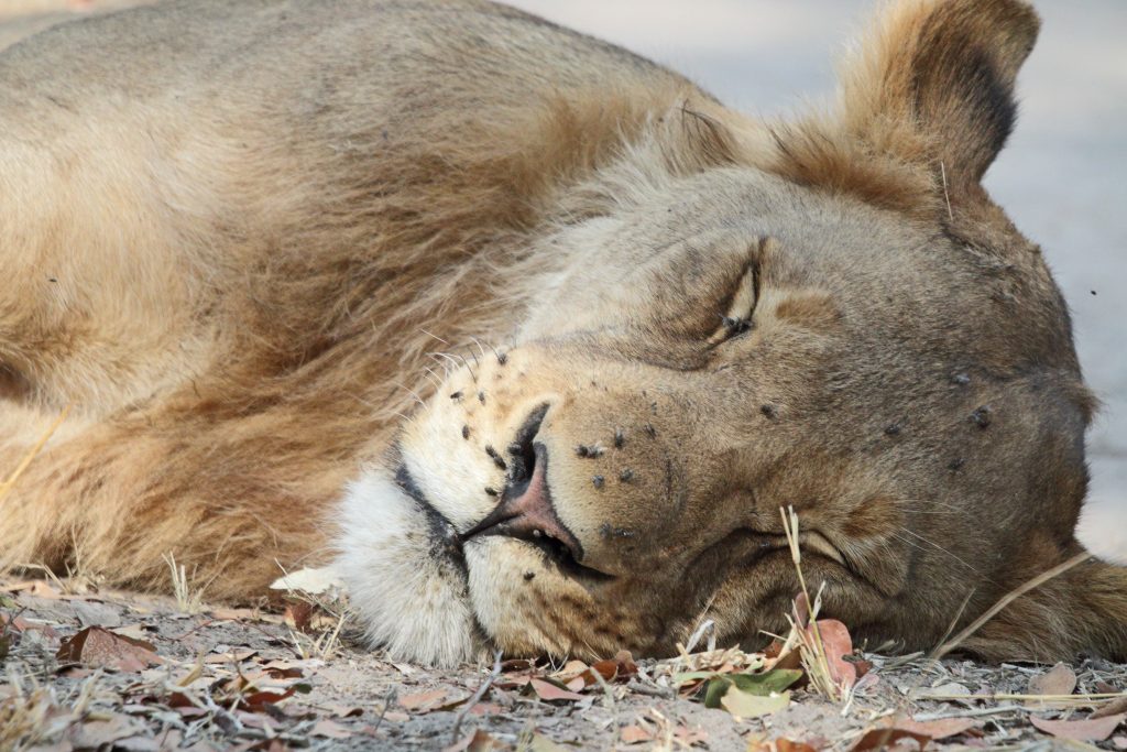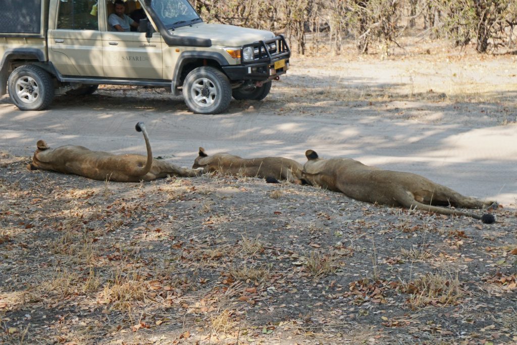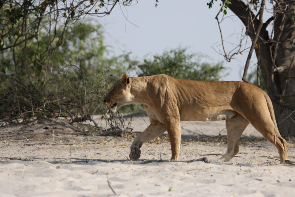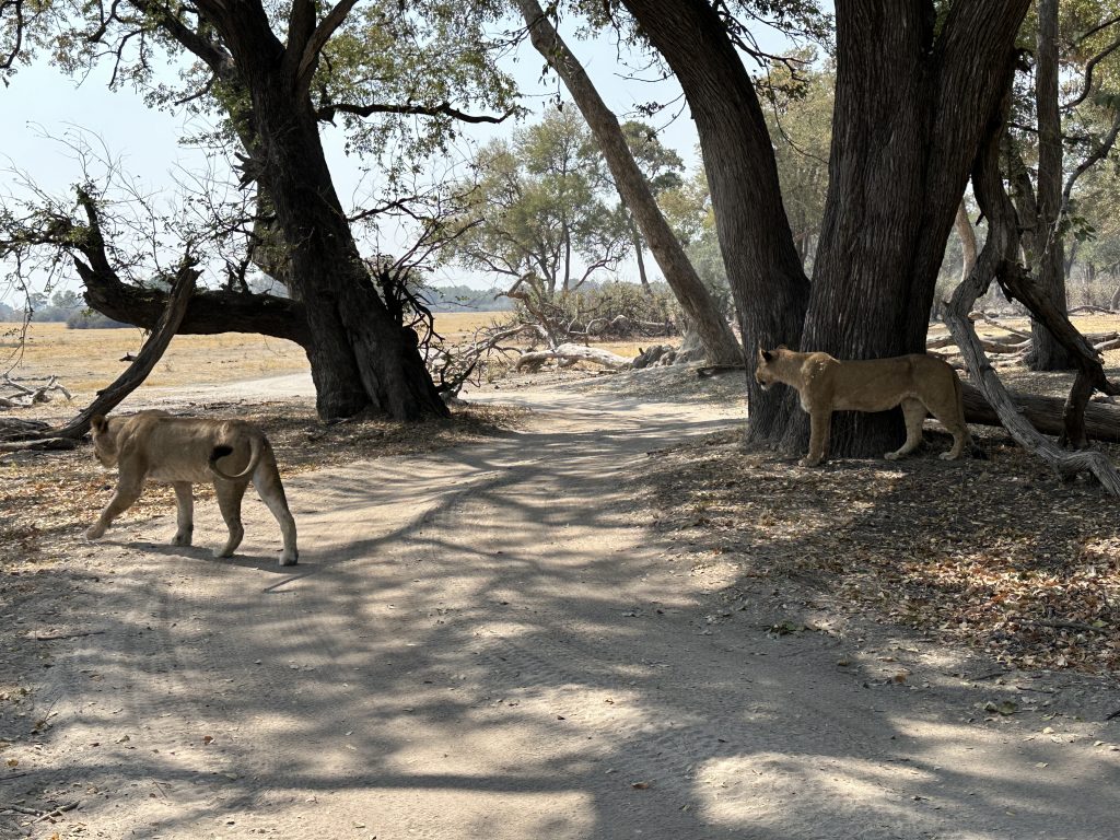 Final day in Khwai – die Koffer schon im Auto – starten wir auf die letzte „Wildnisfahrt“ in gleicher Wagenbesetzung wie am Vorabend. Wildhunde sehen wir aus der Distanz, Highlights sind aber in kurzer Abfolge hintereinander – im Minutentakt – das Hippogerippe, die zwei Hyänen im Gebüsch und links die Löwenfamilie. Dann fährt Ferry zu dem uns schon bekannten Hippopools mit den uns streng beobachtenden Hippos, den beiden Krokodilen am Wasserrand, wobei eine einen gebrochenen Unterkiefer hatte, und der langsam näherkommenden Elefantenherde an unser Kaffeestoppraststelle. Bei der Rückfahrt – eigentlich nur 5 Minuten entfernt vom Northgate – stoßen wir dann zufällig auf eine weitere Löwengruppe, die sich als Ruheplatz die Straße ausgesucht haben. So gelingen uns dann nochmals tolle Lionfotos, ein vorbeifahrender Transporter vertreibt sie zwar von der Fahrbahn, aber zu unserem Glück bleiben sie am Straßenrand. Ferry hat offensichtlich die Uhrzeit im Blick, verglichen mit der Leopardenwartezeit vom Vorabend bleiben wir doch recht kurz an dieser Stelle. Auch wir schauen immer wieder auf die Uhr, müssen wir doch heute über Stock und Stein abwechselnd von Waschbrett und Tiefsand zurück nach Maun. Zurück in der Lodge checken wir mit dem Hintergedanken zügig aus, die „Straßenlöwen“ selbst mit dem eigenen Auto nochmals zu finden. Wir haben sogar noch mehr Glück als zuvor, die zwei, drei Autos an der besagten Stelle bleiben nicht lange, sodass wir ein paar Minuten die Löwen sogar für uns allein haben. Sie machen uns sogar die Freude, sich zu erheben, um einen 150 Meter entfernten anderen schattigen Platz aufzusuchen. Die Fahrt in die Thamalakane Lodge ist dann problemlos. An der „Desinfektionsstoppstelle“ schenken wir dem alten Mann, der unsere Reifen abspritzt und uns auch bittet, mit Schuhe in die Desinfektionswanne zu steigen, auf die Frage „Do you have some food?“ noch eine Flasche Wasser und zwei Äpfel. Die Lodge erreichen wir gegen 15 Uhr. Zum Kingfisher 2 – ein Familienhäuschen am Ende der Lodgestraße – dürfen wir sogar fahren. Uns fällt auf, dass die Lodge – im Gegensatz zu vor sieben Jahren – zum Fluss hin einfach trockener und leider damit weniger idyllisch sich darstellt. Vornehmer und sicherlich auch schöner ist der Essensbereich, man sitzt bei romantisch rotem Licht des Sonnenuntergangs recht nahe am Flussufer. Das Buffet gibt es noch immer, was einerseits positiv ist, weil man sich alles aussuchen kann, das Fleisch ist aber wie früher kaum genießbar. Außerdem sind die Preise für’s Buffet mit über 30 US-Dollar eigentlich unverschämt. Negativ sind die Germans, auf die wir hier wieder stoßen, positiv die beiden zierlichen, wohl gewohnt bettelnden Katzen.