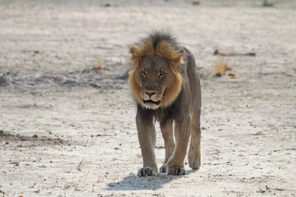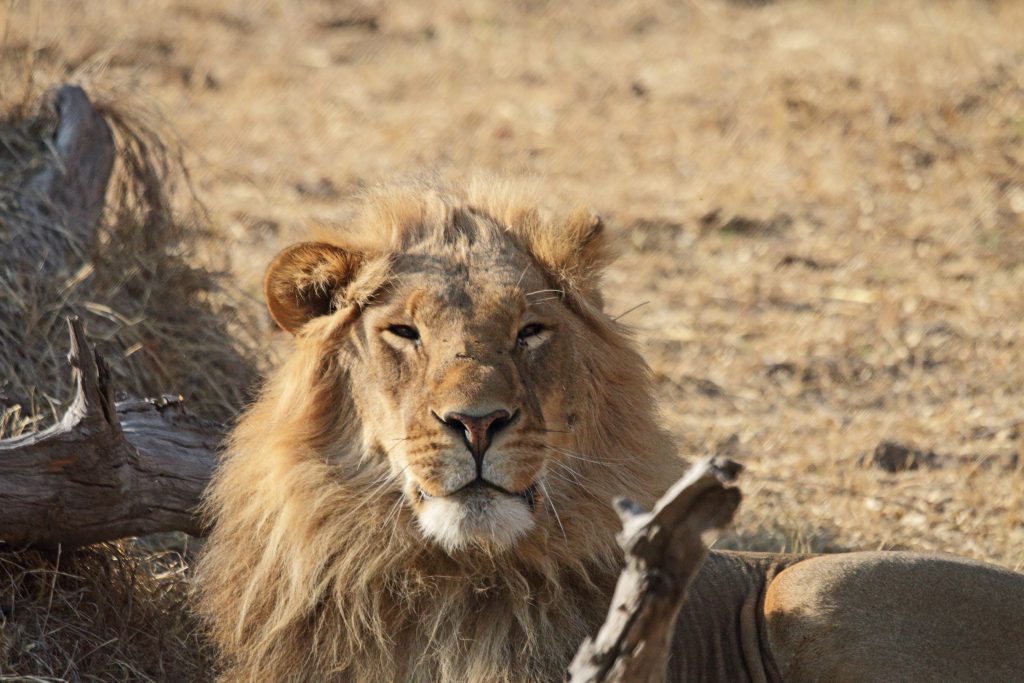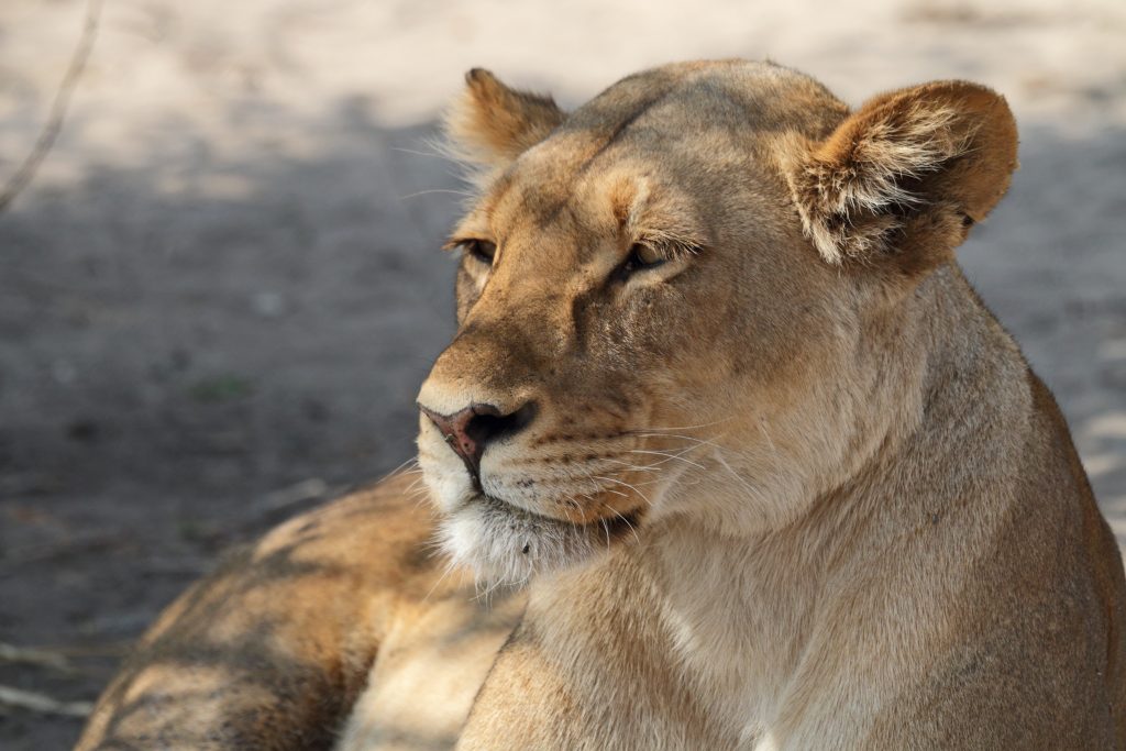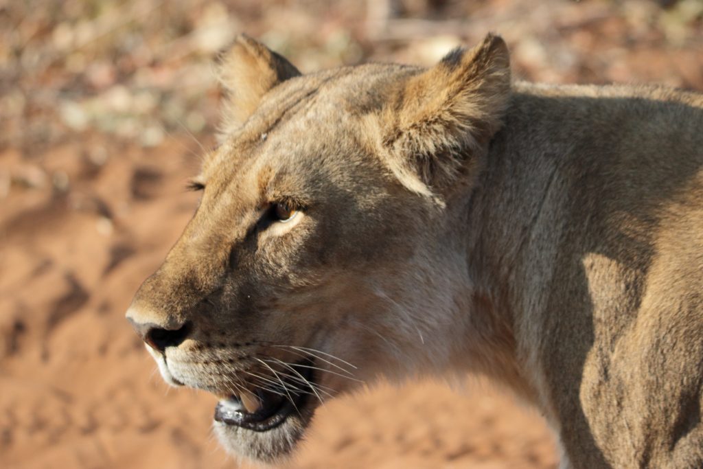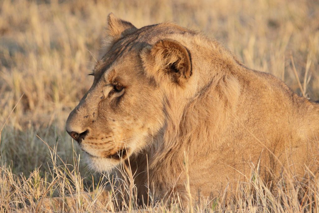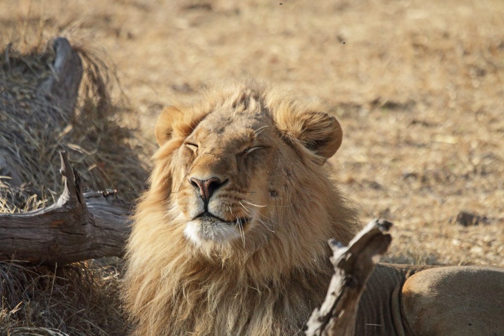 Final day in Khwai – die Koffer schon im Auto – starten wir auf die letzte „Wildnisfahrt“ in gleicher Wagenbesetzung wie am Vorabend. Wildhunde sehen wir aus der Distanz, Highlights sind aber in kurzer Abfolge hintereinander – im Minutentakt – das Hippogerippe, die zwei Hyänen im Gebüsch und links die Löwenfamilie. Dann fährt Ferry zu dem uns schon bekannten Hippopools mit den uns streng beobachtenden Hippos, den beiden Krokodilen am Wasserrand, wobei eine einen gebrochenen Unterkiefer hatte, und der langsam näherkommenden Elefantenherde an unser Kaffeestoppraststelle. Bei der Rückfahrt – eigentlich nur 5 Minuten entfernt vom Northgate – stoßen wir dann zufällig auf eine weitere Löwengruppe, die sich als Ruheplatz die Straße ausgesucht haben. So gelingen uns dann nochmals tolle Lionfotos, ein vorbeifahrender Transporter vertreibt sie zwar von der Fahrbahn, aber zu unserem Glück bleiben sie am Straßenrand. Ferry hat offensichtlich die Uhrzeit im Blick, verglichen mit der Leopardenwartezeit vom Vorabend bleiben wir doch recht kurz an dieser Stelle. Auch wir schauen immer wieder auf die Uhr, müssen wir doch heute über Stock und Stein abwechselnd von Waschbrett und Tiefsand zurück nach Maun. Zurück in der Lodge checken wir mit dem Hintergedanken zügig aus, die „Straßenlöwen“ selbst mit dem eigenen Auto nochmals zu finden. Wir haben sogar noch mehr Glück als zuvor, die zwei, drei Autos an der besagten Stelle bleiben nicht lange, sodass wir ein paar Minuten die Löwen sogar für uns allein haben. Sie machen uns sogar die Freude, sich zu erheben, um einen 150 Meter entfernten anderen schattigen Platz aufzusuchen. Die Fahrt in die Thamalakane Lodge ist dann problemlos. An der „Desinfektionsstoppstelle“ schenken wir dem alten Mann, der unsere Reifen abspritzt und uns auch bittet, mit Schuhe in die Desinfektionswanne zu steigen, auf die Frage „Do you have some food?“ noch eine Flasche Wasser und zwei Äpfel. Die Lodge erreichen wir gegen 15 Uhr. Zum Kingfisher 2 – ein Familienhäuschen am Ende der Lodgestraße – dürfen wir sogar fahren. Uns fällt auf, dass die Lodge – im Gegensatz zu vor sieben Jahren – zum Fluss hin einfach trockener und leider damit weniger idyllisch sich darstellt. Vornehmer und sicherlich auch schöner ist der Essensbereich, man sitzt bei romantisch rotem Licht des Sonnenuntergangs recht nahe am Flussufer. Das Buffet gibt es noch immer, was einerseits positiv ist, weil man sich alles aussuchen kann, das Fleisch ist aber wie früher kaum genießbar. Außerdem sind die Preise für’s Buffet mit über 30 US-Dollar eigentlich unverschämt. Negativ sind die Germans, auf die wir hier wieder stoßen, positiv die beiden zierlichen, wohl gewohnt bettelnden Katzen.