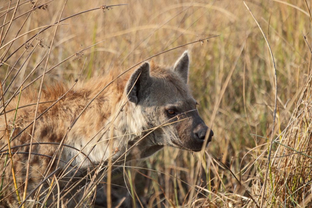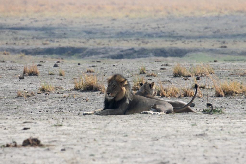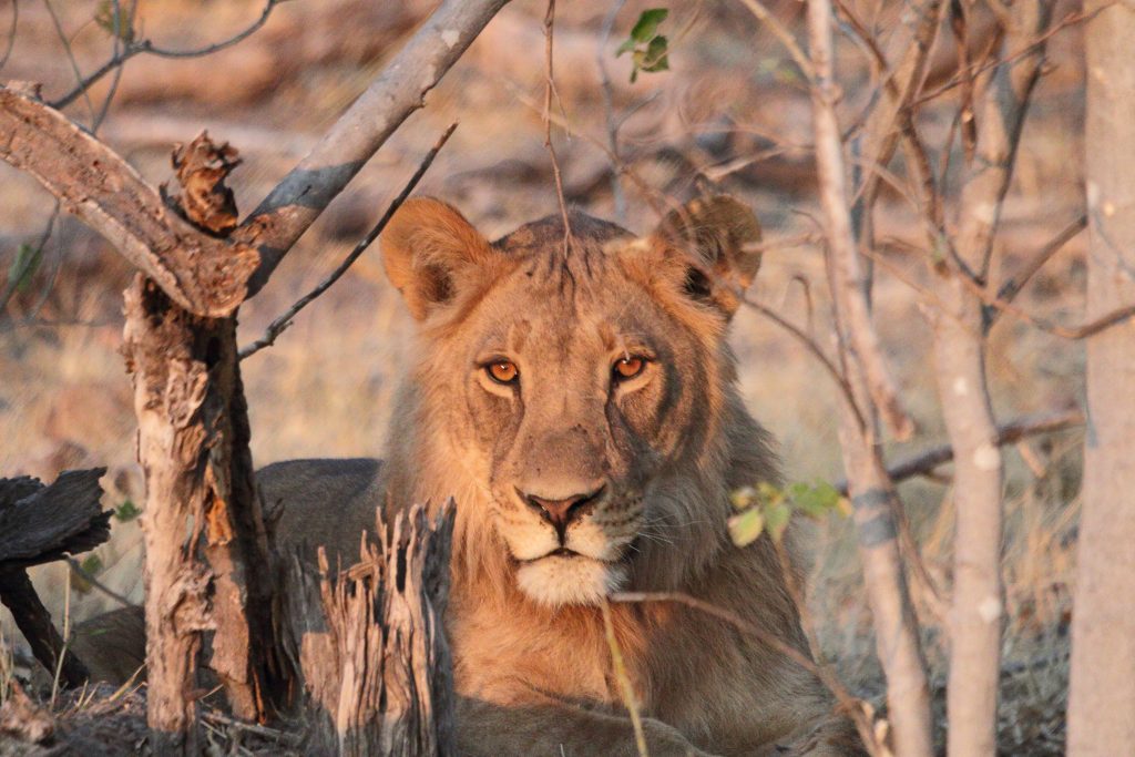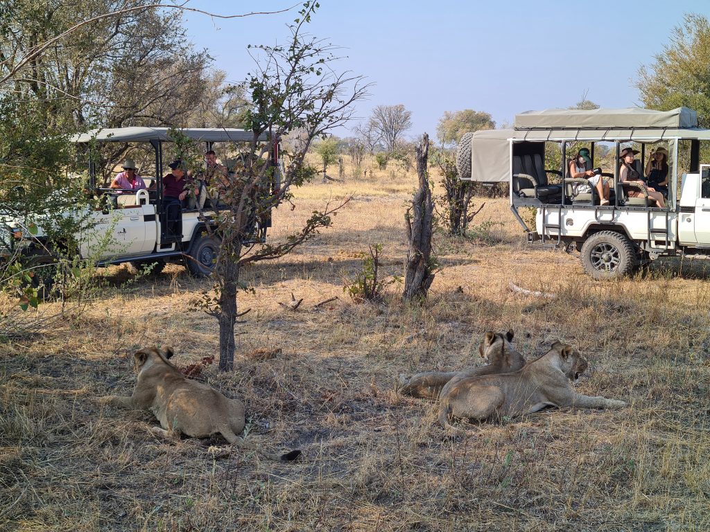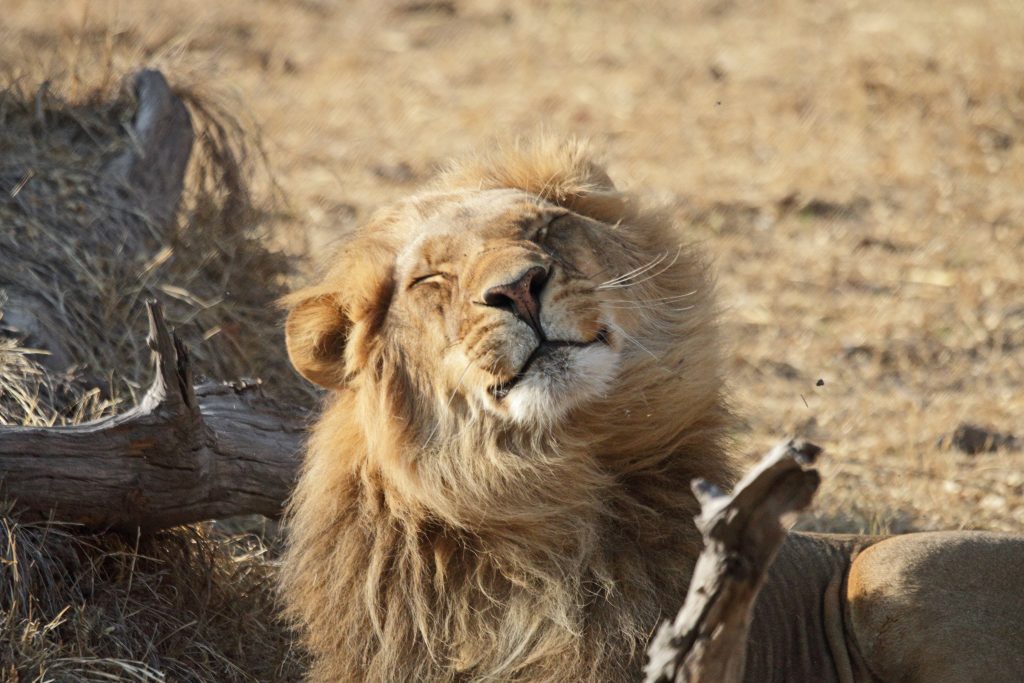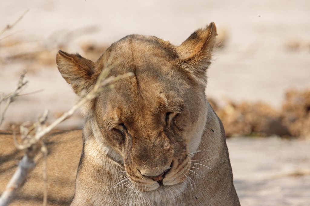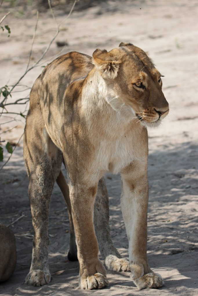 In der Nacht fällt dann der Strom aus, was den Vorteil hat, dass wir den insgesamt doch nervigen Ventilator – auch angesichts der mittlerweile kühleren Nachttemperaturen – nicht mehr ausschalten müssen. Gegen 05:30 Uhr werden wir geweckt, wobei wir natürlich schon auf waren, und Duschen und Frühstück gestaltet sich im Taschenlampenlicht dann doch etwas abenteuerlich. Im Morninggamedrive sind wir dann mit einer vier Franzosenfamilie unterwegs, die Mutter mit höchst origineller Sonnenbrille samt ihren drei Söhnen. Über den ältesten wundern wir uns vor allem in der Zeit nach der Pirschfahrt, da er seine Zeit penetrant mit Durchtelefonieren verbringt. Angesichts der Löwen, die wir nun doch zu Gesicht bekommen, verschwinden die eher kritischen Gedanken allmählich bzw. entscheiden wir uns nur Gamedrives zu machen und auf die alternativ angebotene Mokorobootstour bzw. den zusätzlich zu bezahlenden Nightgamedrive zu verzichten. Zuerst sehen wir eine einzelne Löwendame – hungrig aus dem Wäldchen kommend – und später einen recht hübschen, noch recht jung wirkenden männlichen Vertreter. Unsere Fahrt dauert insgesamt recht lang, sodass die Wartezeit bis zum Lunch bzw. zur zweiten sich in Grenzen hält. Nachmittags ist unser Safariwagen dann nahezu voll besetzt. Eine Gruppe von sechs Holländern – wir vermuten es nur – besetzt die ersten beiden Reihen hinter Ferry, unserem Fahrer auf allen vier Touren. Wir bleiben den ganzen Drive außerhalb des Parks in der Khwai Concession. Los geht es mit drei Löwen, die in der Nacht einen Büffel gerissen haben und extrem schnaufend erschöpft im Busch liegen. Die restliche Zeit kann man mit folgendem Satz beschreiben: Will the leopard come out of the bush or not? Die Antwort darauf: No, he won’t. So beschränken sich unsere Fotos auf „Buschfotos“, auf denen das Tier im Grunde silhouettenhaft zu erkennen ist. Dieses „dürftige“ Ergebnis samt fast 40 Minuten Warten teilen wir mit geschätzt noch 10 anderen Fahrzeugen, deren Versuche, den Leoparden mit Fahren in die Büsche, dass es nur so knirscht, von seiner Ruheposition in den Sträuchern zu vertreiben, auch nicht erfolgreich sind. Nach dem Sundowner haben wir noch Glück, eine recht große Elefantenherde zieht an uns vorbei und beim Zurückfahren treffen wir noch eine Hyänengruppe – fast schon bei Dunkelheit – samt wild herumtollendem Nachwuchs. Abends gibt es Steak – well done ohne Fragen – samt mashed potatoes und Kuchen mit Sauce. Insgesamt gefällt es uns hier mittlerweile doch recht gut, die Frage, ob uns eine luxuriösere Lodge im Moremi nicht noch besser gefallen hätte, steht unbeantwortet weiter im Raum.