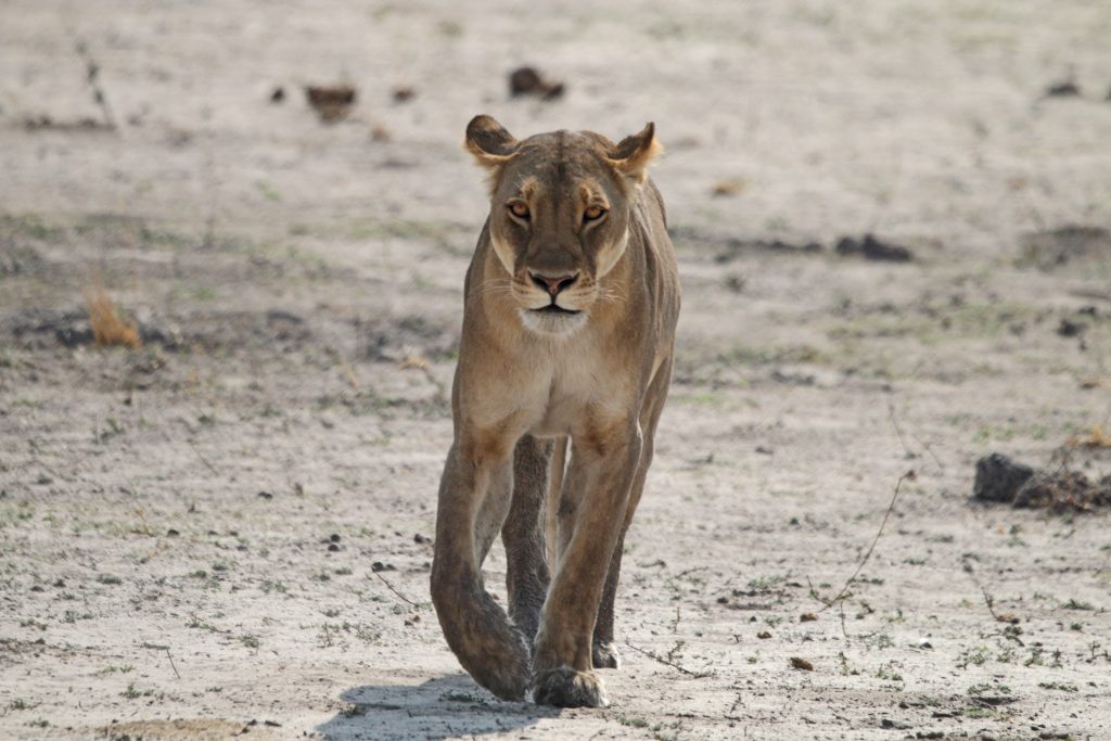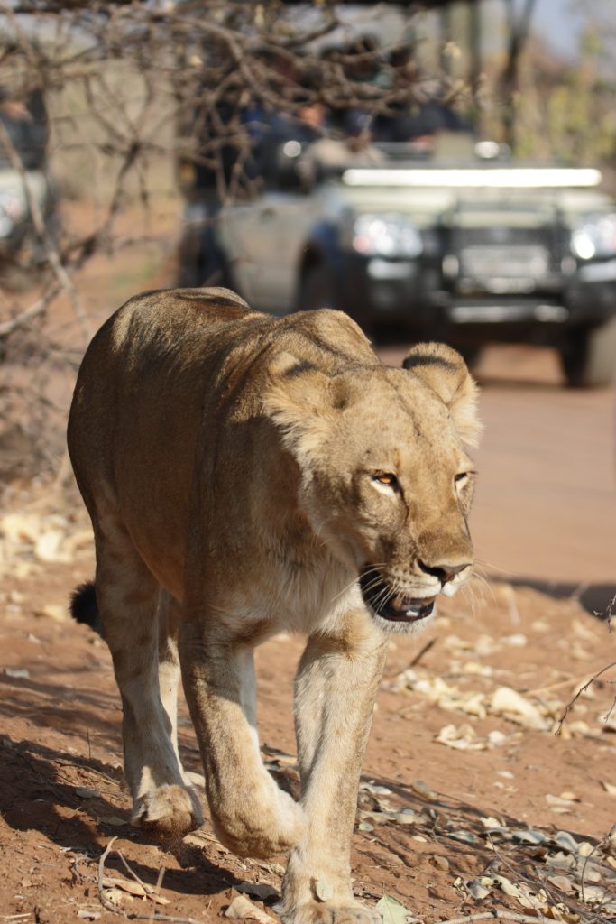 Der Tag verläuft wie der gestrige, nur ohne ATM, Shell und Spar. Der gleiche freundliche Kellner wie gestern, Joghurt, scrambled eggs mit Pilzen, ein Banana Cake, viele Elefanten, Kudus, ein paar weniger Hippos, ein paar weniger Giraffen und die Büffel dieses Mal oben auf der Straße, die für kurze Zeit hektisch auseinanderlaufen, weil sich ein Löwe nähert. Besagten bekommen wir nur im Background für wenige Sekunden zu Gesicht. Eine andere Löwin kommt uns dann schön deutlich länger näher. Noch vor 9 Uhr entdecken wir eine Safariwagen, deren Fahrer und seiner Passagiere von uns aus gesehen rechts in die Büsche blicken. Plötzlich kommt die Löwin heraus, wir versuchen ein paar Meter rückwärtszufahren, was aber nicht gelingt, dann drehen wir um und reihen uns hinter die mittlerweile drei Wagen ein, die dann auf der linken Seite am Straßenrand auf die Löwin warten. Wir überholen und plötzlich ist sie vor uns, Gott sei Dank auf der rechten Seite, sodass wir zu ihr aufschließen und vielleicht eine Minute parallel zu ihr fahren können. Sie beschleunigt, wir werden schneller, die „Chefin“ hüpft von links vorne nach rechts hinten und Frau Löwin ist phasenweise wirklich nur einen Meter von unserem Auto entfernt. Wir sind begeistert – von der Löwin und auch von unserem Vorpretschen, die anderen Safariwagenfahrer sehen dies sicherlich anders. Auf jeden Fall ernten wir die eine oder andere unfreundliche Geste, schlechtes Gewissen kommt aber nicht auf. Dann geht es wie gestern auf der nahezu gleichen Route bis zu unserem Umkehr-Stretch-Point mit den Rindern mit Kuhglocken, bei der man – schließt man die Augen – meinen könnte, man wäre auf einer bayerischen Alm … Hier beobachten wir noch ein paar Geier, die sich um die Überreste einer Antilope streiten. Den üblichen Elefantenaufmarsch in Richtung Chobe River erleben wir erst nach Serondela. Gegen 15 Uhr sind wir dann wieder in der Chobe Marina Lodge auf unserem Balkon. Nach zwei Nussecken fällt dann die Entscheidung, dass wir auch heute das Dinner ausfallen lassen. Einig sind wir uns außerdem, dass uns die drei Tage sehr gut gefallen haben und dass wir – maybe in 7 years – wiederkommen werden. Abends inspizieren wir noch das Hauptgebäude samt Pool und dem Steg, an dem die hoteleigenen Boote anlegen. Hier merken wir dann erstmals, dass die Chobe Marina ein großes Touristenhotel ist.