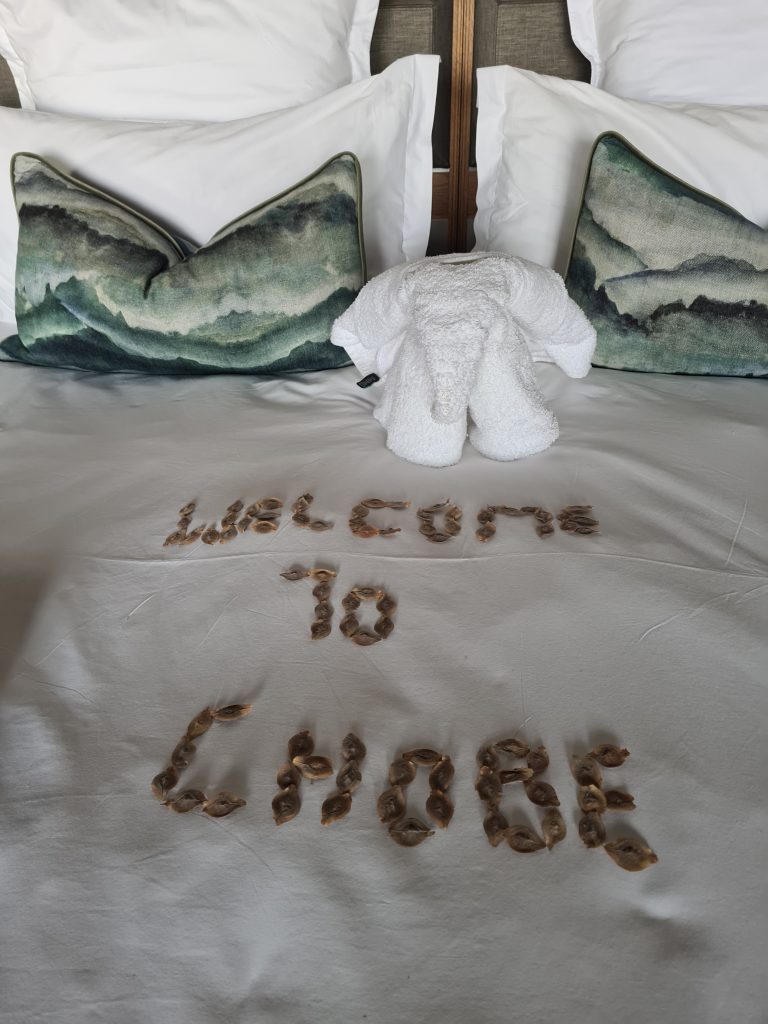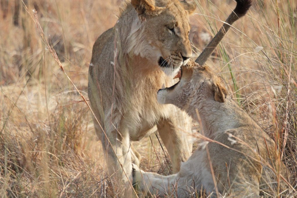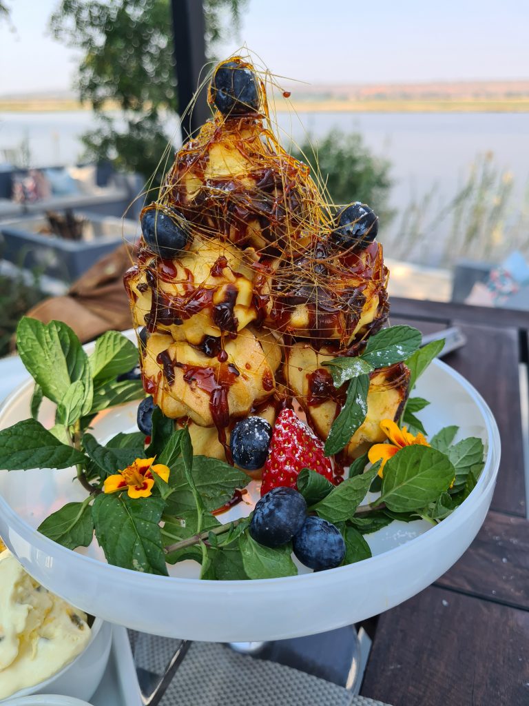 Um 6:30 Uhr sitzen wir vorne beim Frühstück. Das Standardangebot wird auf einer Etagere gebracht, wir ordnen Eggs Benedict und normalen Toast. Um 7:20 Uhr werden wir von unserem Stellvertretermanager Joel mit den vorausgefüllten Formularen für die Emigration und Immigration versorgt. Mit Kelvin geht es dann per Boot – nach dem Stopp auf der Namibiaseite – wir gehen allein zum Office hoch, müssen dort aber leider etwas warten, weil der Schalter verwaist ist – und dann wieder per Boot zur Botswanaimmigration. Hier klappt alles wie am Schnürchen. Wir werden von David und Safariwagen schon erwartet, dann geht es zum 4. Mal in den Chobe N. P. David wählt natürlich eine andere Route wie wir – weiter im Landesinneren – und es dauert folglich auch nicht lange, bis wir aus der Ferne die ersten Löwen sehen. Leider wagt David es nicht, über Stock und Stein näher an sie heranzufahren, sodass uns wirklich tolle Fotos aus der Nähe nicht möglich sind. Dann geht es näher zur uns schon bestens bekannten River Road und wieder dauert es nicht lange, dass uns oberhalb einer Tiefsandstelle eine weitere Löwengruppe mit drei Cubs erwartet. Wir wären – sofern keine anderen Safariwagen hier stehengeblieben wären – sicherlich daran vorbeigefahren. Ideal ist unser Beobachtungspunkt auch hier nicht, wir blicken von unten nach oben und rangieren kann David aufgrund des Tiefsands auch nicht. Nichtsdestotrotz sind wir „zufrieden“, alle anderen Tiere begegnen genauso so wie wir es auf unseren Pirschfahrten gewohnt waren. Nach einem Serondelastopp müssen wir uns zeitlich bedingt wieder auf den Rückweg machen. Mehr aus dem Bauch heraus fragen wir David, ob er nicht noch einmal einen Kurzstopp bei den „ersten“ Löwen einlegen könne. So kommen wir dort hin – und beobachten andere, die unerlaubt querfeldein auf die Löwen zufahren. So fällt es leichter, auch David davon zu überzeugen und wir sind am Ziel unserer Wünsche: 5 Meter Abstand zu unseren Lieblingsraubkatzen. Dann geht es zurück: Botswanaemigration – Boot – Namibiaimmigration – Boot – Lunch mit Salat und Choux Pastry als Nachspeise, einer Art Windbeutel, kreativ verziert samt Maracujaeis. Um 15.30 Uhr geht dann unsere zweite, etwas kürzer geplante Bootsfahrt los. Wie unterscheidet sich diese von der am Vortag? Sie ist kürzer, wir sind hautnaher an den Hippos und Elefanten dran und beobachten als absolutes Highlight eine Elefantenherde, die sich schwimmend von Botswana nach Namibia auf den Weg macht. Ein faszinierendes Erlebnis! Auf jeden Fall lassen sich auch viele andere Boote dieses Spektakel nicht entgehen, wir werden sogar einmal leicht gerammt: Unabhängig davon verdient unser Kapitän Kelvin ein Sonderlob. Dank ihm waren wir immer in der ersten Reihe. Dann geht es zügig zurück schnurstracks auf die Sunsetveranda – vom Bootsanlegesteg die Treppen hoch und dann rechts über eine etwas schwankende Hängebrücke. Frau Obermanagerin verwickelt uns dann bei einem Gin & Tonic noch in ein oberflächliches Gespräch. Dann eilen wir ins Zimmer, duschen schnell und sind um 19 Uhr beim Dinner vorne. Heute gibt es Steak mit Kartoffelbrei, eine Lachscreme als „Gruß des Hauses“, ein nicht definierbares Eis als Zwischengang und eine Panna Cotta und eine delicious Schokoladenkreation Lava wieder mit ein paar Gläser Pinotage und sparkling water. Besagten Pinotage haben wir auch für unser Zimmer bekommen, lt. Dr. Google Glühweinqualität für 6,45 €. Kein Wunder, dass uns die bisherigen „Tischweine“, die wir in den vorherigen Lodges geordert hatten, besser geschmeckt haben.