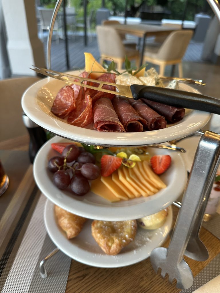 Um 6:30 Uhr sitzen wir vorne beim Frühstück. Das Standardangebot …