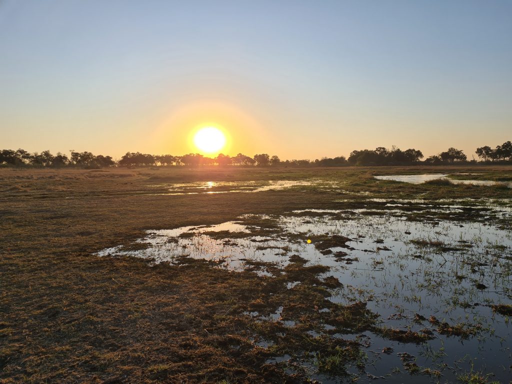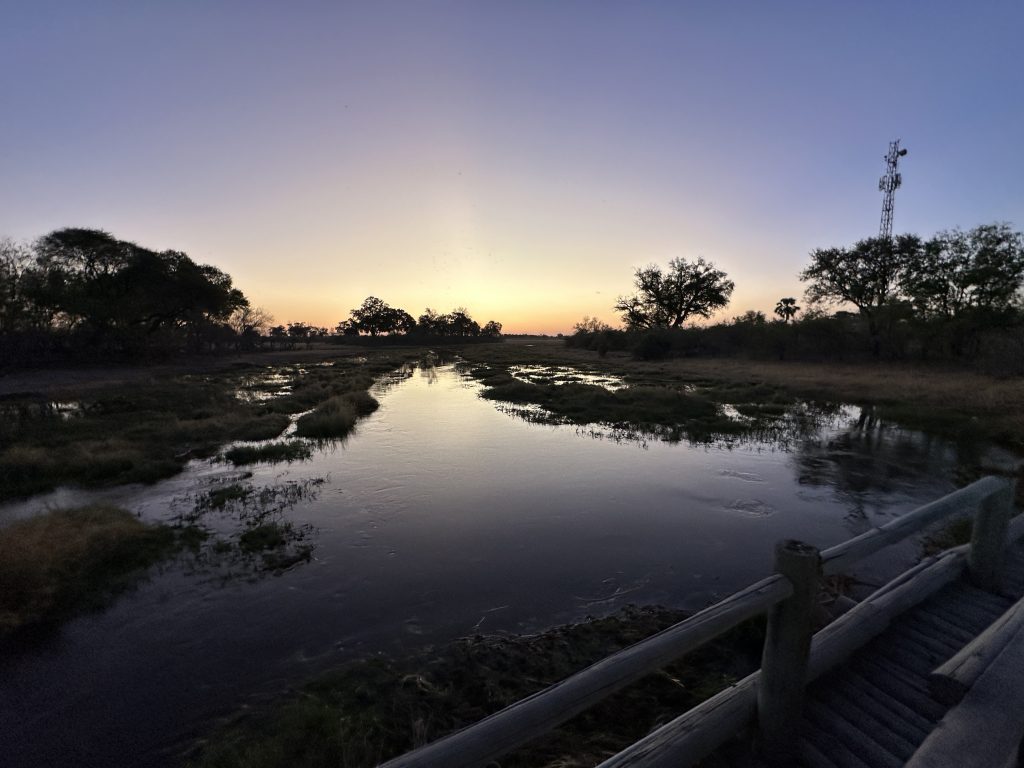 Frühstück gäbe es ab 7:30 Uhr, wir bekommen es um 7 Uhr und sind folglich kurz davor schon da. Der junge Mann ist wie schon gestern nett und versorgt uns mit all dem, was wir brauchen. Zwar füllt sich das Angebot auf den Tresen erst allmählich, aber für uns reicht es vollkommen. Gegen 7:20 Uhr checken wir aus und machen uns gen Moremi bzw. Khwai auf den Weg. 58 km bis zur Abzweigung, 30 bis zum Southgate und von dort aus 32 km bis zur Lodge kurz nach dem North Gate. Erfreulicherweise ist der uns von 2017 schon bekannte furchtbare Abschnitt länger geteert als damals, insgesamt nervt das Fahren dort schon gewaltig, auch wenn die Piste breit ist. Bei der Gabelung – rechts geht es über Savuti gen Chobe und links zu unserem Ziel – wird es leichter zu fahren. Recht viel Tiefsand haben wir nicht zu bewältigen und gegen 09:50 Uhr sind wir beim Southgate. Hier werden wir als Transportunternehmen zweckentfremdet und dürfen eine Tüte samt Klopapier zum North Gate mitnehmen. Für diesen Anschnitt brauchen wir 70 Minuten – es läuft also alles nach Plan. Abschnitt 3 verlängern wir, da wir eher zu früh dran sind, mit einem Abstecher zu den Hippopools samt Aussichtsplattform und wackliger, steiler Holzleiter. Zur Mainroad und danach zum Northgate finden wir dank GPS und perfekt anleitender „Chefin“ easy zurück, kurz nach der Paperwork und dem Bezahlen incl. Klopaierabgabe geht es über die mit Gummimatten ausgelegte Holzbrücke – damit sind wir wieder außerhalb des Moremi – durchs Village Khwai – offensichtlich recht verarmt und ohne Stromanschluss – ins Khwai Guest House. Max springt schon beim Rausfahren aus seinem Häuschen und erwartet uns wohl schon. Auf jeden Fall scheint er unsere Namen kurz vorher gelesen zu haben bzw. ist die Anzahl der Neuankömmlinge heute überschaubar. Max weist uns in die Abläufe ein, zeigt uns das arg spartanische Häuschen mit der Nummer 8 beim Pool. Dann bekommen wir sogar noch einen verspäteten, einfachen Lunch. Gegen 15:30 Uhr startet unser erster Gamedrive. Privat, ohne andere Touristen an Bord, was uns natürlich freut, aber leider auch ohne Löwen. Insgesamt verbirgt sich die Tierwelt, von hochgradiger Begeisterung werden wir auf jeden Fall nicht erfasst. Wir sind früh zurück und warten dann lange aufs Abendessen, erwartungsgemäß Huhn und als Beilage Reis. Der Nachtisch ist – wie fast befürchtet – ein Kuchen mit Vanillepudding. Den Ventilator drapieren wir innerhalb des Moskitonetzes, denn Klimaanlage gibt es hier nicht.