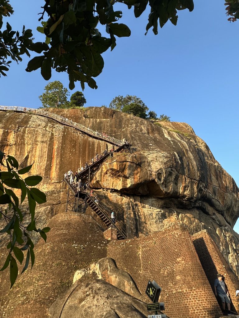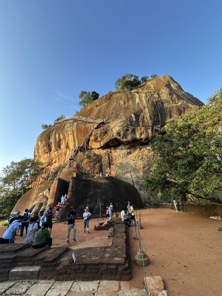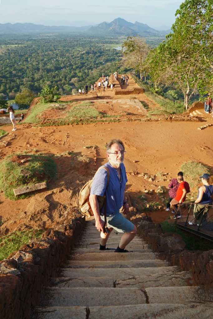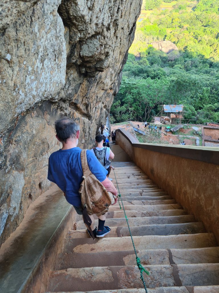 Früh zu Bett und am nächsten Morgen früh auf mit dem ersten „eigenen“ Kaffee im Zimmer: So beginnt der erste ganze Tag in Sri Lanka. Noch bei Dunkelheit verlassen wir mit voll gepacktem Auto und Take-away-Frühstück das Hotel um 5:30 Uhr. 20 Minuten später stehen wir bei Ticketcounter für den Sigiriya-Felsen. Leider benötigt man printed tickets, unser Onlineausdruck reicht nicht und – … system error. So warten wir halt wieder einmal, bis endlich der PC funktioniert. Um 6:15 Uhr geht die Schnauferei mit vielen Stufen und für die Uhrzeit überraschend vielen vielen anderen Touristen los. Auch wenn es anstrengend ist und die eine oder andere Kurzpause erforderlich wird, sind wir 45 Minuten später „on the top“ am summit. Manchmal kommt es beim Hochklettern direkt zum Stau, dass man — manchmal erfreulicherweise — kurz warten muss. Vor allem bei den metallenen Treppen geht es ganz schön eng zu, auch wenn die Stufen in Teilbereichen durch Metallseile für die Hinaufgehenden von denen für die Herabgehenden getrennt sind. Außerdem stoßen wir bei beiden Etappen auf Touristen, die sich zu viel zugemutet haben. Das Wetter ist auf jeden Fall traumhaft und die Sicht super. Einmal oben angekommen ist das Gelände dort in den Ruinen so weitläufig, dass man nicht so „aneinanderklebt“ wie beim Hochsteigen oder beim Herabgehen. Wir halten uns gut zwanzig Minuten auf der „Hochebene“ auf und machen wie immer unsere Fotos. Beim Runtergehen werfen wir natürlich auch noch einen Blick auf die Wolkenmädchen. Von der engen Metallwendeltreppe und der Tatsache, dass man offiziell nicht fotografieren darf, haben wir uns nicht abhalten lassen und schießen heimlich sogar ein Not-allowed-Foto. Leider in mieser Qualität! Um 7:45 Uhr sind wir dann schon wieder am Auto, schneller und früher als erwartet. Über Dambula, Bakamuna, Hettipola, Mahiyanganaya und Badula – hier kaufen wir kurz ein und tanken erstmals – geht es 180 km nach Ella. Unser erster Supermarkt Food City Express verhilft uns zum ersten Coke Zero. Beim Hin- und Herrangieren beim Tanken touchieren wir den Lenker eines kleinen Motorrads. Gott sei Dank bleibt dies folgenlos – keine Kratzer an unserem Auto und ein freundliches Sorry reicht, um das Missgeschick, an dem der Rollerfahrer sicherlich auch mitschuldig war, vergessen machen zu lassen. Die TipTop-Lodge erreichen wir um 13:30 Uhr. Ella zeigt sich regnerisch, very very touristisch und verschreckt uns etwas, die Lodge auch, sie ist zwar OK, vom Ambiente aber steril. Sie erreicht man über einen engen, am Ende steilen Weg und liegt oberhalb der influencerbedingt berühmten Eisenbahnstrecke. Die 9-Arches-Bridge sehen wir aus der Ferne, den Besuch vertagen wir aber auf morgen Früh, in der Hoffnung, dass wir dann leichter einen Parkplatz, der nahe am Trailhead zur Brücke ist, finden bzw. dass das Wetter wieder besser ist. Aktuell sehen wir nur eine weiße Nebelwand. So sitzen wir gerade bei geöffneter Balkontüre im Trockenen und trinken Kaffee und Tee.