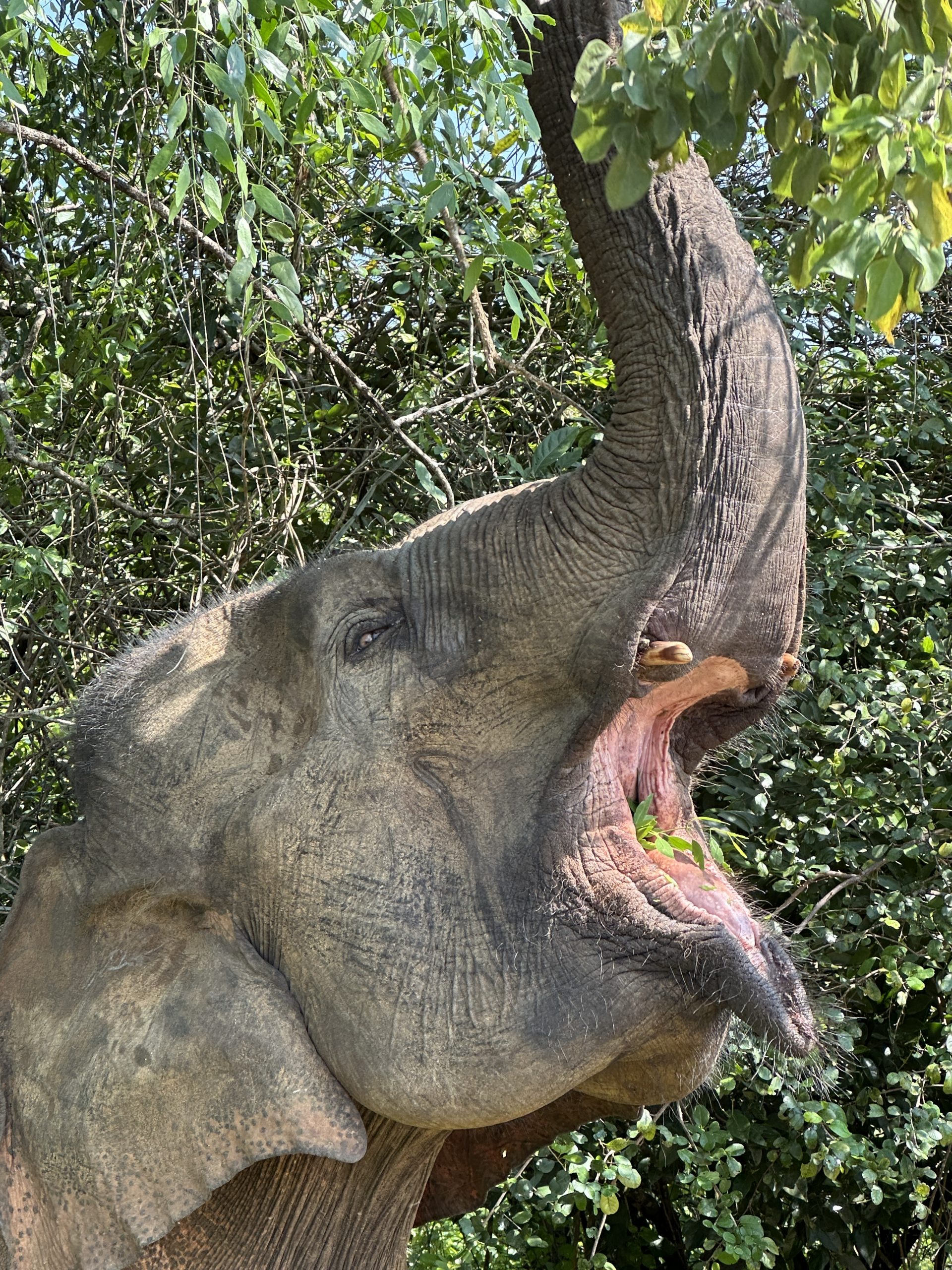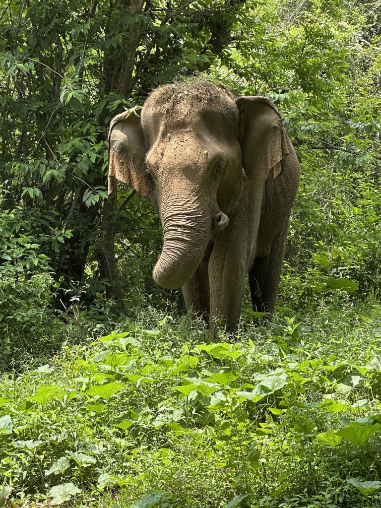 Um 7:30 Uhr sind wir oben beim Frühstück, die Koffer haben wir schon ins Auto gebracht, um dann zunächst unverrichteter Dinge fast orientierungslos herumzustehen, denn weder Tische noch Buffet sind fertig. Irgendwer bringt ohne Aufforderung bzw. Genehmigung unser restliches Gepäck nach oben. Auch das ist strange, denn unsere ganzen, nicht billigen Kamerautensilien werden von fremder Hand ohne unsere „Aufsicht“ herumgetragen. Wir setzen uns hin und warten, um uns wird noch geputzt bzw. werden in aller Gemütlichkeit — ohne uns zu beachten und Stress aufkommen zu lassen — die Tische betont langsam gedeckt. Really non perfect! Gegen 8:00 Uhr dürfen wir endlich einmal bestellen — scrambled eggs und French Toast — der kurz zuvor georderte Tee und Kaffee wird dann auch gebracht — und das Buffet ist — man glaubt es kaum mit vielen unbekannten süßen Teilchen auf einem Tisch beim Infinitypool dargeboten — fertig. Eine halbe Stunde später verlassen wir dann das Hotel — mit der nachvollziehbaren Entscheidung „We won’t come back!“ Die steile enge Straße geht es vorsichtig langsam nach oben, dann auf der Straße 10 Minuten Richtung Ella runter bis zum Parkplatz, an dem man hinunter zu den 9 Arches gehen kann. Gott sei Dank ist der manchmal recht steile Weg geteert bzw. gepflastert, nach 15 Minuten erreichen wir den Bahnsteig ohne schmutzige Schuhe, ohne Blutegel, aber schon leicht verschwitzt — mit geschätzt 250 anderen Touristen, um herdenhaft wie in einer Touristenhochburg gemeinsam auf den ersehnten Zug zu warten. Gegen 09:45 Uhr kommt er endlich und fährt — ohne zu stoppen — langsam auf den Tunnel zu. Wir fotografieren und fotografieren — und machen uns dann wieder auf den Weg zum Auto. Schon wieder verschwitzt machen wir uns auf ins 100 km entfernte Udawalawe. Anfangs geht es noch in Serpentinen inmitten vieler Tuk Tuks nach unten, dabei passieren wir die Rawana Falls, wo es kurzzeitig ebenso touristisch wie in Ella zugeht und wir im Grunde nicht einmal stehenbleiben können, um diese von unten fotografieren zu können. Angekommen in der flachen Ebene mit den vielen von Wasser gefüllten Reisfeldern geht es eher gemächlich ohne zu rasen — unterbrochen von kurzen Fotostopps — in Richtung Nationalpark 1 hier in unserem Sri Lanka-Urlaub. Wenige Kilometer vor unserer Unterkunft sehen wir dann — direkt an der Grenze zum Park hinter elektrischen Zäunen — die ersten beiden Asian elephants im tropischen, sehr grünen Wald. Paradise Jungle empfängt uns mit einem Lächeln. Der junge Mann zeigt so bemüht, dass wir uns von der ersten Sekunde wohler fühlen als im Tip Top. Weniger cool, aber irgendwie herzlich und charmant — unser Zimmer, nr. 1, ist das letzte in der Reihe, vorbei am Pool — mit funktionierender AC, einfach, mit schöner Veranda mit Blick in dichtes Buschwerk und einer Dusche mit warmem Wasser mit Duschkopf und Regenschauerdusche mit kaltem Wasser. Wir gehen an den Pool und werden auch von oben nass, die Regentropfen prasseln aufs warme Poolwasser, wir sind allein, keine anderen Touristen und genießen die Zeit ohne activity oder vielen Kilometern, die wir noch zurücklegen müssen. Für morgen Früh haben wir einen Game Drive reserviert, um 5:45 Uhr sollen wir abgeholt werden, das Frühstück bekommen wir danach. Heute Abend gehen wir — als Folge unseres Wohlfühlens — sogar zum Essen. Selbiges haben wir gerade für 18:30 Uhr vorbestellt und vorne „schnell“ einen Cappuccino getrunken. Was Freundlichkeit und Lächeln ausmacht!