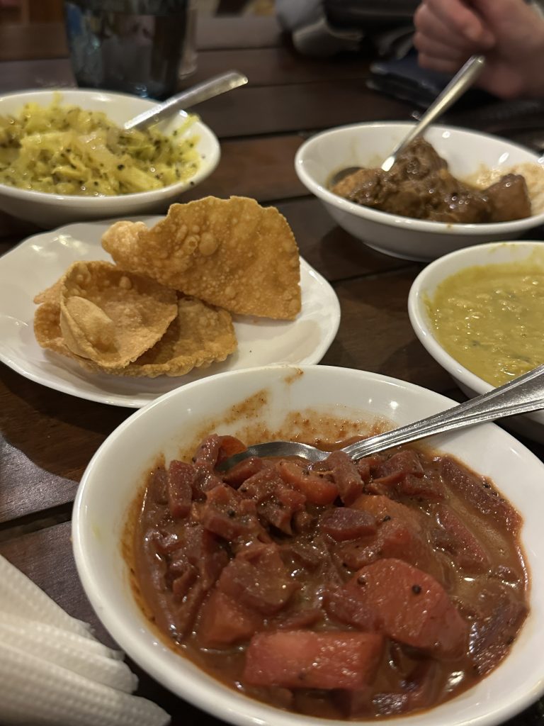 Das Dinner ist OK, wir sitzen draußen, der Buffettisch ist lang, der ausgewählte australische Rotwein schmeckt, sogar ein Sri Lankan Essen, die chicken noodles, laut Reiseleitung better known as „Kottu“, sind besser als erwartet. Bei der Dessertauswahl schlagen wir noch mehr zu, man ist einfach zu neugierig, wie die eine oder andere süße Speise schmecken könnte.