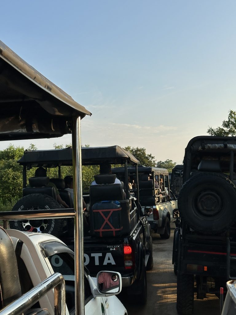 Um 5 Uhr stehen wir auf, um 5:30 Uhr sind wir vorne an der Rezeption und kurz darauf werden wir auch schon abgeholt. Obwohl auch andere die Morgensafari gebucht haben, sind wir in unserem Mahindrajeep …